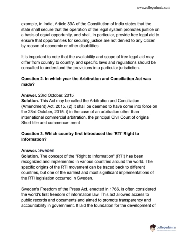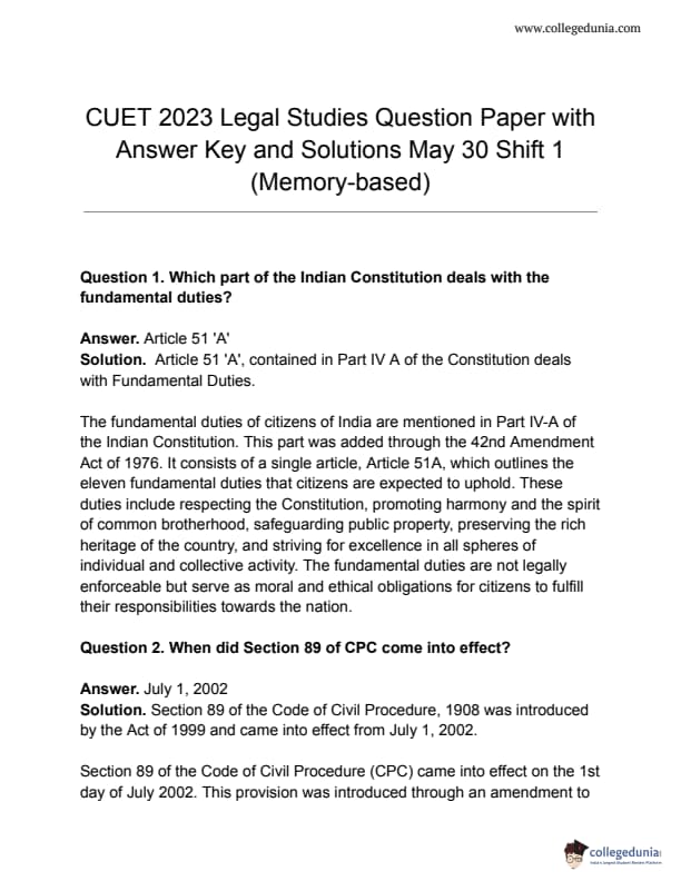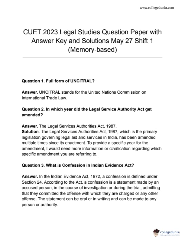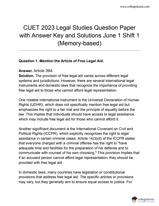 CUET 2023 Legal Studies Answer Key for all shifts is made available for download here. NTA to release CUET Answer Key 2023 PDF for Legal Studies soon on cuet.samarth.ac.in. Download CUET 2023 Legal Studies Question Paper PDF
