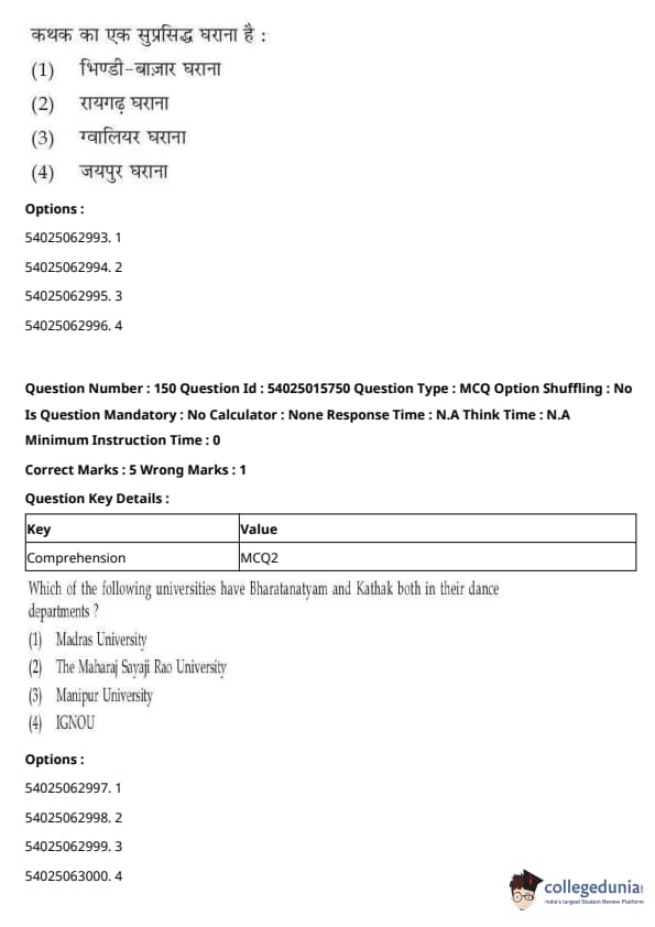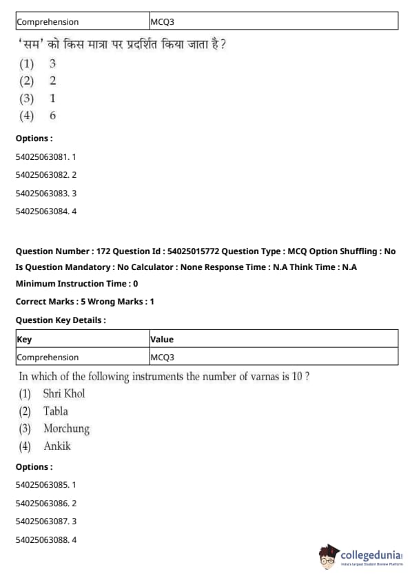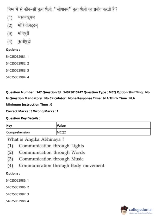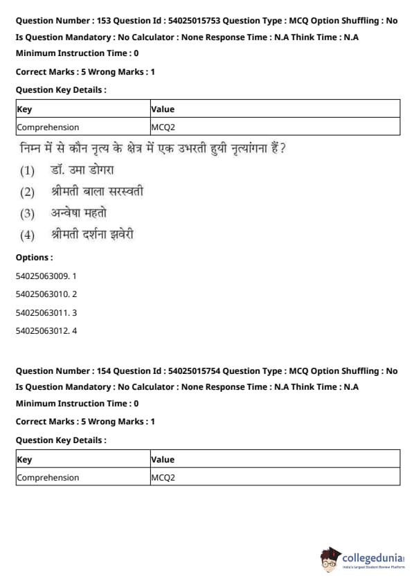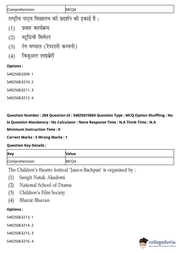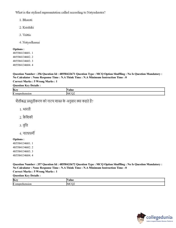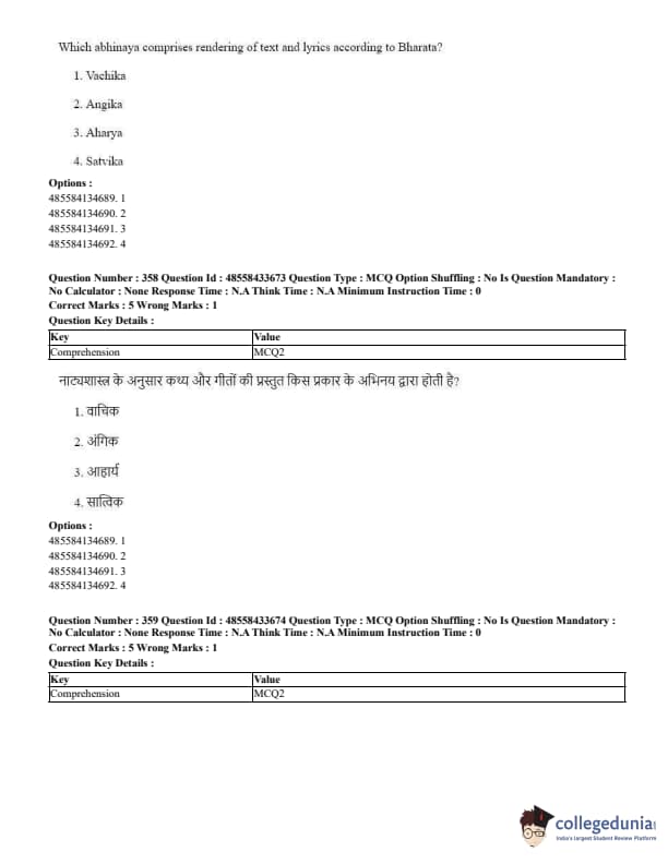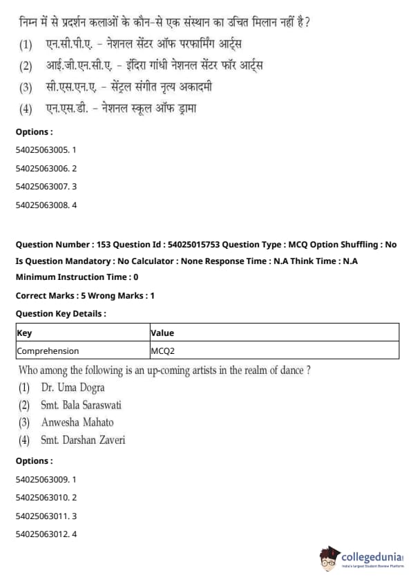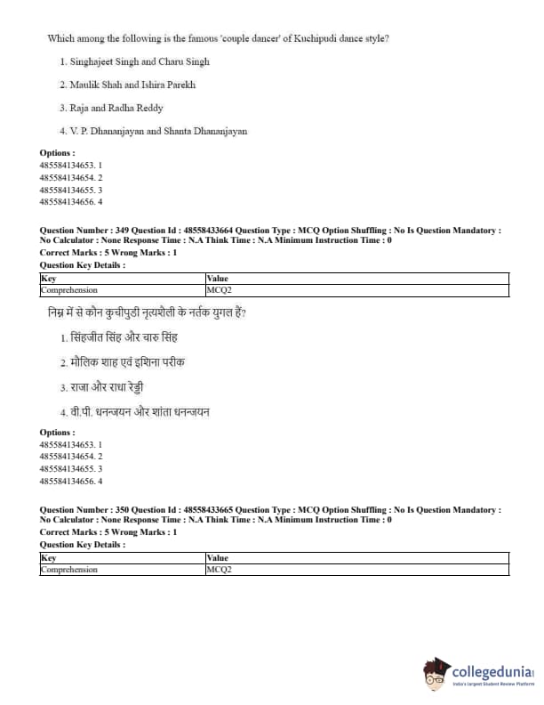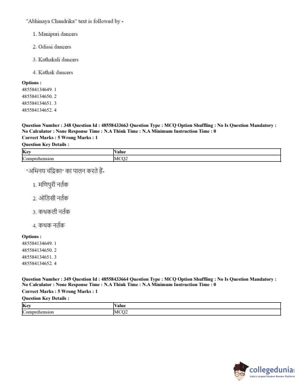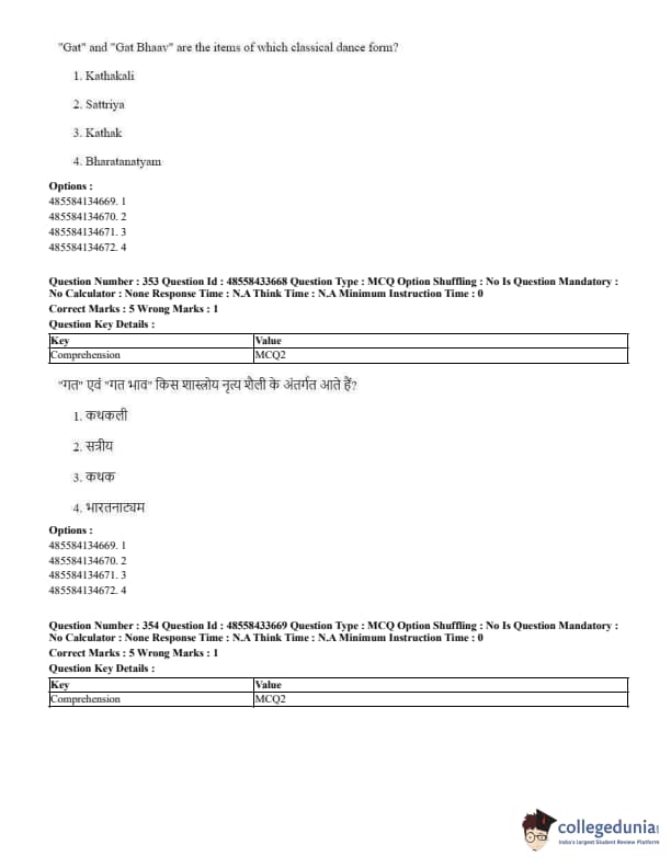 CUET Performing Arts Question Paper 2023 is based on objective-type questions (MCQs). Candidates get 45 minutes to solve 35/40 MCQs out of 45/50 in CUET 2023 question paper for Performing Arts.