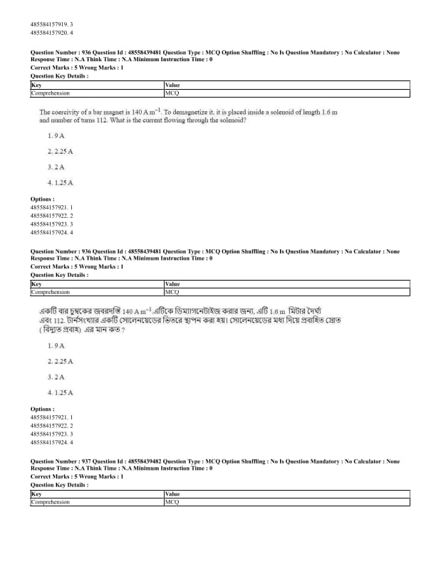 The coercivity of a bar magnet is 140 A m\(^{-1}\). To demagnetize it, it is placed inside a solenoid of length 1.6 m and number of turns 112. What is the current flowing through the solenoid?