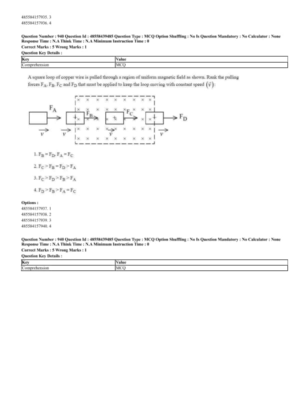 A square loop of copper wire is pulled through a region of uniform magnetic field as shown. Rank the pulling forces \(F_A\), \(F_B\), \(F_C\), and \(F_D\) that must be applied to keep the loop moving with constant speed (\(\vec{v}\)):