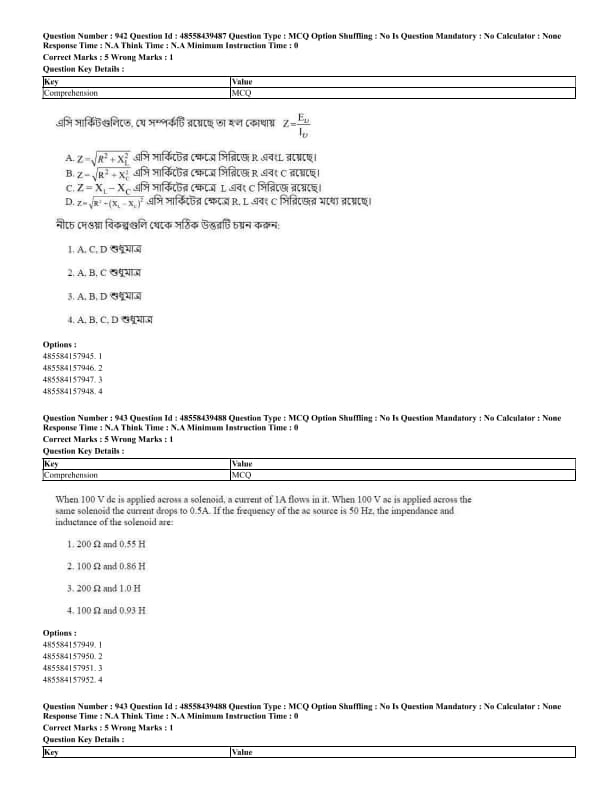 When 100 V dc is applied across a solenoid, a current of 1 A flows in it. When 100 V ac is applied across the same solenoid the current drops to 0.5 A. If the frequency of the ac source is 50 Hz, the impedance and inductance of the solenoid are:
