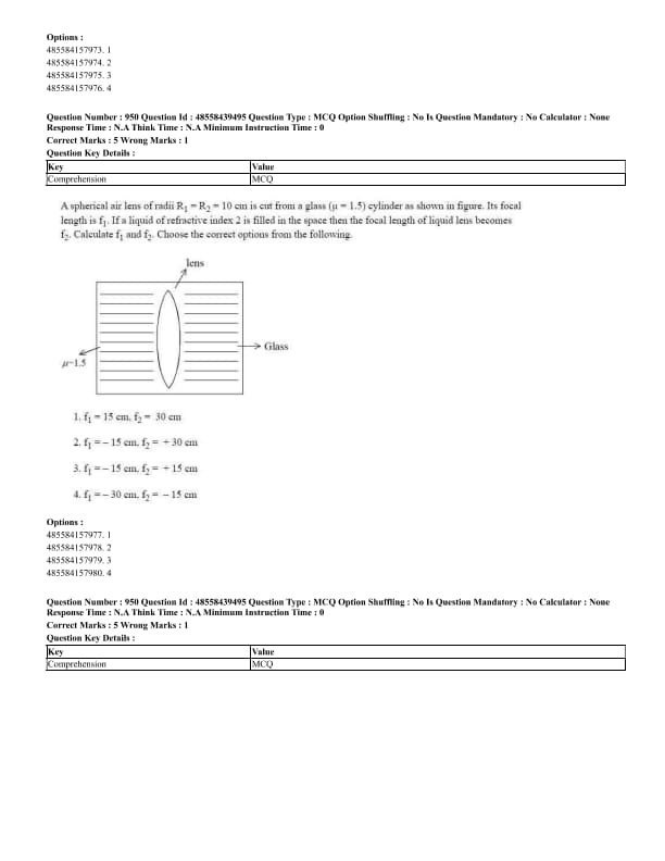 A spherical air lens of radii \( R_1 = R_2 = 10 \, cm \) is cut from a glass (\(\mu = 1.5\)) cylinder as shown in the figure. Its focal length is \( f_1 \). If a liquid of refractive index \( \mu_2 \) is filled in the space, then the focal length of the liquid lens becomes \( f_2 \). Calculate \( f_1 \) and \( f_2 \). Choose the correct options from the following.