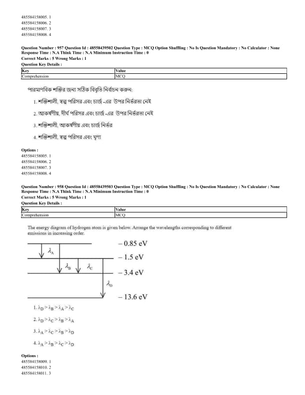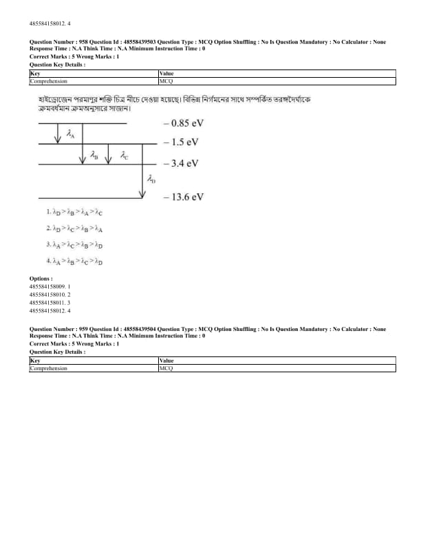 The energy diagram of a hydrogen atom is given below. Arrange the wavelengths corresponding to different emissions in increasing order.