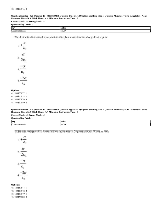 The electric field intensity due to an infinite thin plane sheet of surface charge density \(\sigma\) is: