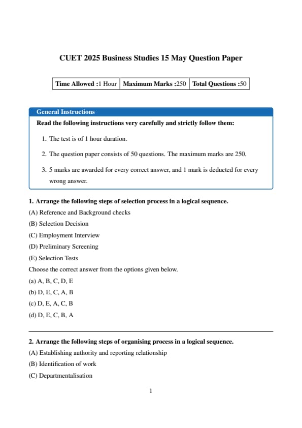 | CUET 2025 Business Studies Test Question Paper May 15 | Download PDF | Check Solutions |