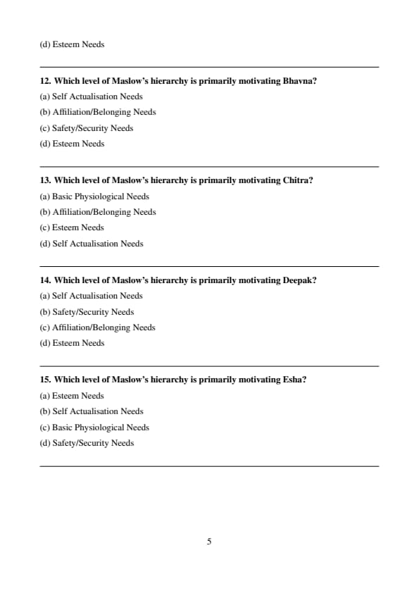 Esha’s motivation stems from her desire for personal growth, knowledge, and achievement. According to Maslow's hierarchy, Self-Actualisation represents the pinnacle of human motivation, where individuals seek to fulfill their potential, be creative, and engage in self-improvement. Unlike basic needs such as physiological or safety needs, self-actualization is focused on becoming the best version of oneself, pursuing goals that lead to personal fulfillment. Esha’s drive to reach her full potential is the defining characteristic of self-actualization. Quick Tip: Self-Actualization is the desire to become the best version of yourself through personal growth, creativity, and meaningful accomplishments. Focus on pushing boundaries.