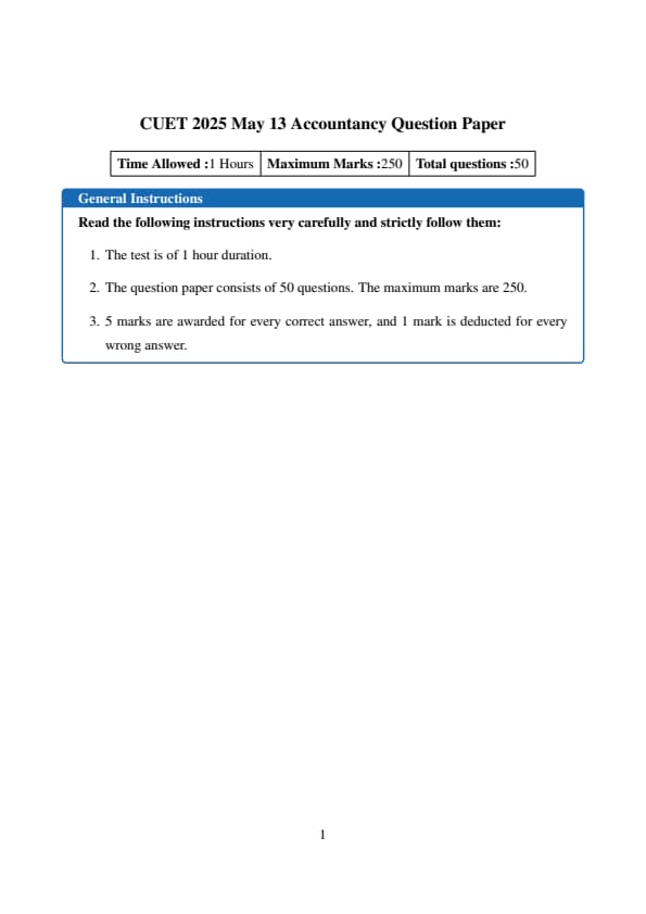 As per the exam pattern, the CUET Accountancy exam consists of 50 questions for 250 marks to be attempted in 60 minutes. 5 marks are awarded for each correct answer, and 1 mark is deducted for incorrect answer.