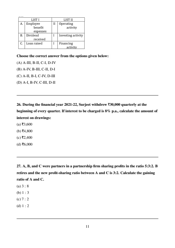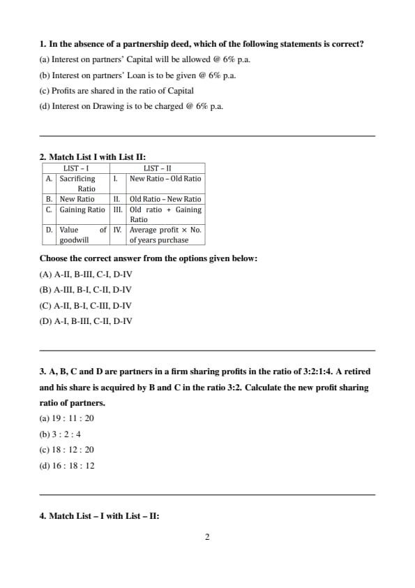 New ratio \(= \frac{1}{2} : \frac{1}{4} : \frac{1}{4} = 2 : 1 : 1\). Quick Tip: When a new partner is admitted by taking equal shares from existing partners, subtract the shares equally and find the new ratio by expressing all shares as fractions of the total.