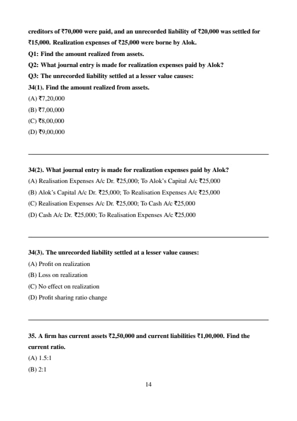 Assets worth Rs.9,00,000 realized at 80%. \[ Amount realized = 9,00,000 \times 80% = 7,20,000 \] Quick Tip: Realized amount = Asset value × Realization percentage.