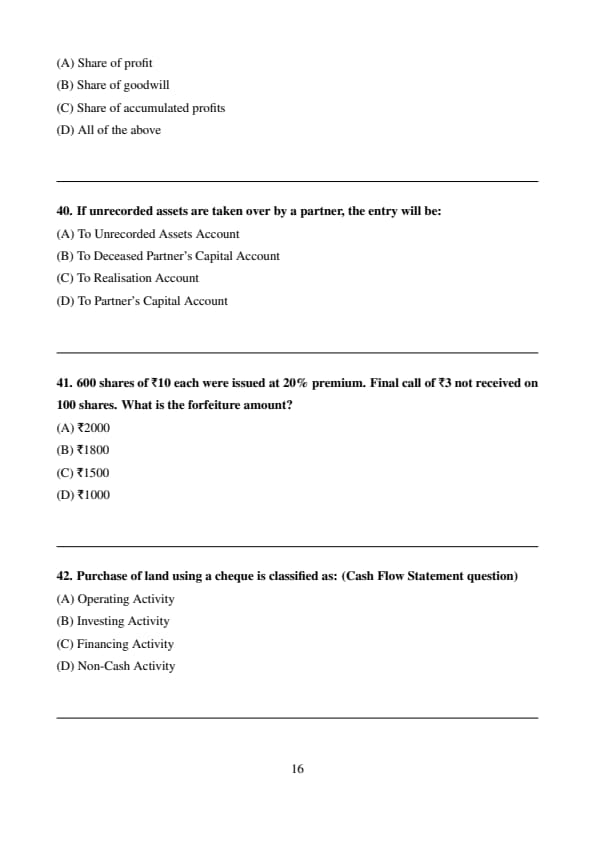 Thus, the new profit-sharing ratio is 16:4:5. Quick Tip: When a new partner is admitted, the existing partners' shares are diluted to accommodate the new partner’s share. The shares are adjusted based on the existing profit-sharing ratio.
