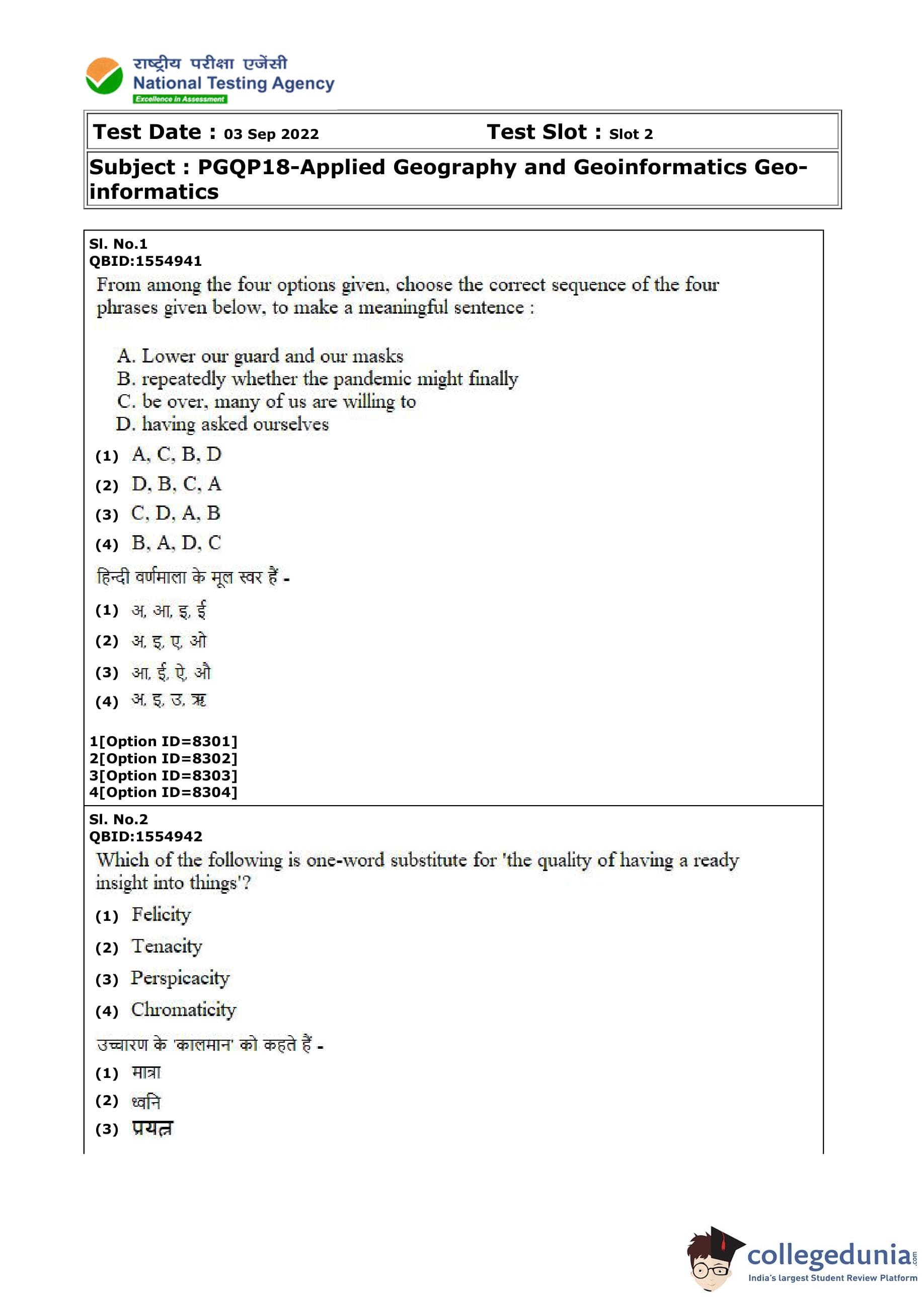 CUET PG Applied Geography and Geoinformatics Question Paper 2022 is available for download. CUET PG 2022 Applied Geography and Geoinformatics paper was conducted by National Testing Agency (NTA) on September 3, 2022 in Shift 2. The question paper comprised a total of 100 questions.