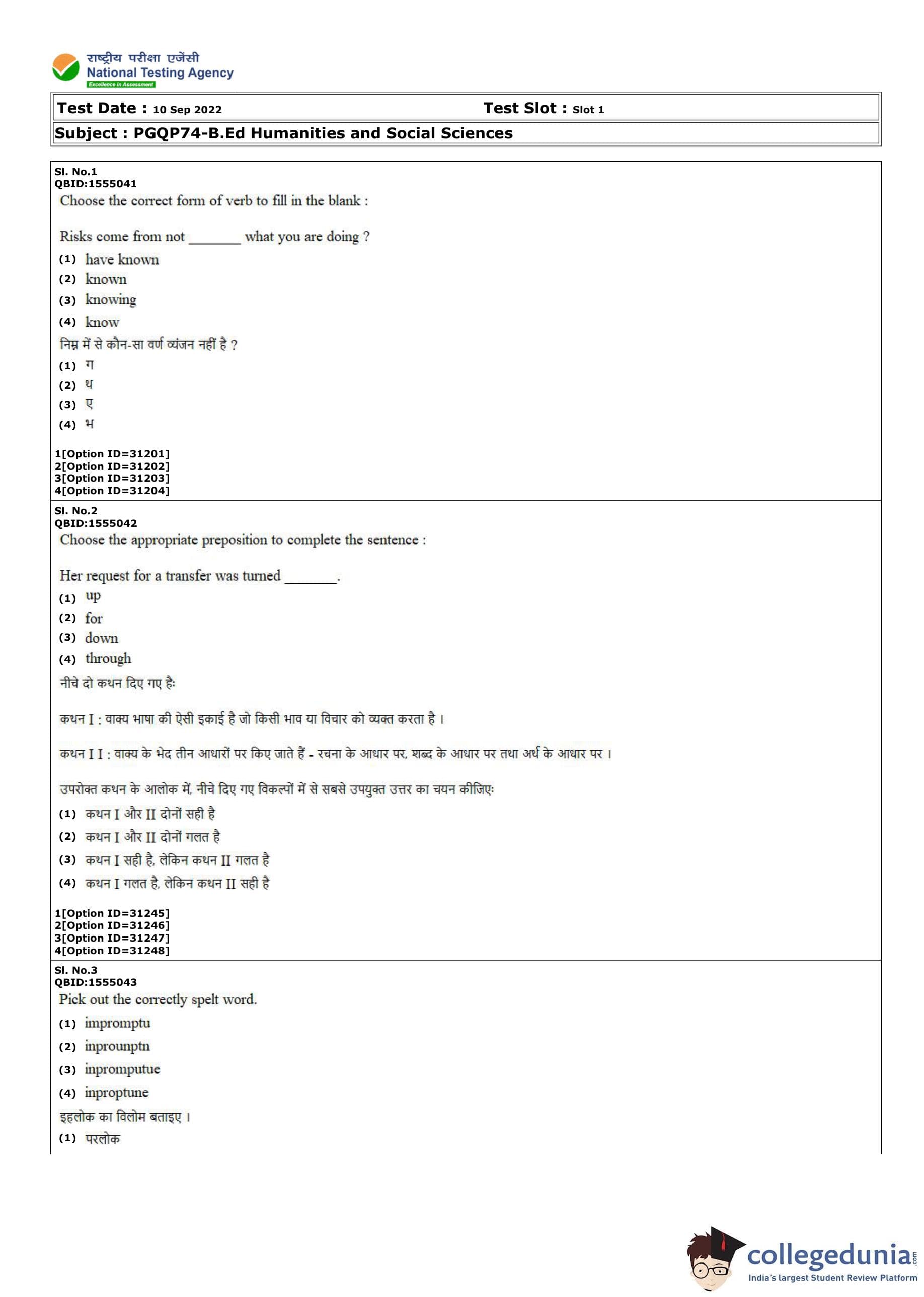 CUET PG B.Ed Humanities and Social Sciences Question Paper 2022 is available for download. CUET PG 2022 B.Ed Humanities and Social Sciences paper was conducted by National Testing Agency (NTA) on September 10, 2022 in Shift 1. The question paper comprised a total of 100 questions.