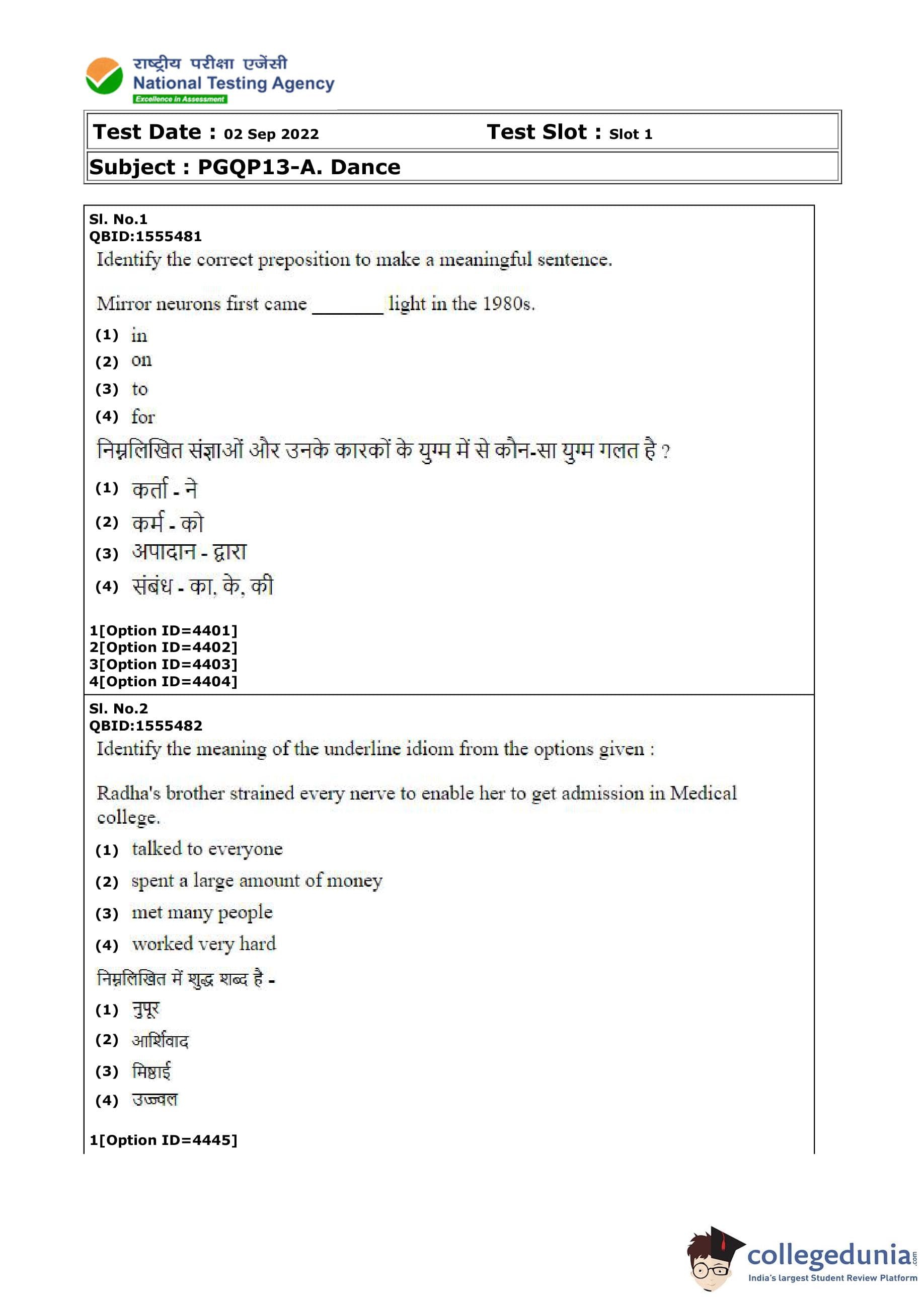 CUET PG Dance Question Paper 2022 is available for download. CUET PG 2022 Dance paper was conducted by National Testing Agency (NTA) on September 2, 2022 in Shift 1. The question paper comprised a total of 100 questions.