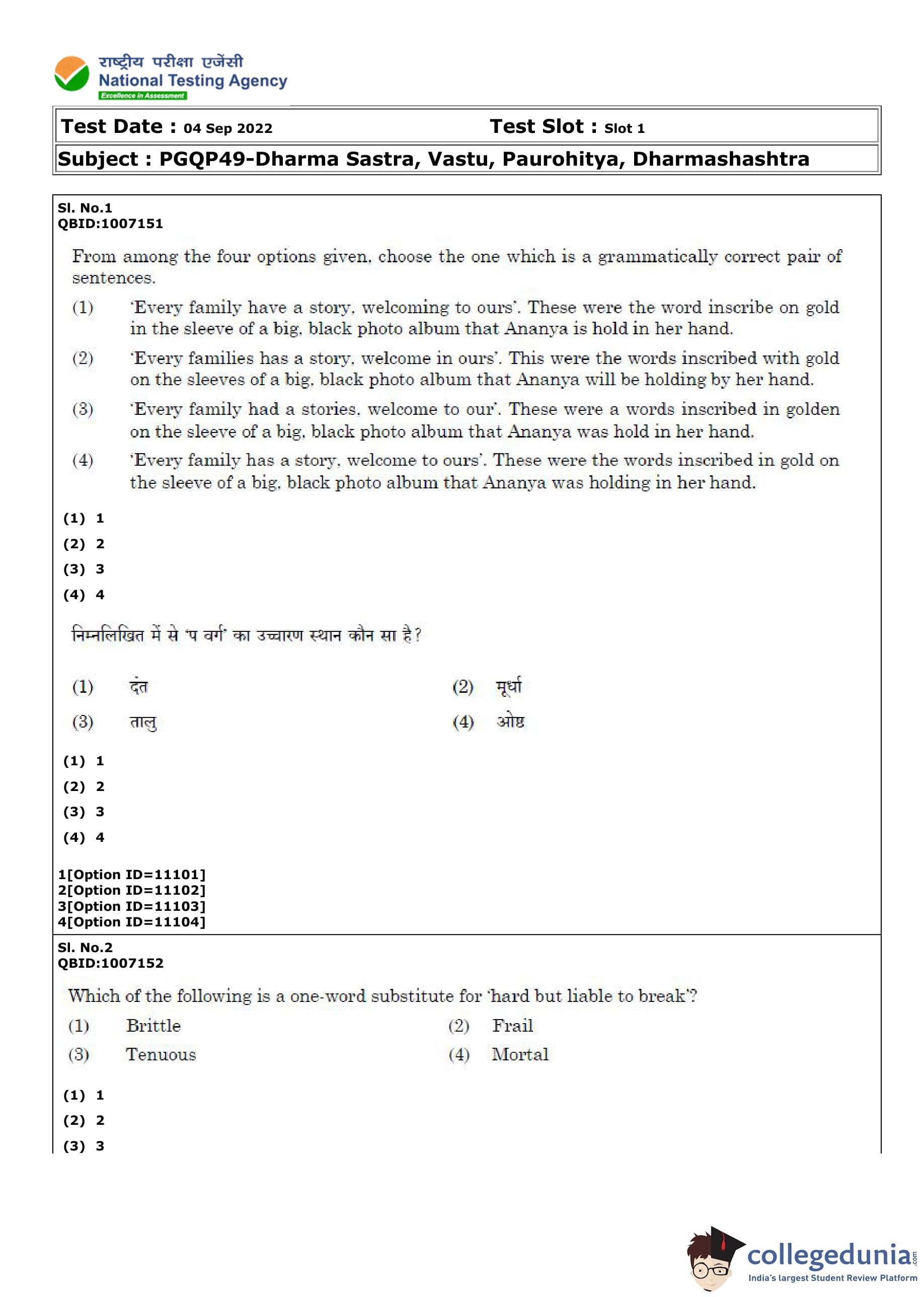 CUET PG Dharma Sastra, Vastu, Paurohitya, Dharmashashtra Question Paper 2022 is available for download. CUET PG 2022 Dharma Sastra, Vastu, Paurohitya, Dharmashashtra paper was conducted by National Testing Agency (NTA) on September 4, 2022 in Shift 1. The question paper comprised a total of 100 questions.