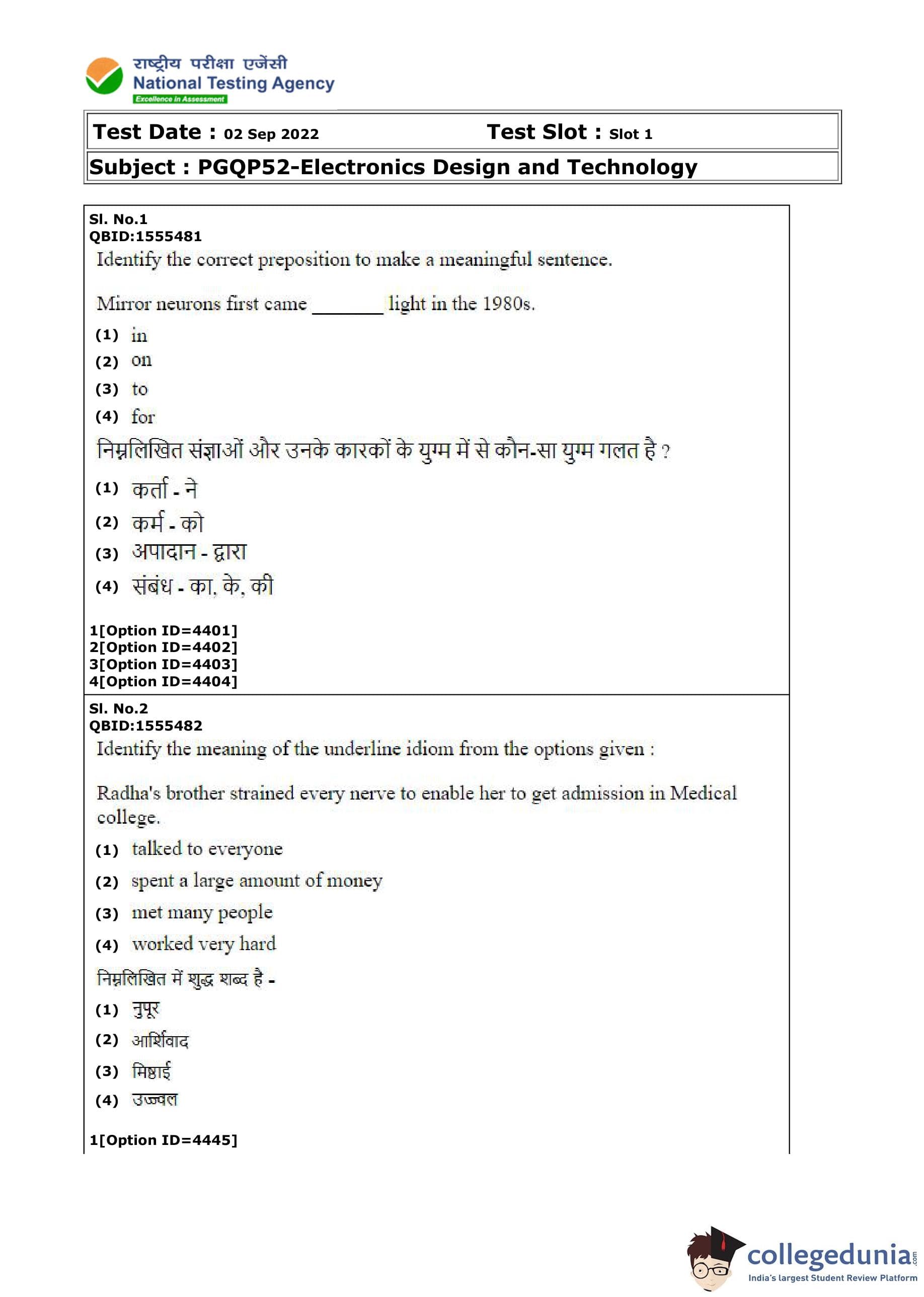 CUET PG Electronics Design and Technology Question Paper 2022 is available for download. CUET PG 2022 Electronics Design and Technology paper was conducted by National Testing Agency (NTA) on September 2, 2022 in Shift 1. The question paper comprised a total of 100 questions.