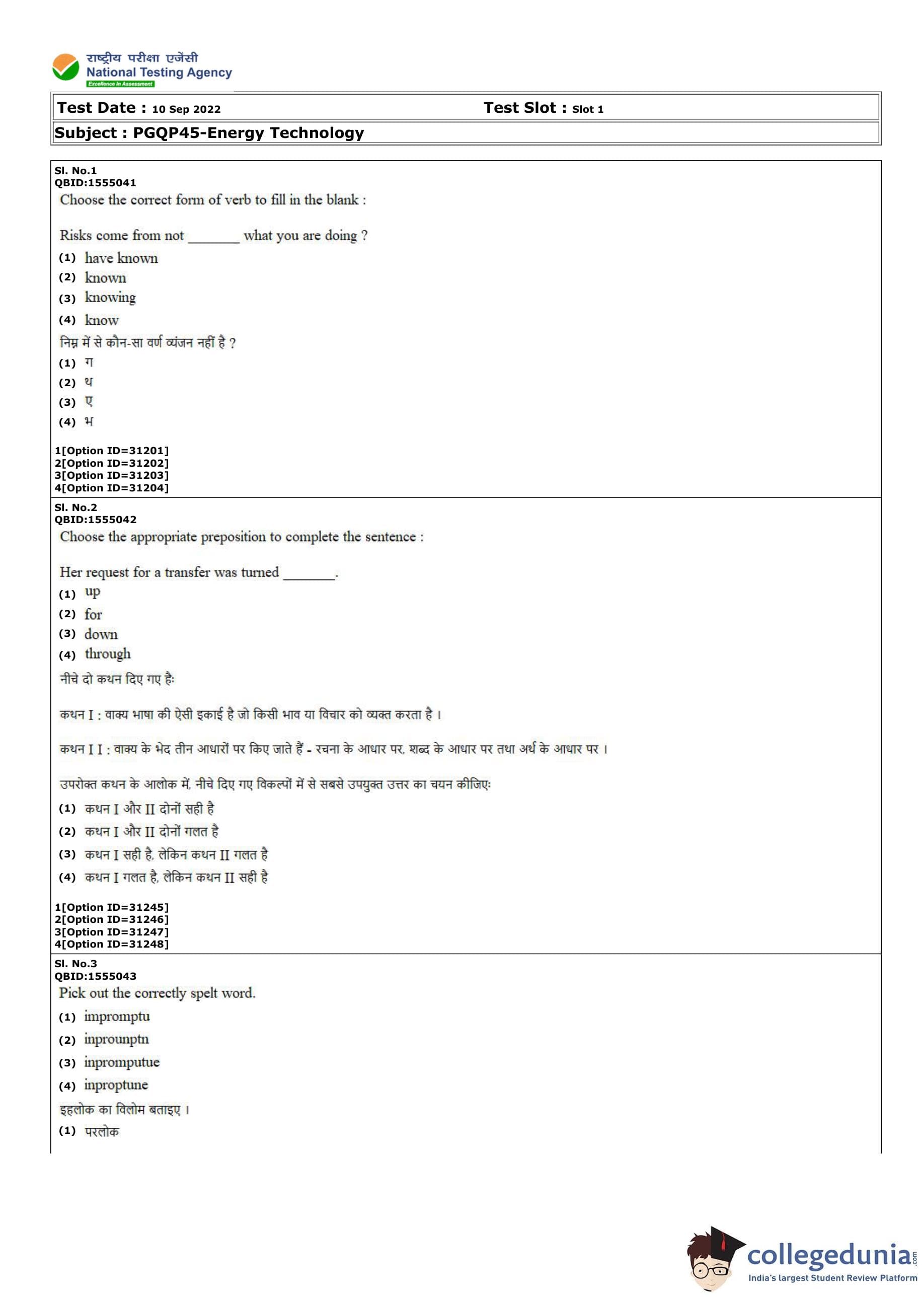 CUET PG Energy Technology Question Paper 2022 is available for download. CUET PG 2022 Energy Technology paper was conducted by National Testing Agency (NTA) on September 10, 2022 in Shift 1. The question paper comprised a total of 100 questions.