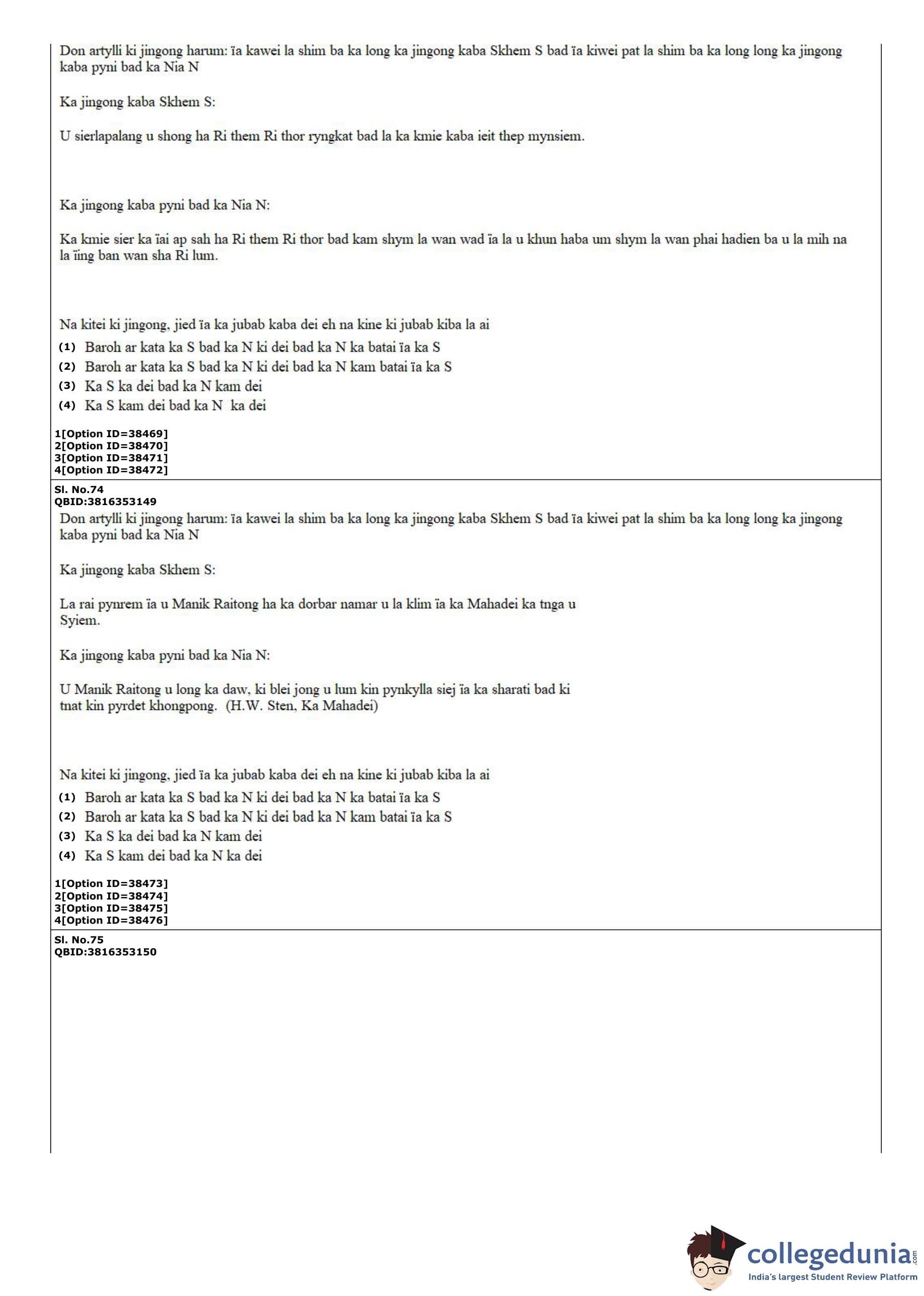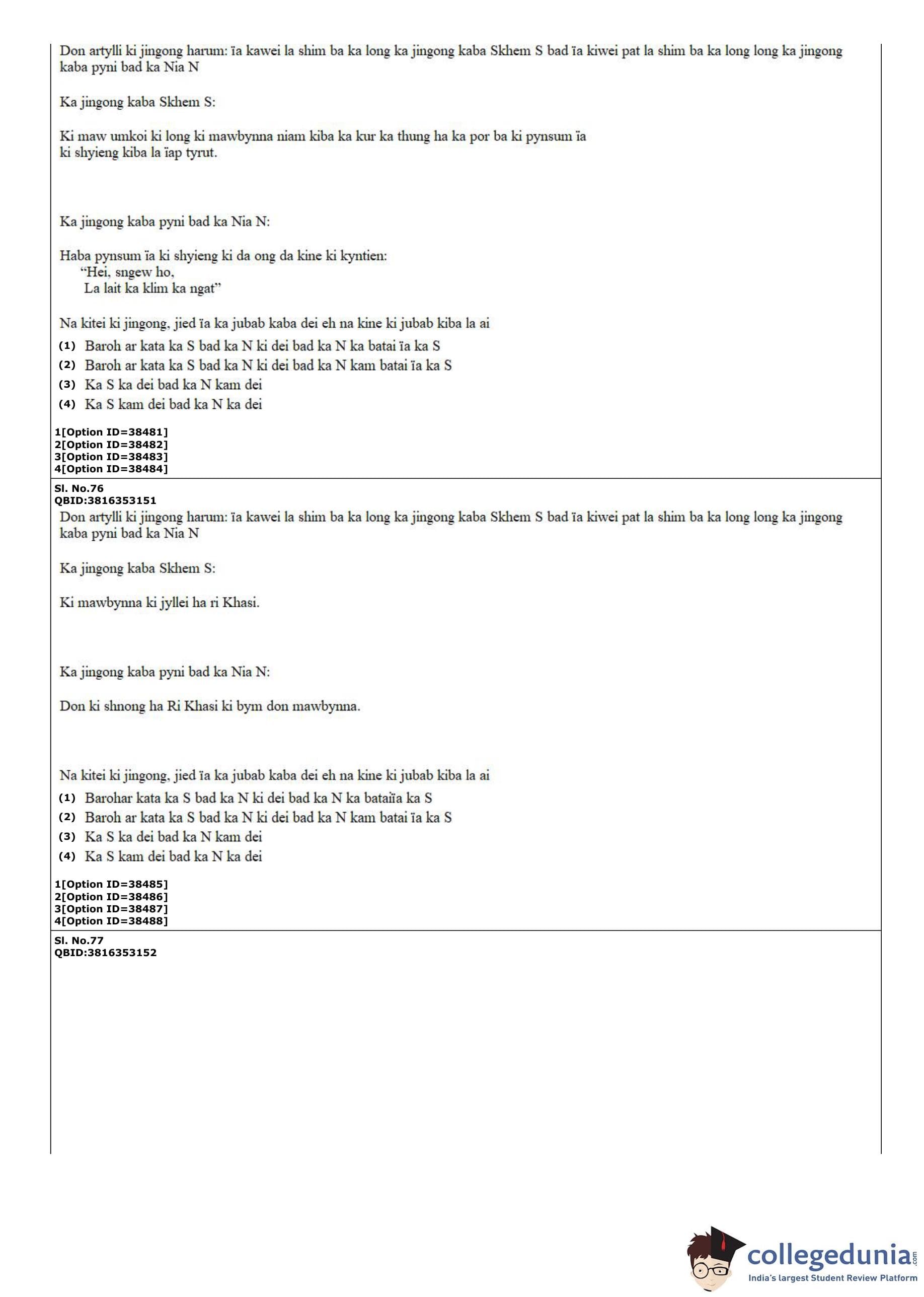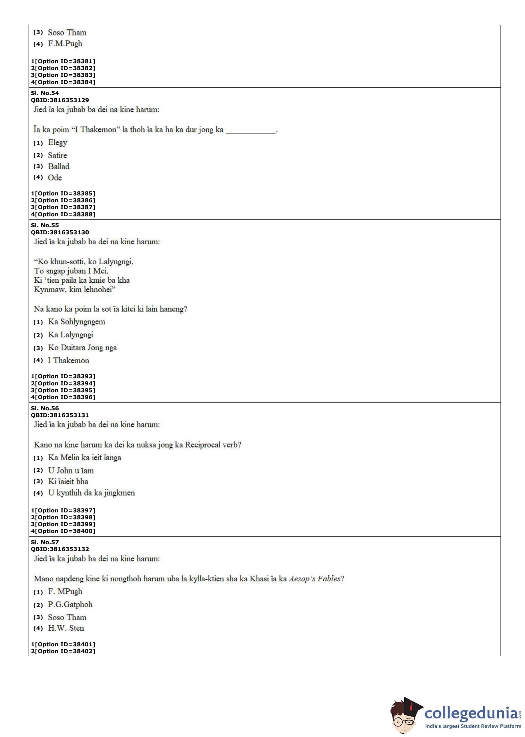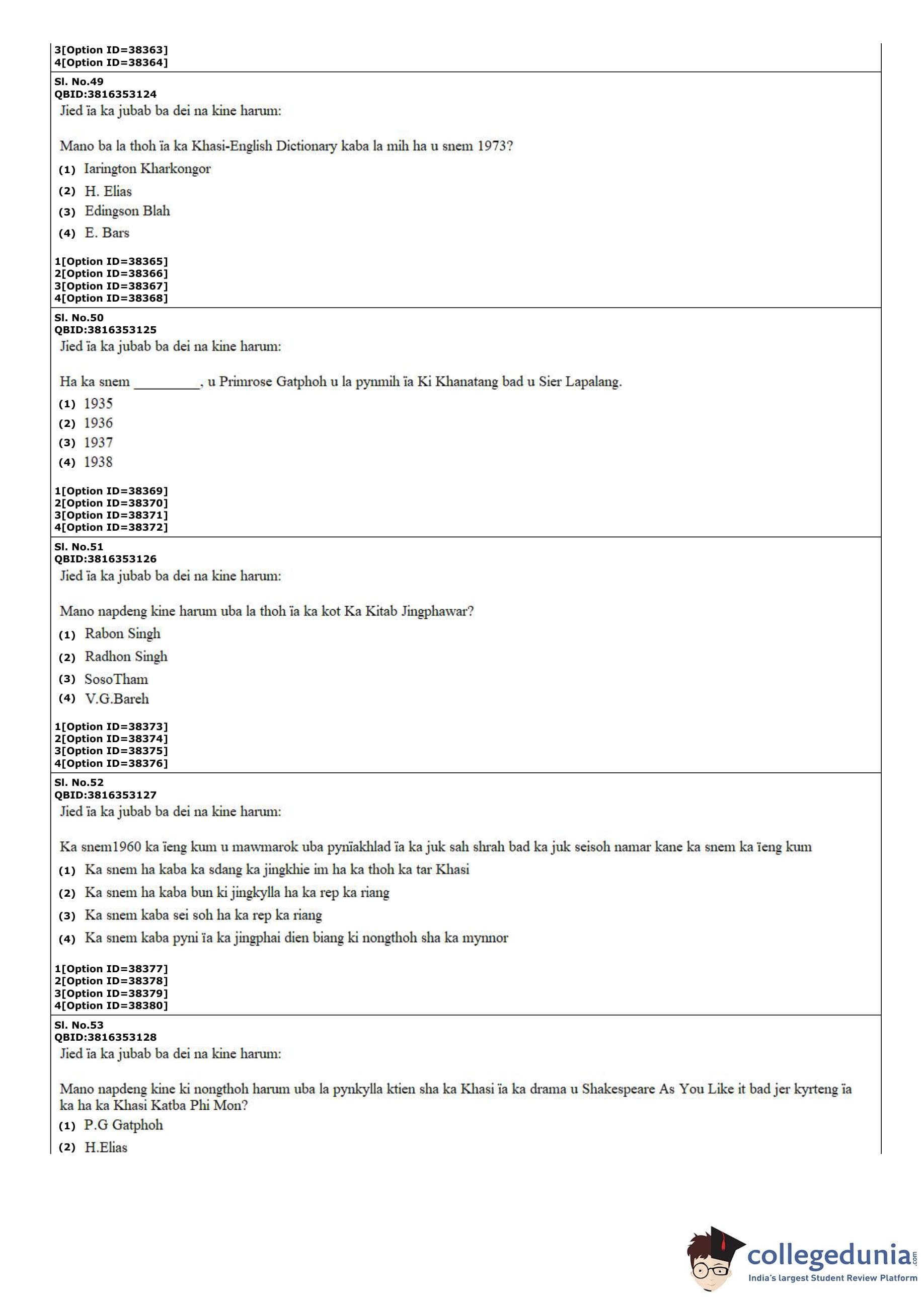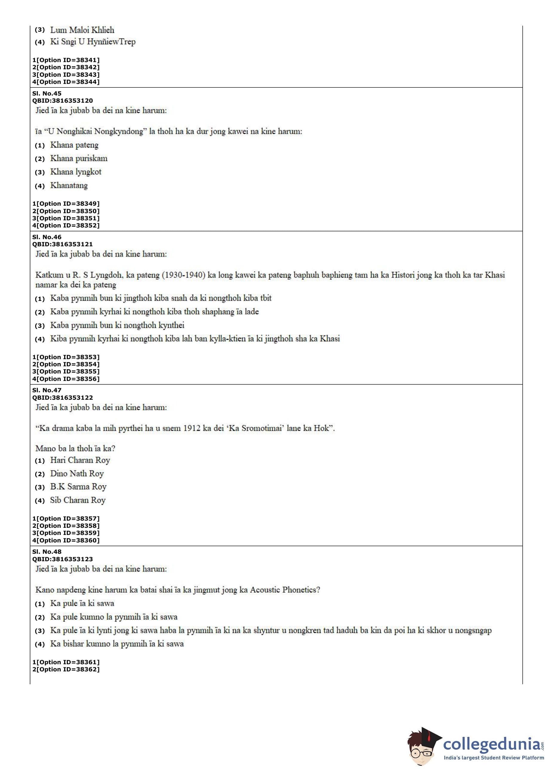 CUET PG 2022 Khasi Question Paper with Answer Key PDF