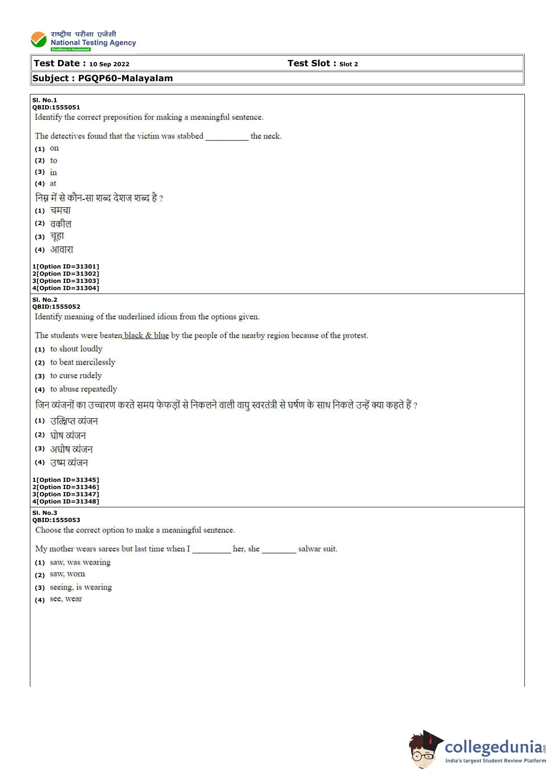 CUET PG Malayalam Question Paper 2022 is available for download. CUET PG 2022 Malayalam paper was conducted by National Testing Agency (NTA) on September 10, 2022 in Shift 2. The question paper comprised a total of 100 questions.