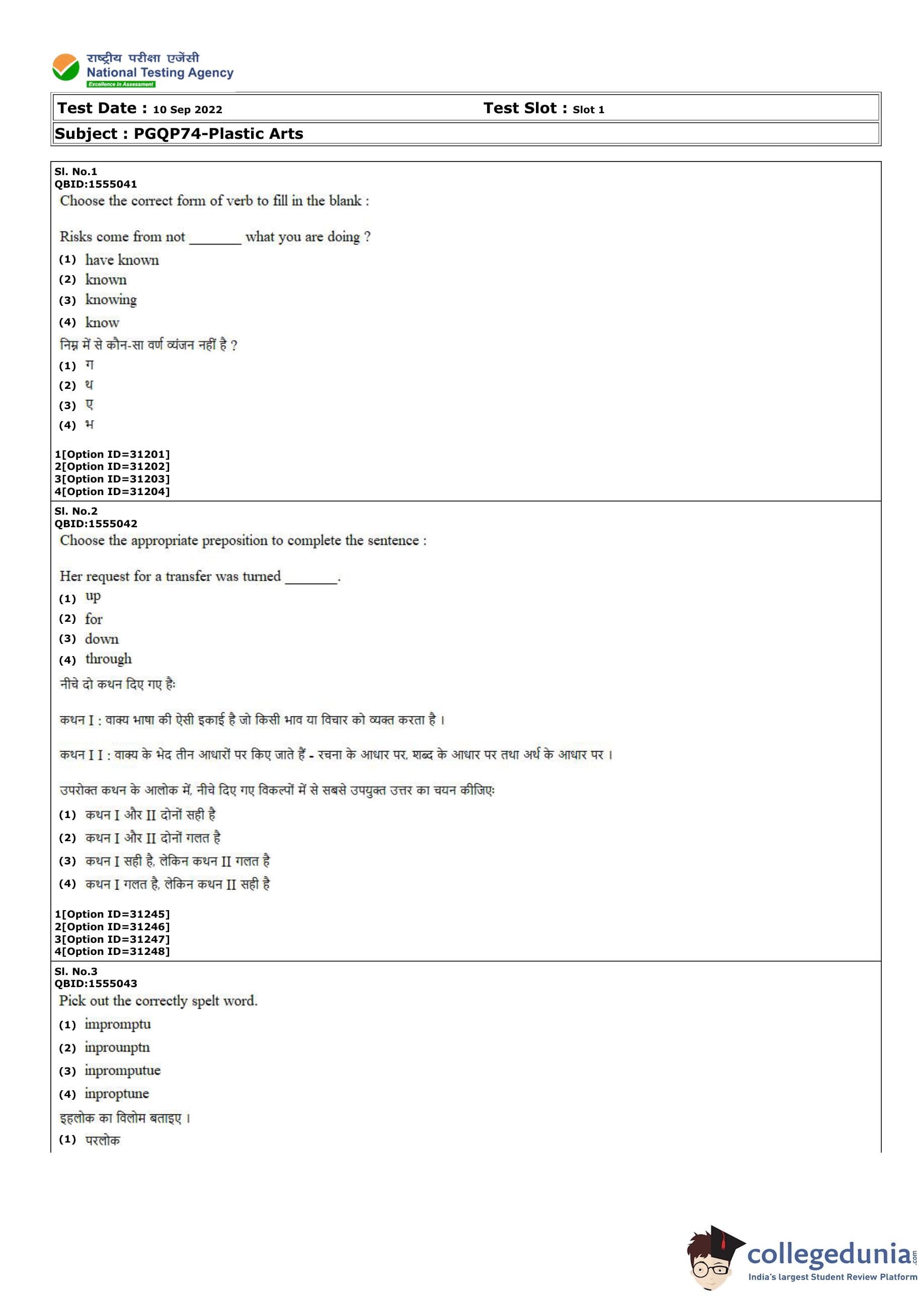 CUET PG Plastic Arts Question Paper 2022 is available for download. CUET PG 2022 Plastic Arts paper was conducted by National Testing Agency (NTA) on September 10, 2022 in Shift 1. The question paper comprised a total of 100 questions.