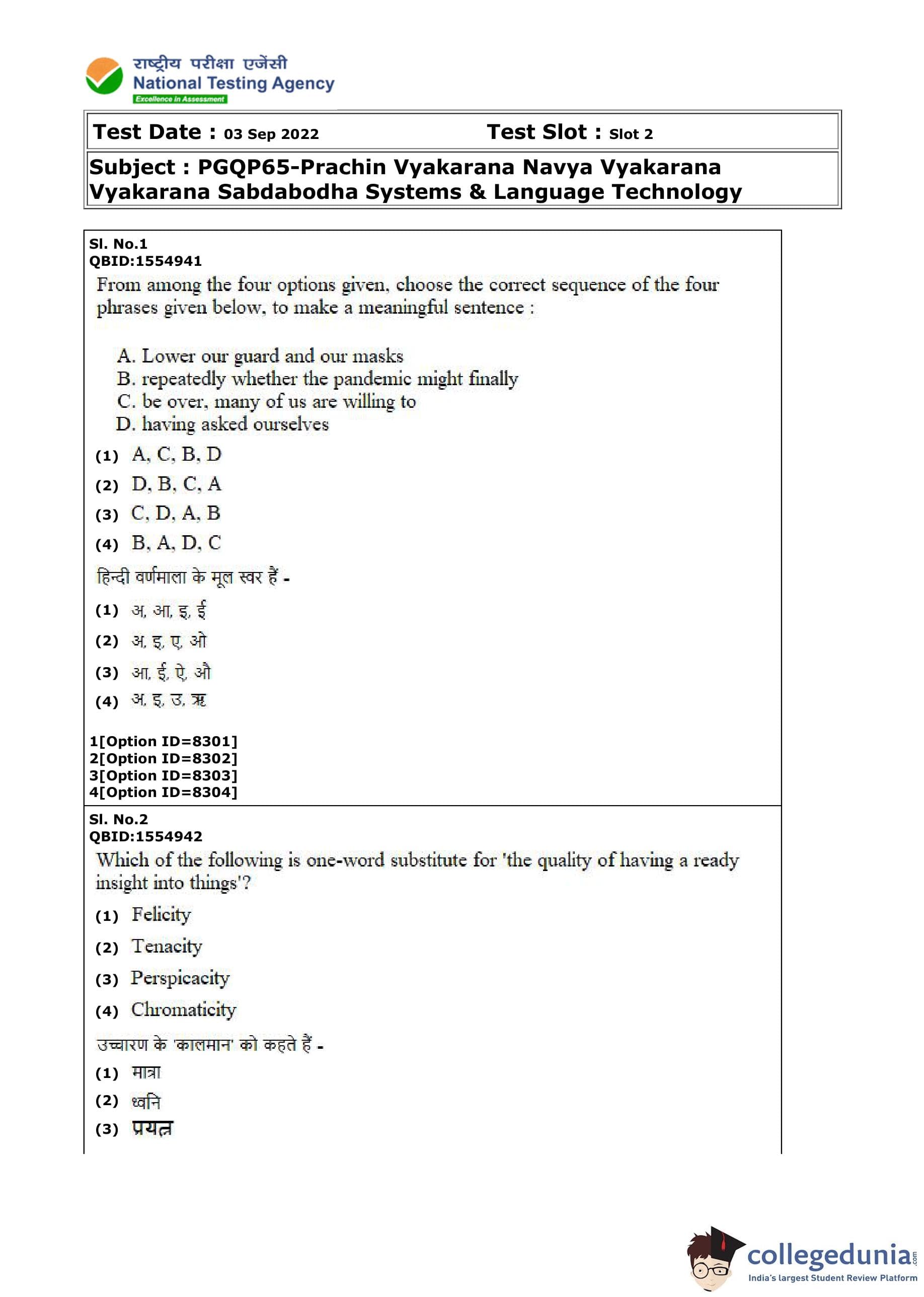 CUET PG Prachin Vyakarana Question Paper 2022 is available for download. CUET PG 2022 Prachin Vyakarana paper was conducted by National Testing Agency (NTA) on September 3, 2022 in Shift 2. The question paper comprised a total of 100 questions.