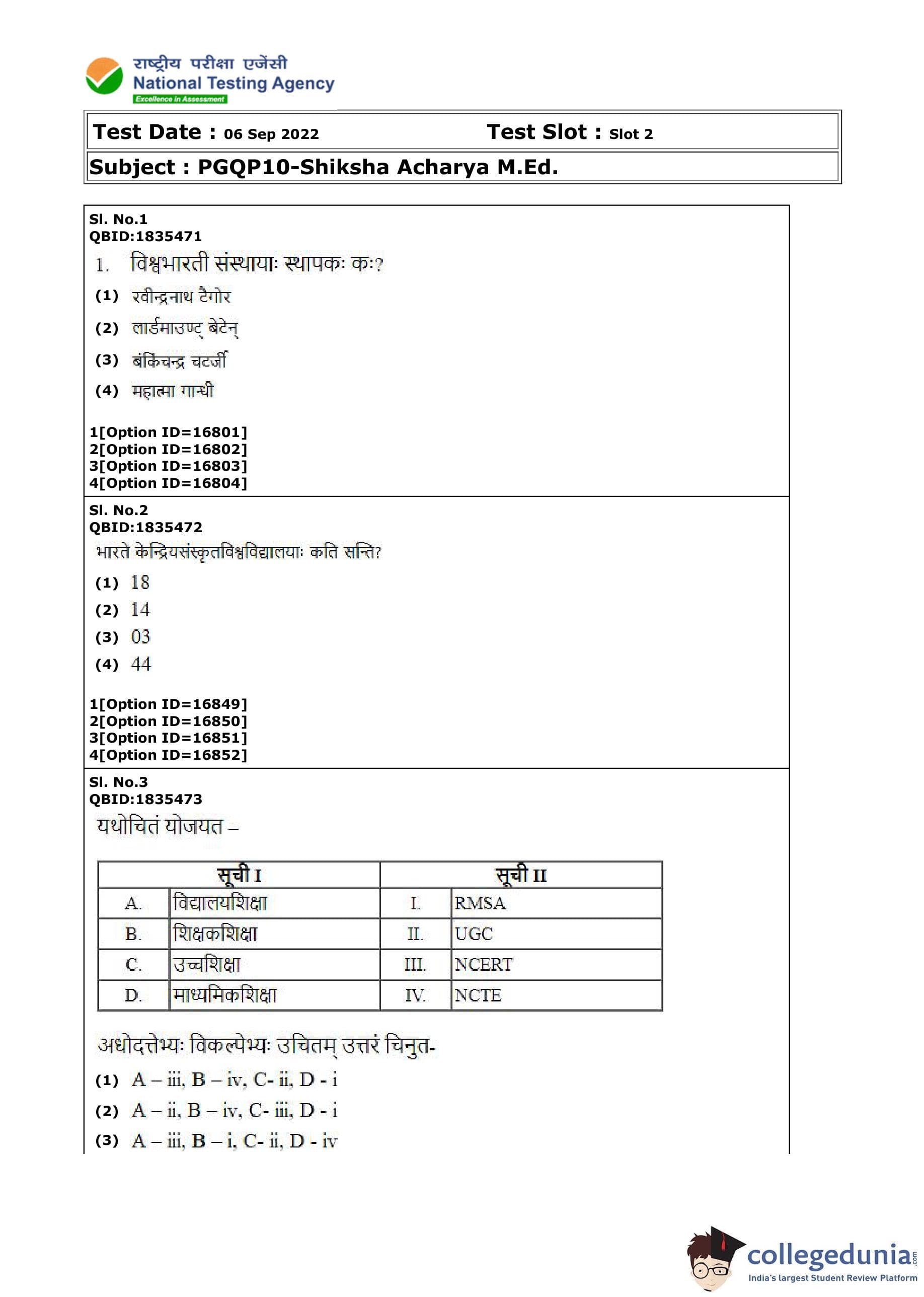 CUET PG Shiksha Acharya M.Ed Question Paper 2022 is available for download. CUET PG 2022 Shiksha Acharya M.Ed paper was conducted by National Testing Agency (NTA) on September 6, 2022 in Shift 2. The question paper comprised a total of 100 questions.