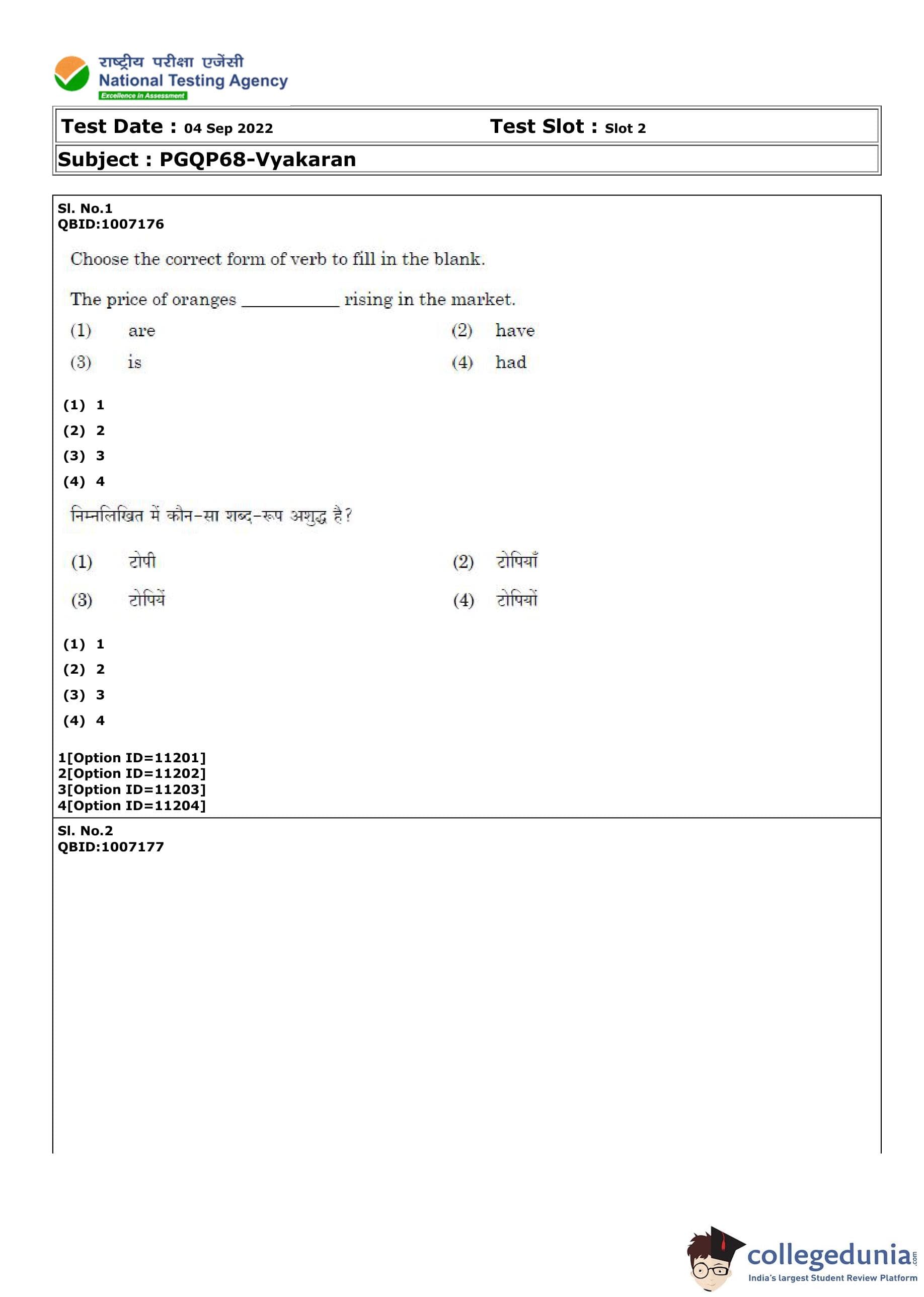 CUET PG Vyakaran Question Paper 2022 is available for download. CUET PG 2022 Vyakaran paper was conducted by National Testing Agency (NTA) on September 4, 2022 in Shift 2. The question paper comprised a total of 100 questions.