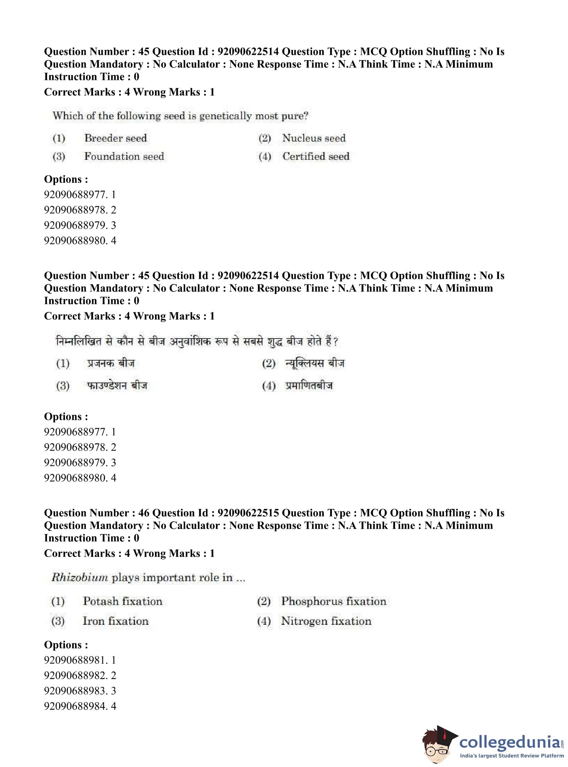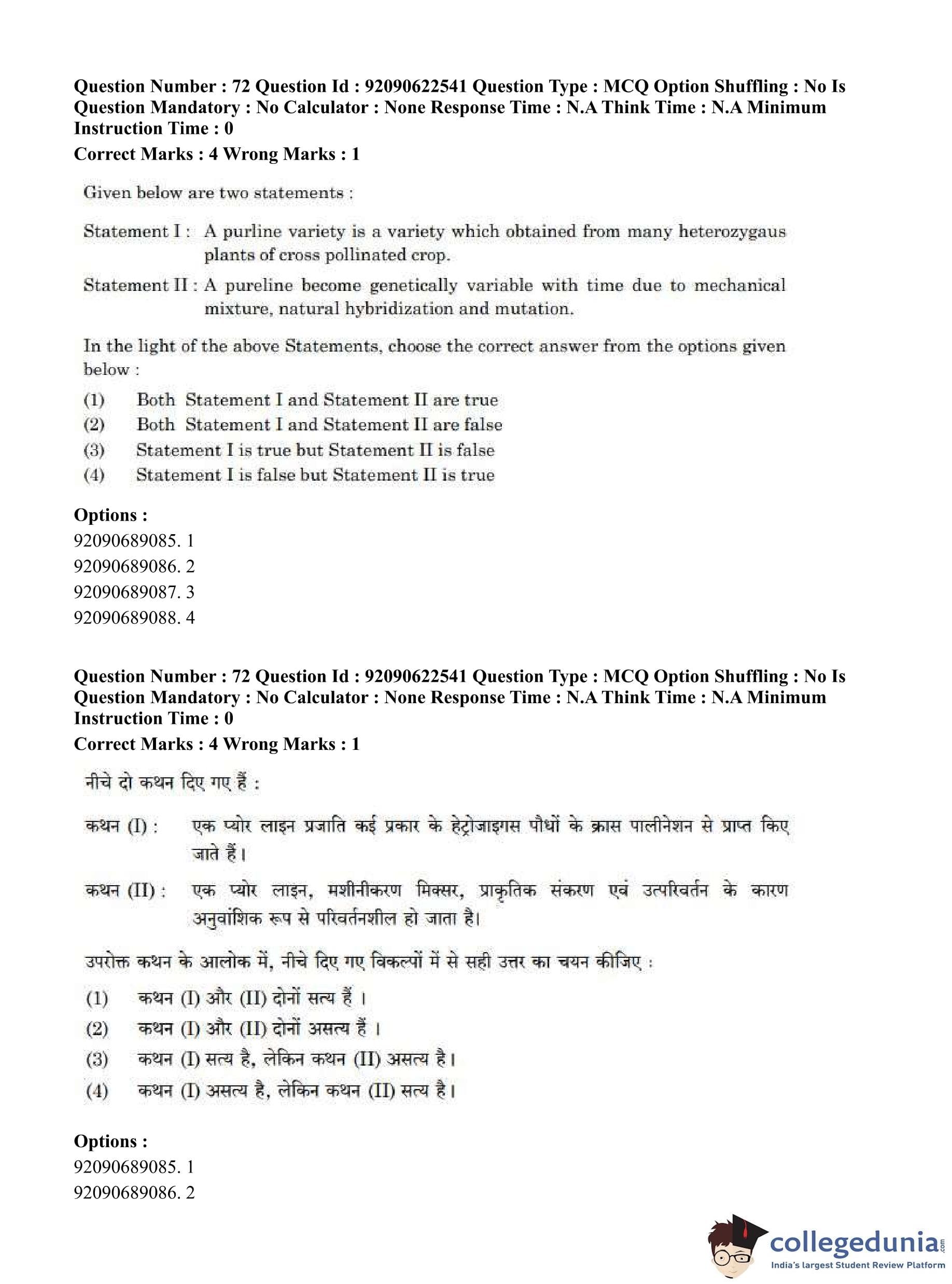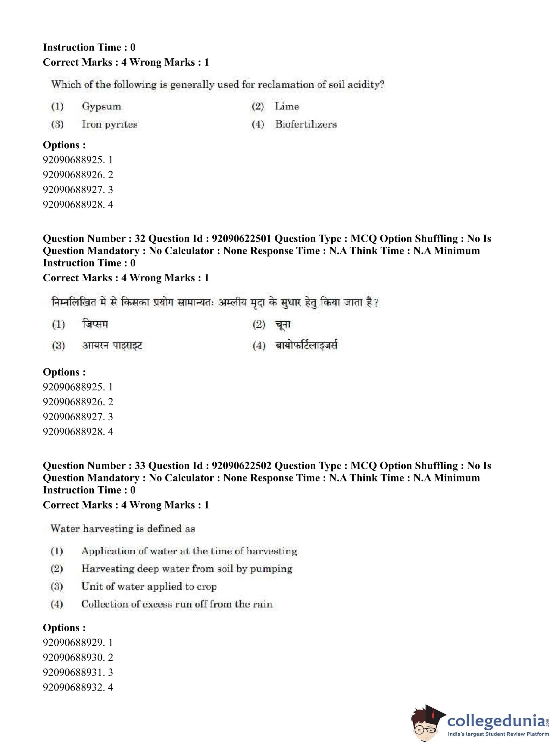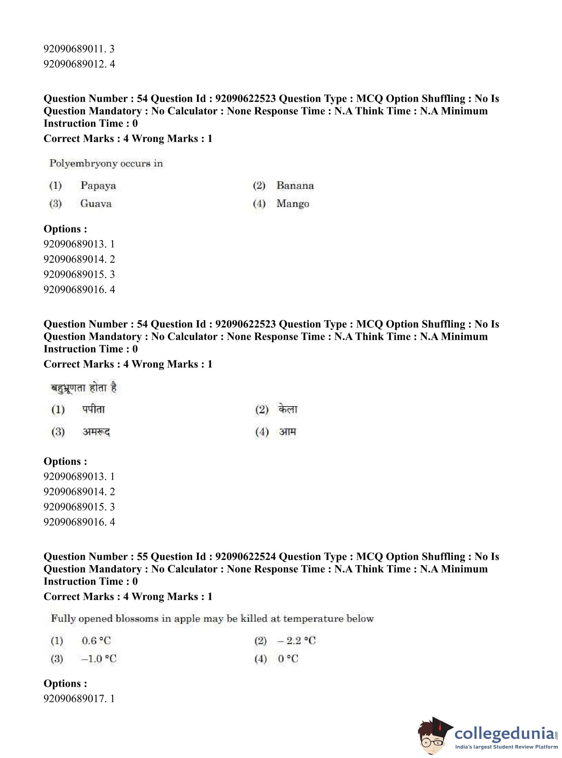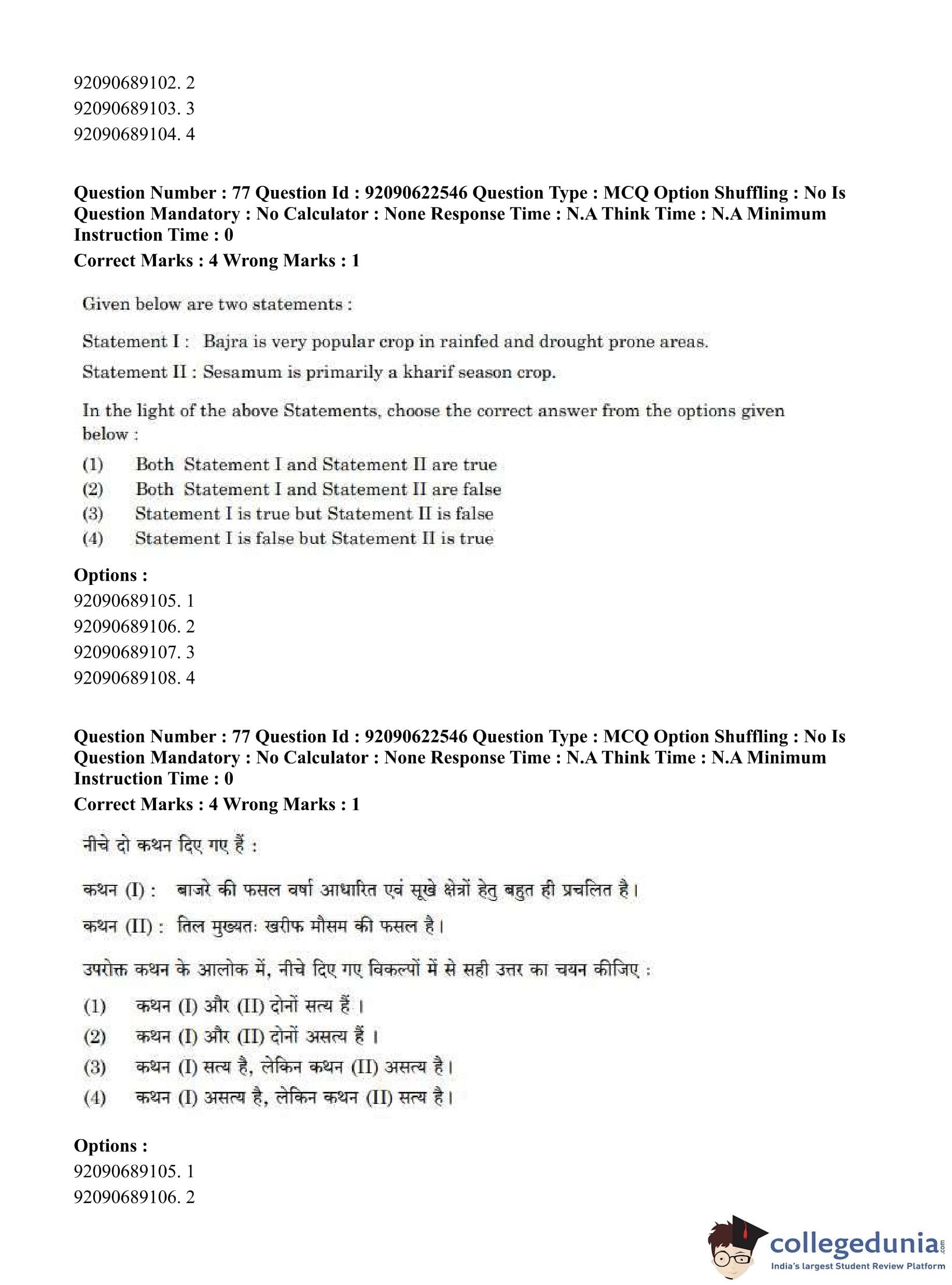 CUET PG 2023 Agricultural Science Question Paper in Hindi (June 24 - Shift 2)