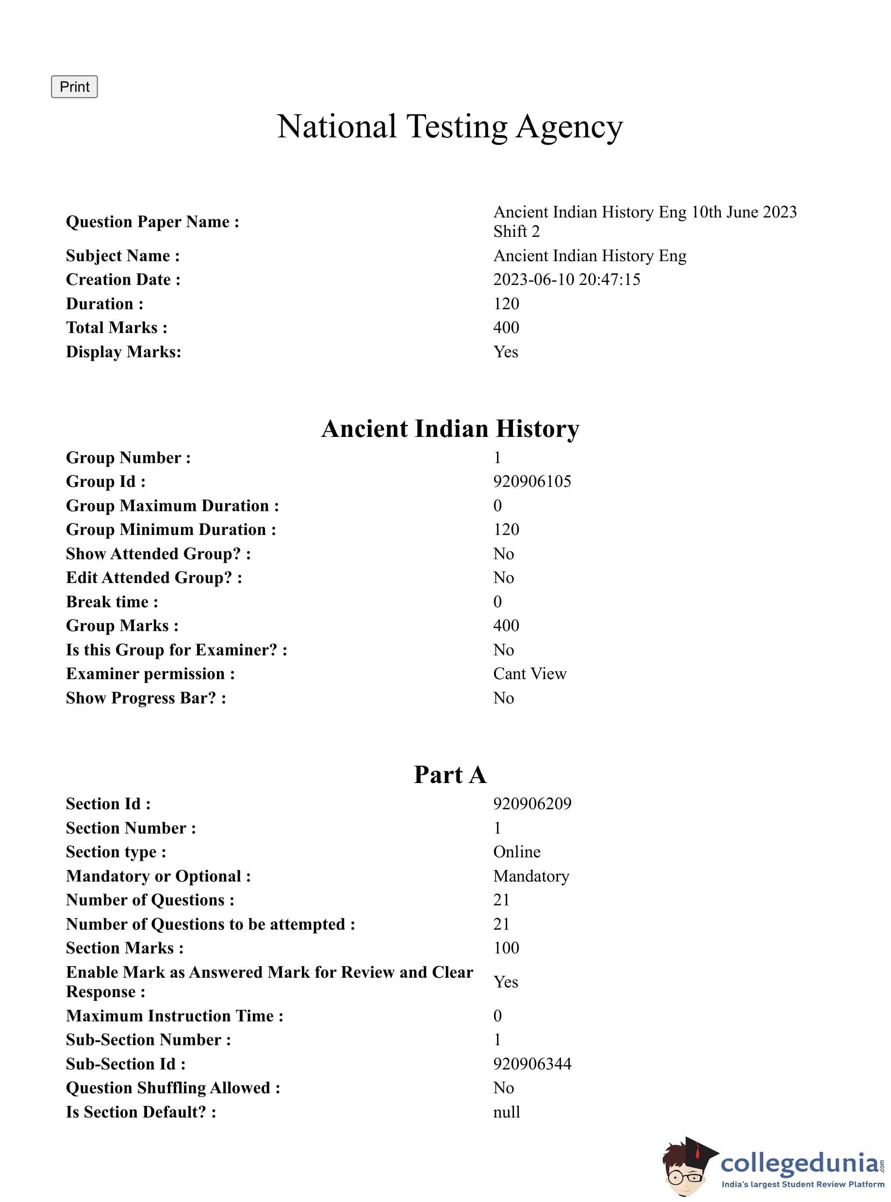 CUET PG 2023 Ancient Indian History Question Paper with Answer Key PDF in English is available for download here. The exam was conducted by National Testing Agency (NTA) on June 10, 2023 in Shift 2. The question paper comprised a total of 100 questions divided into 2 sections.