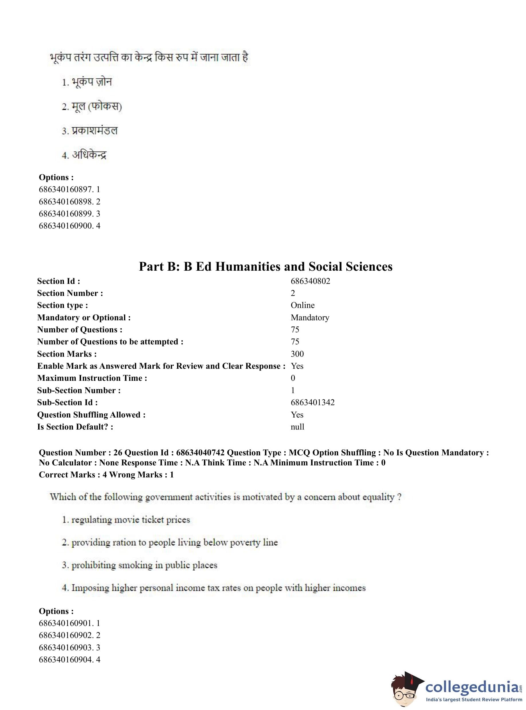 CUET PG 2023 B.Ed. Humanities and Social Sciences Question Paper with Answer Key PDF in Hindi is available for download here. The exam was conducted by National Testing Agency (NTA) on June 30, 2023 in Shift 3. The question paper comprised a total of 100 questions divided into 2 sections.