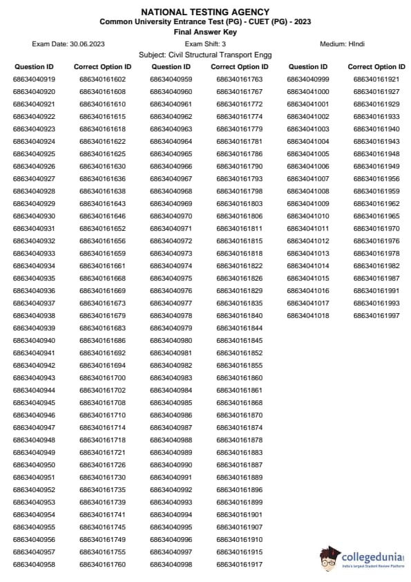 | CUET PG Civil, Structural and Transport Engg Question Paper 2023 PDF | CUET PG Civil, Structural and Transport Engg Answer Key 2023 PDF |