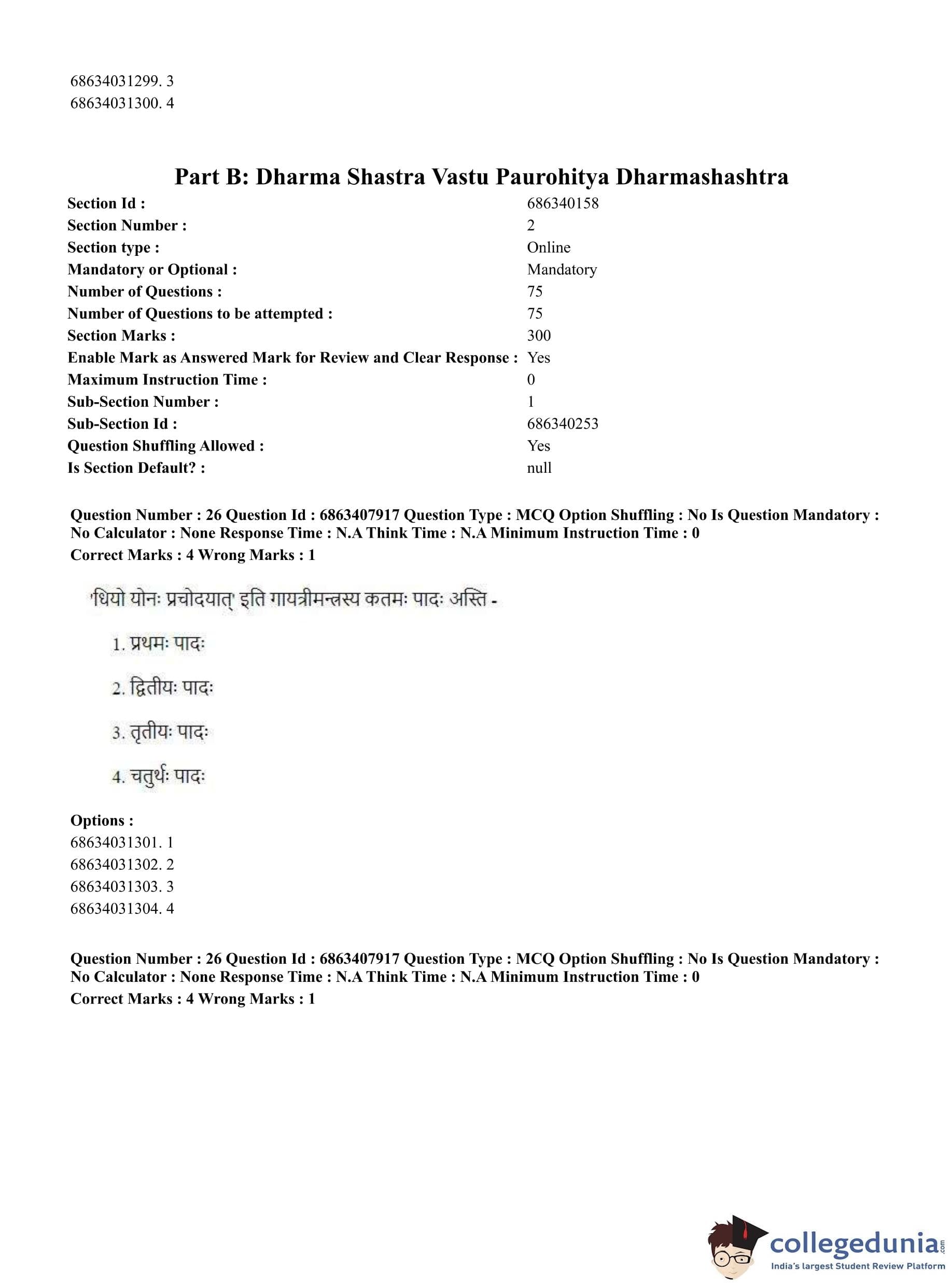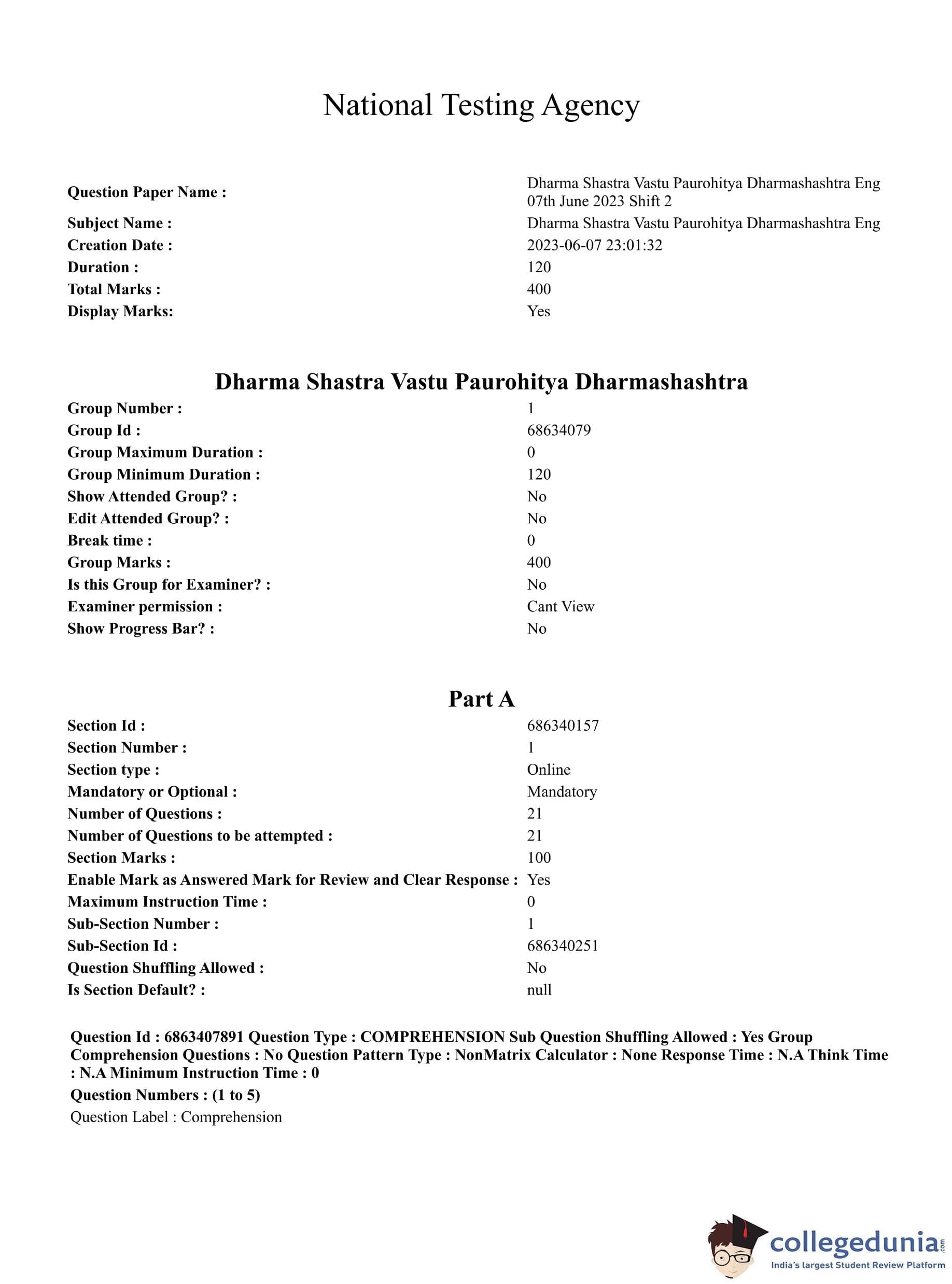 CUET PG 2023 Dharma Shastra, Vastu, Paurohitya Question Paper with Answer Key PDF is available for download here. The exam was conducted by National Testing Agency (NTA) on June 7, 2023 in Shift 2. The question paper comprised a total of 100 questions divided into 2 sections.