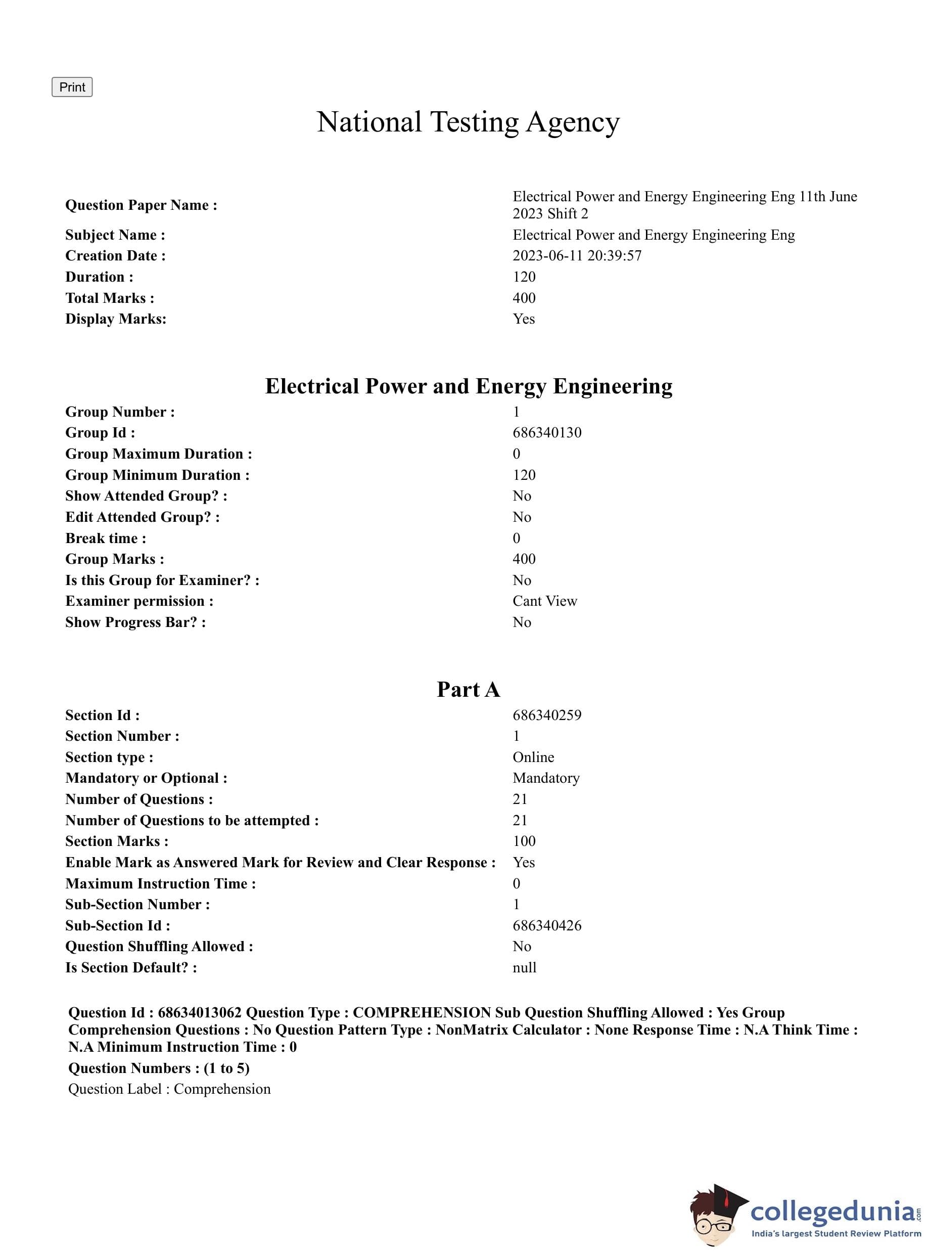 CUET PG 2023 Electrical, Power and Energy Engineering Question Paper with Answer Key PDF in English is available for download here. The exam was conducted by National Testing Agency (NTA) on June 11, 2023 in Shift 2. The question paper comprised a total of 100 questions divided into 2 sections.
