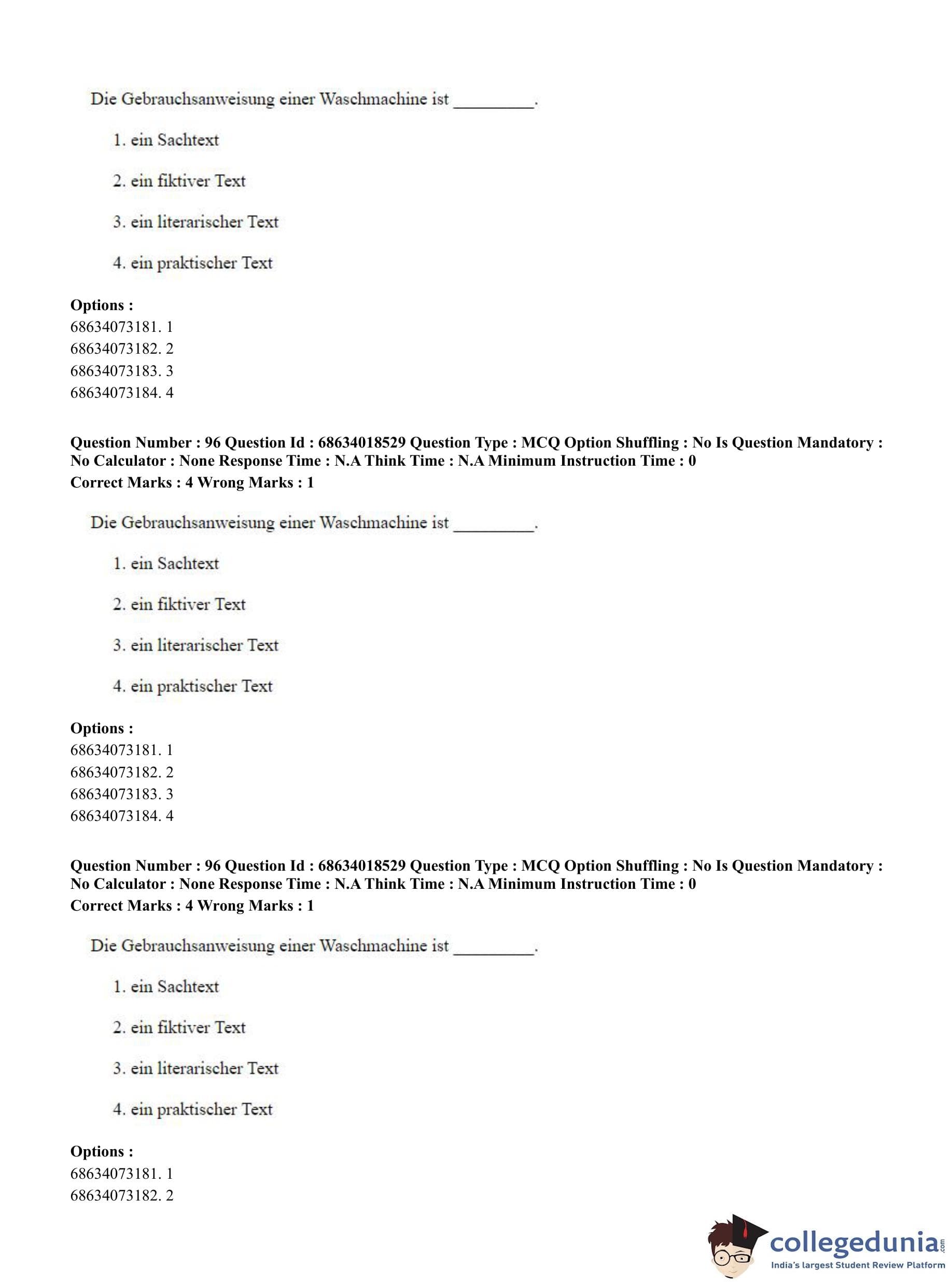 CUET PG 2023 German Question Paper with Answer Key PDF is available for download here. The exam was conducted by National Testing Agency (NTA) on June 13, 2023 in Shift 3. The question paper comprised a total of 100 questions divided into 2 sections.