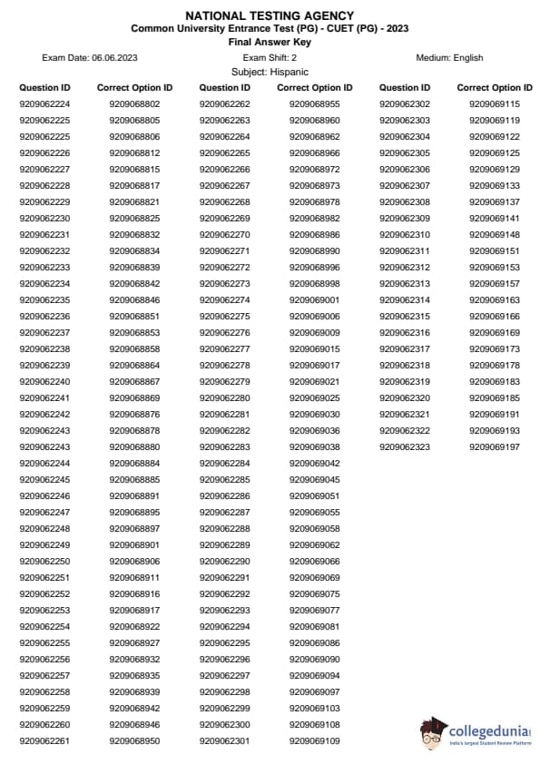 | CUET PG Hispanic Question Paper 2023 PDF | CUET PG Hispanic Answer Key 2023 PDF |