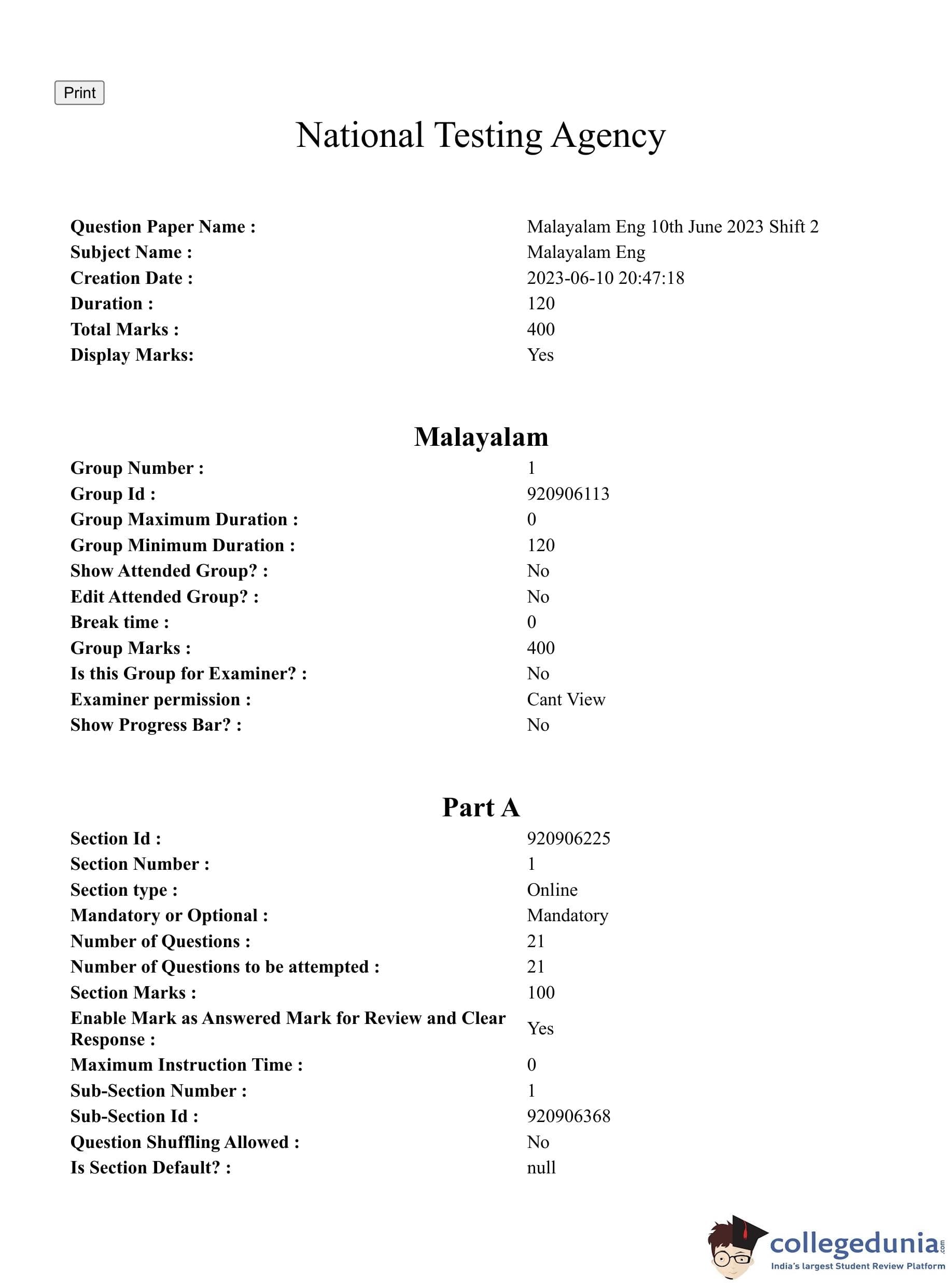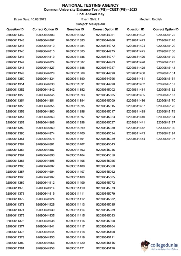 CUET PG 2023 Malayalam Question Paper with Answer Key PDF in English is available for download here. The exam was conducted by National Testing Agency (NTA) on June 10, 2023 in Shift 2. The question paper comprised a total of 100 questions divided into 2 sections.