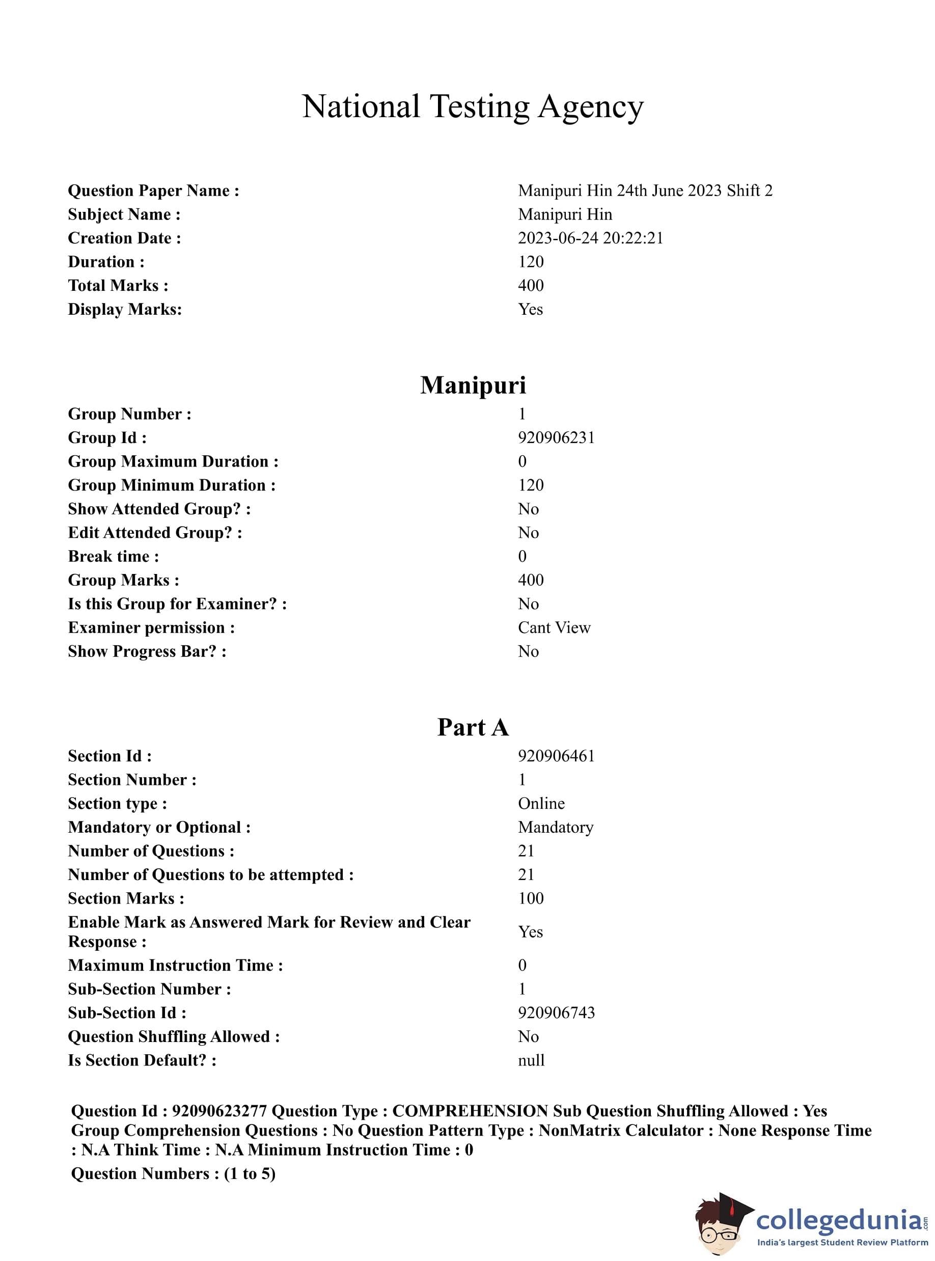 CUET PG 2023 Manipuri Question Paper with Answer Key PDF in Hindi is available for download here. The exam was conducted by National Testing Agency (NTA) on June 24, 2023 in Shift 2. The question paper comprised a total of 100 questions divided into 2 sections.