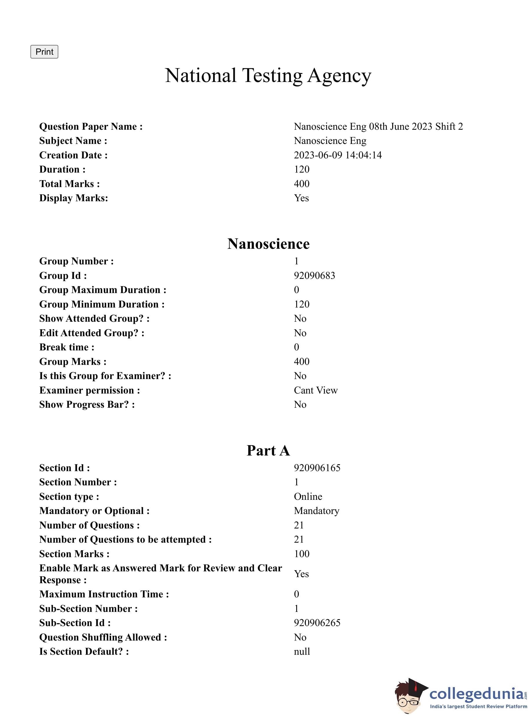 CUET PG 2023 Nanoscience Question Paper with Answer Key PDF in English is available for download here. The exam was conducted by National Testing Agency (NTA) on June 8, 2023 in Shift 2. The question paper comprised a total of 100 questions divided into 2 sections.