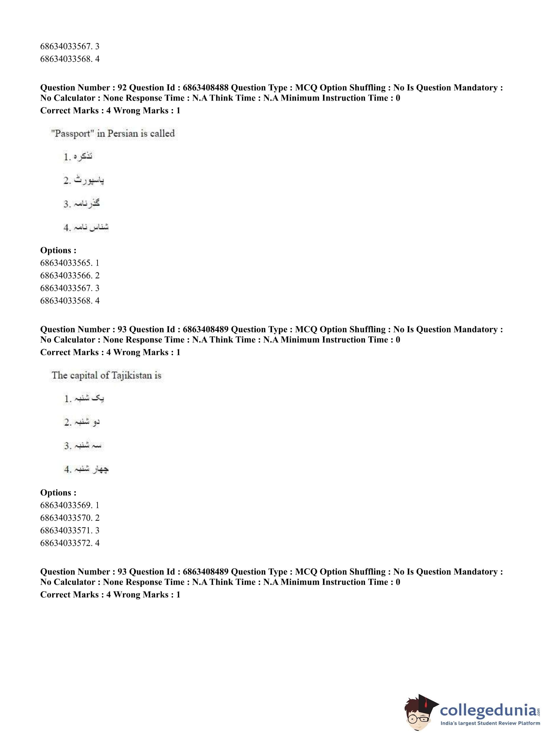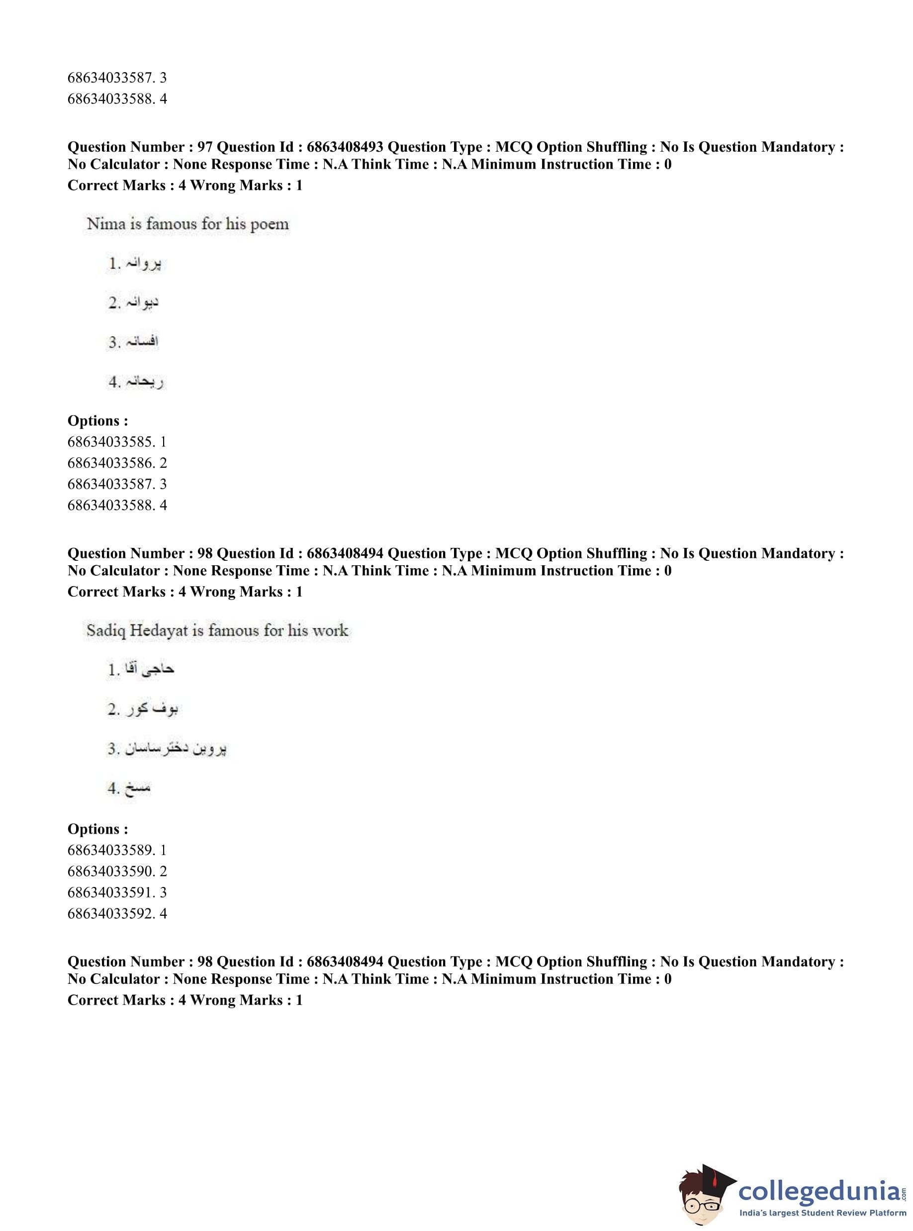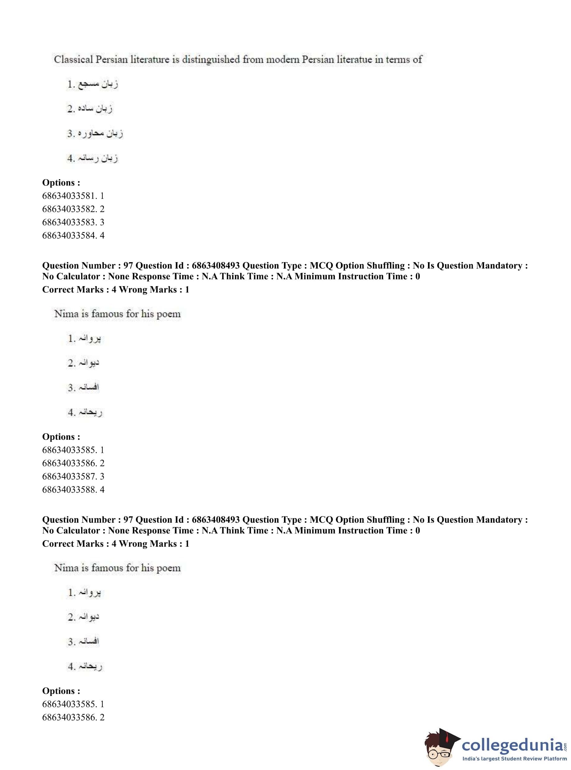CUET PG 2023 Persian Question Paper in Hindi (June 7 - Shift 2)
