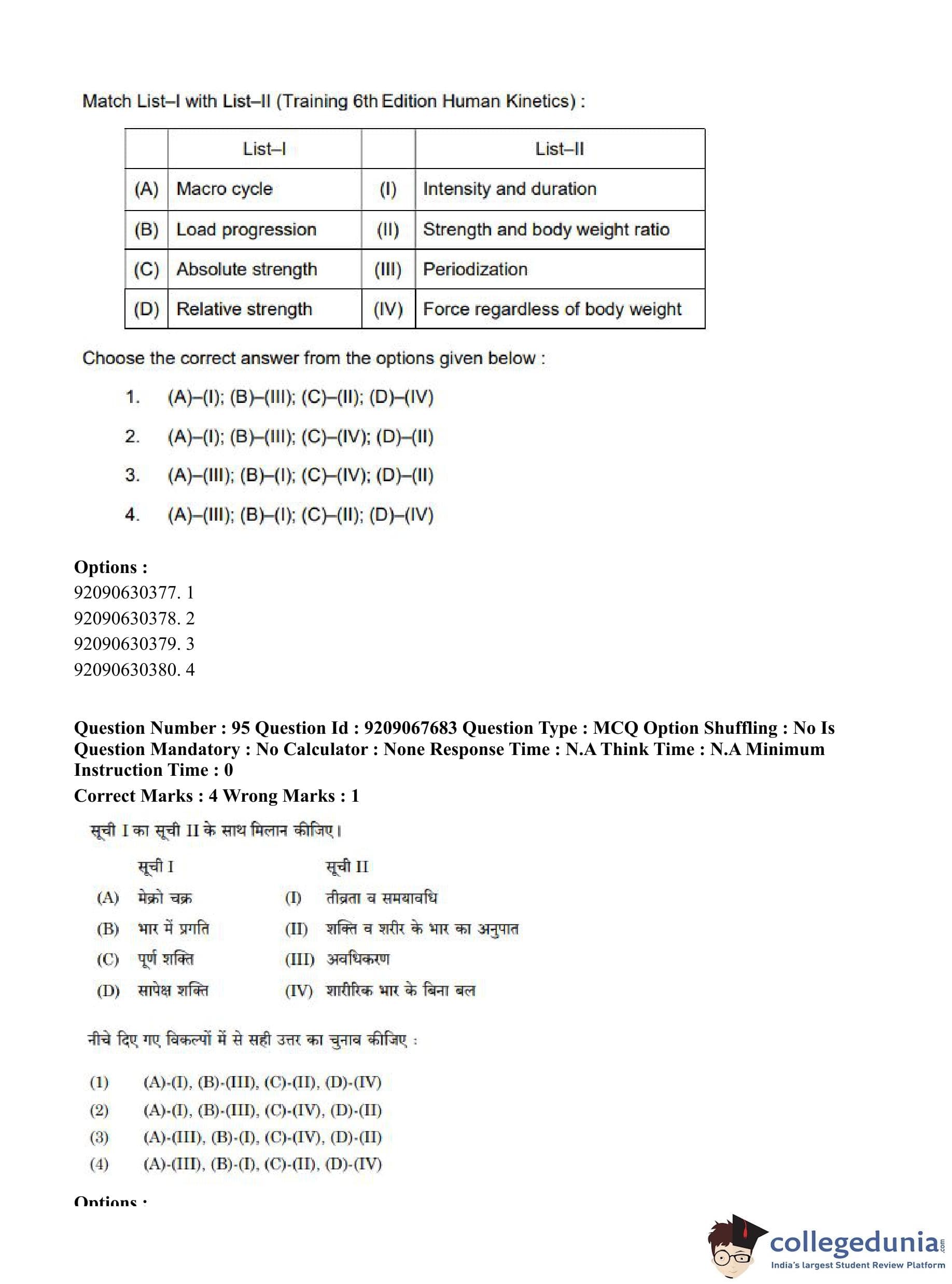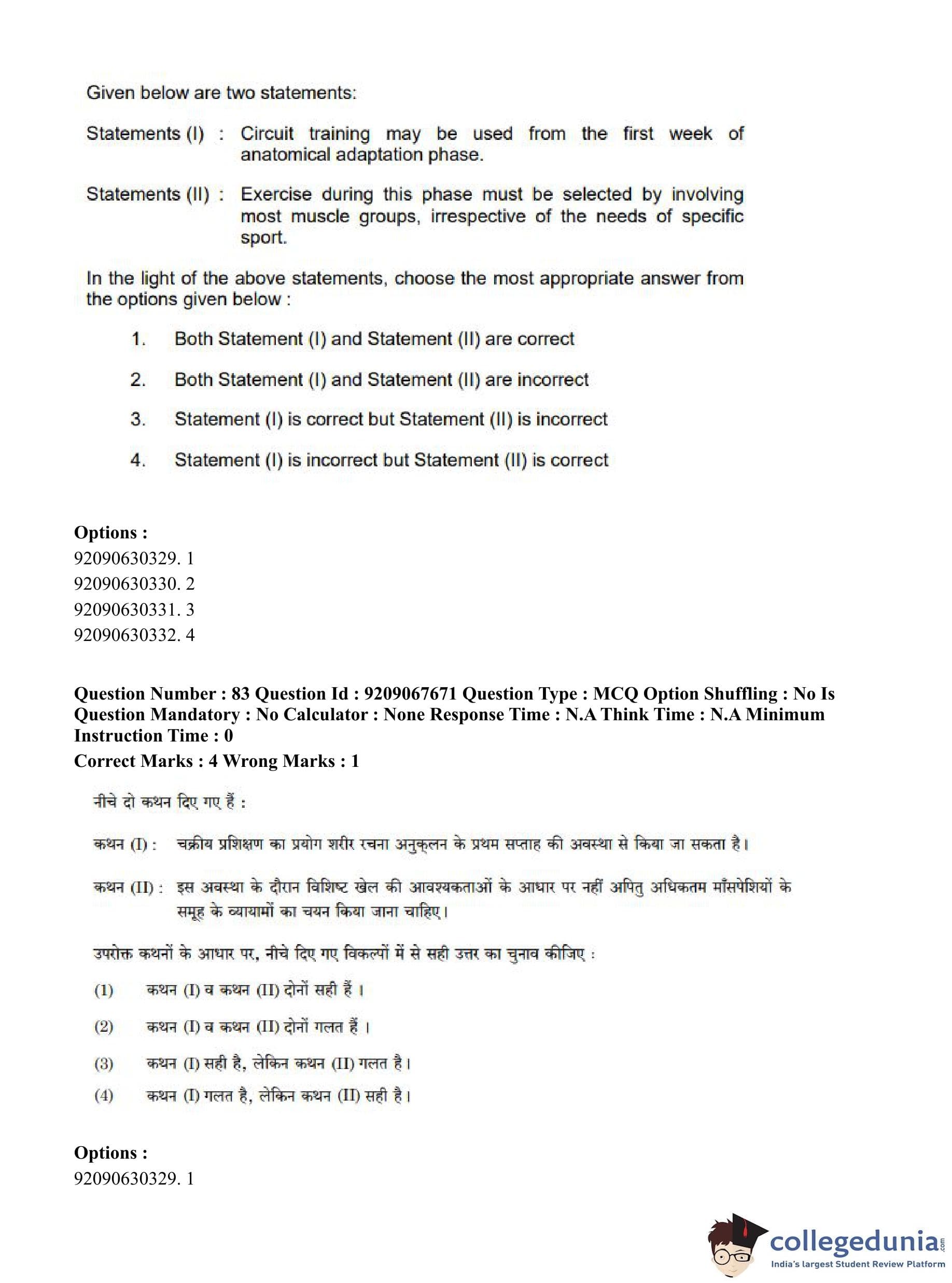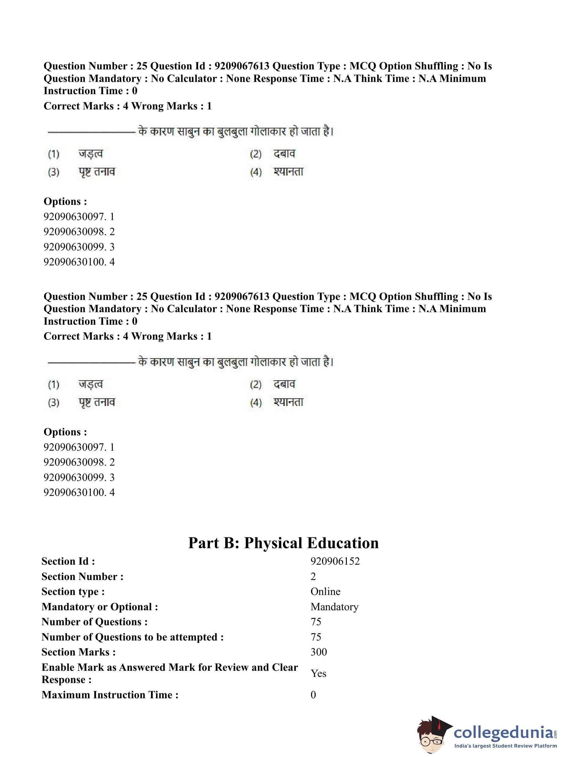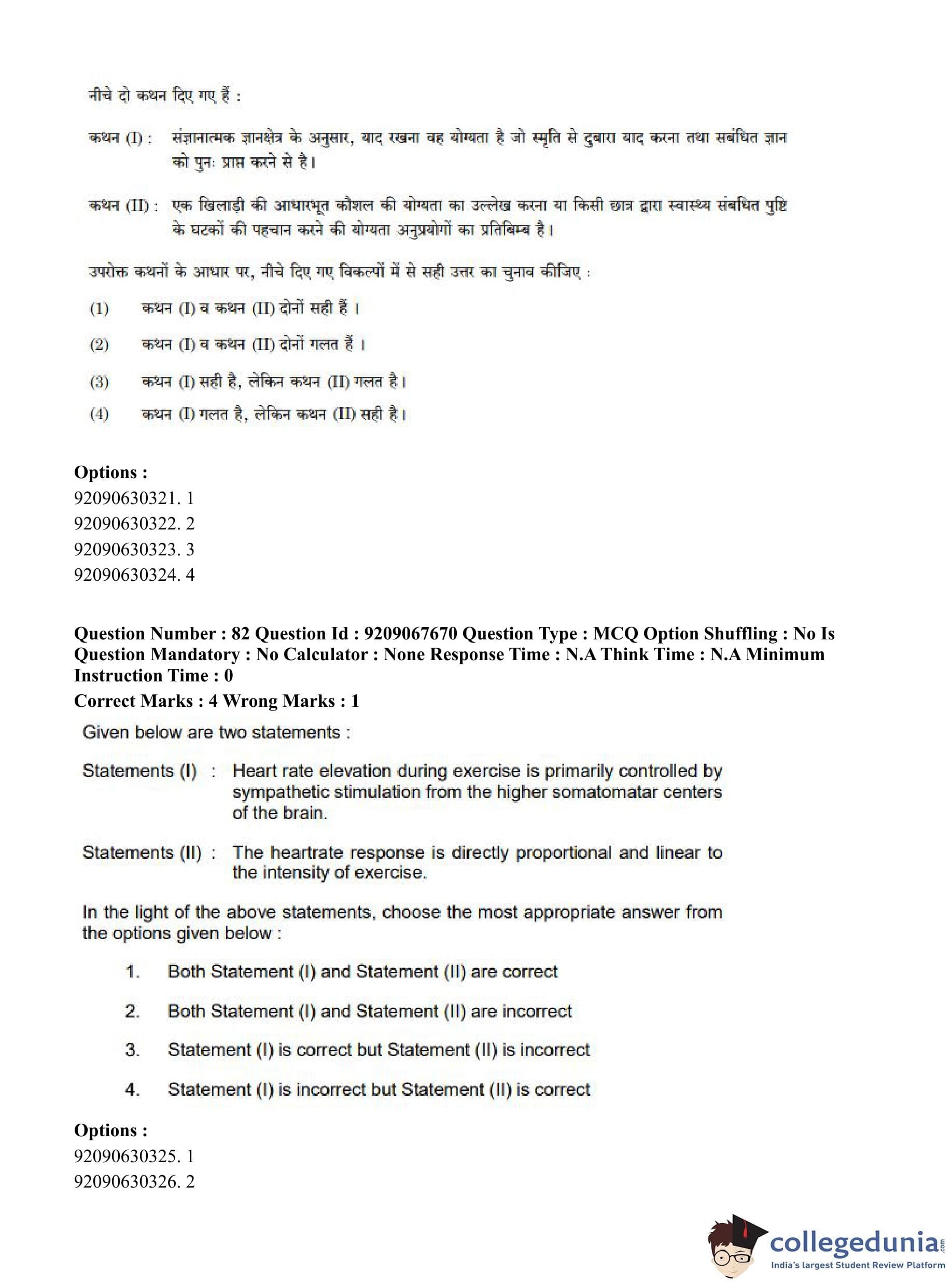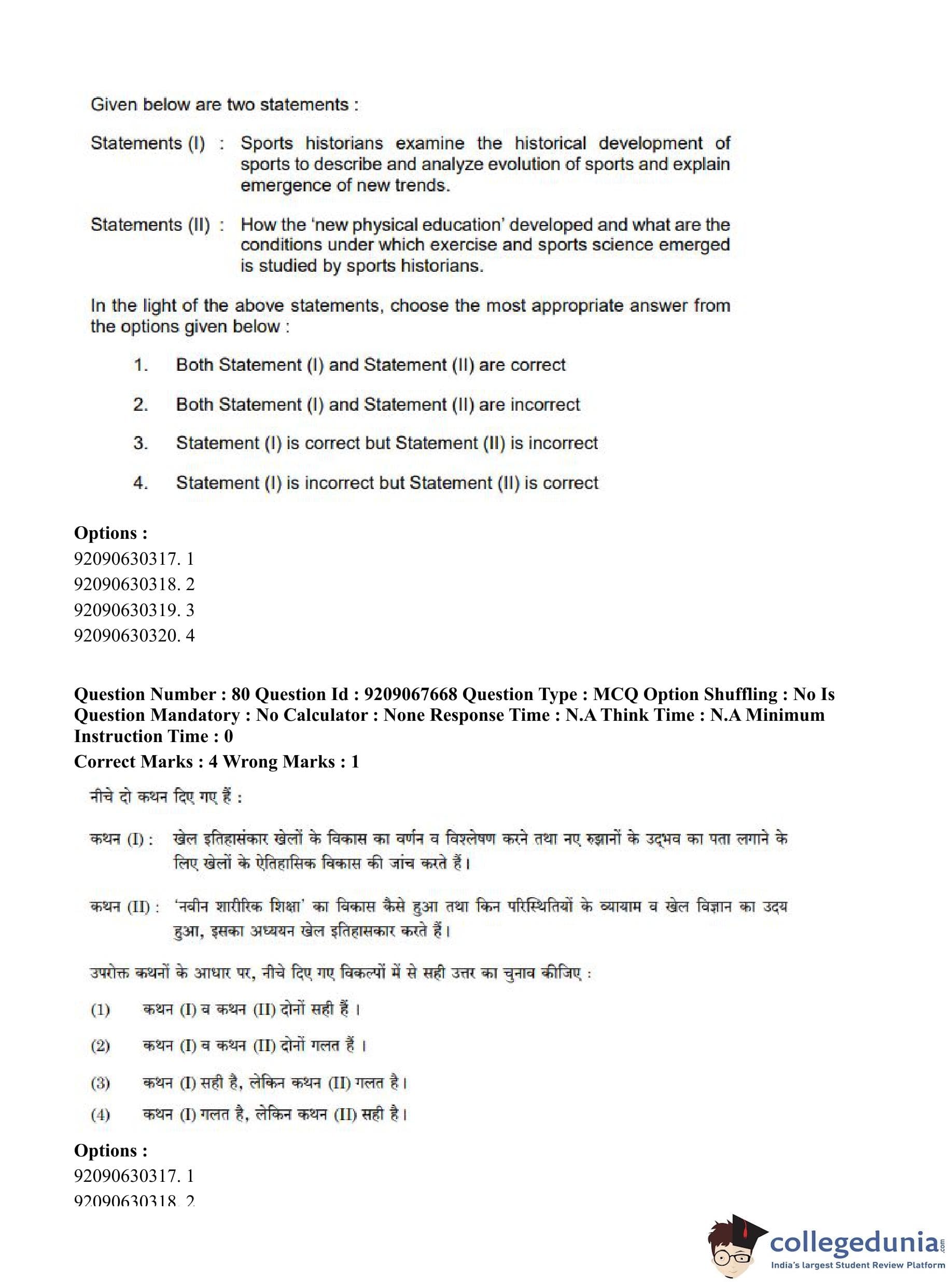 CUET PG 2023 Physical Education Question Paper in Hindi (June 8 - Shift 3)