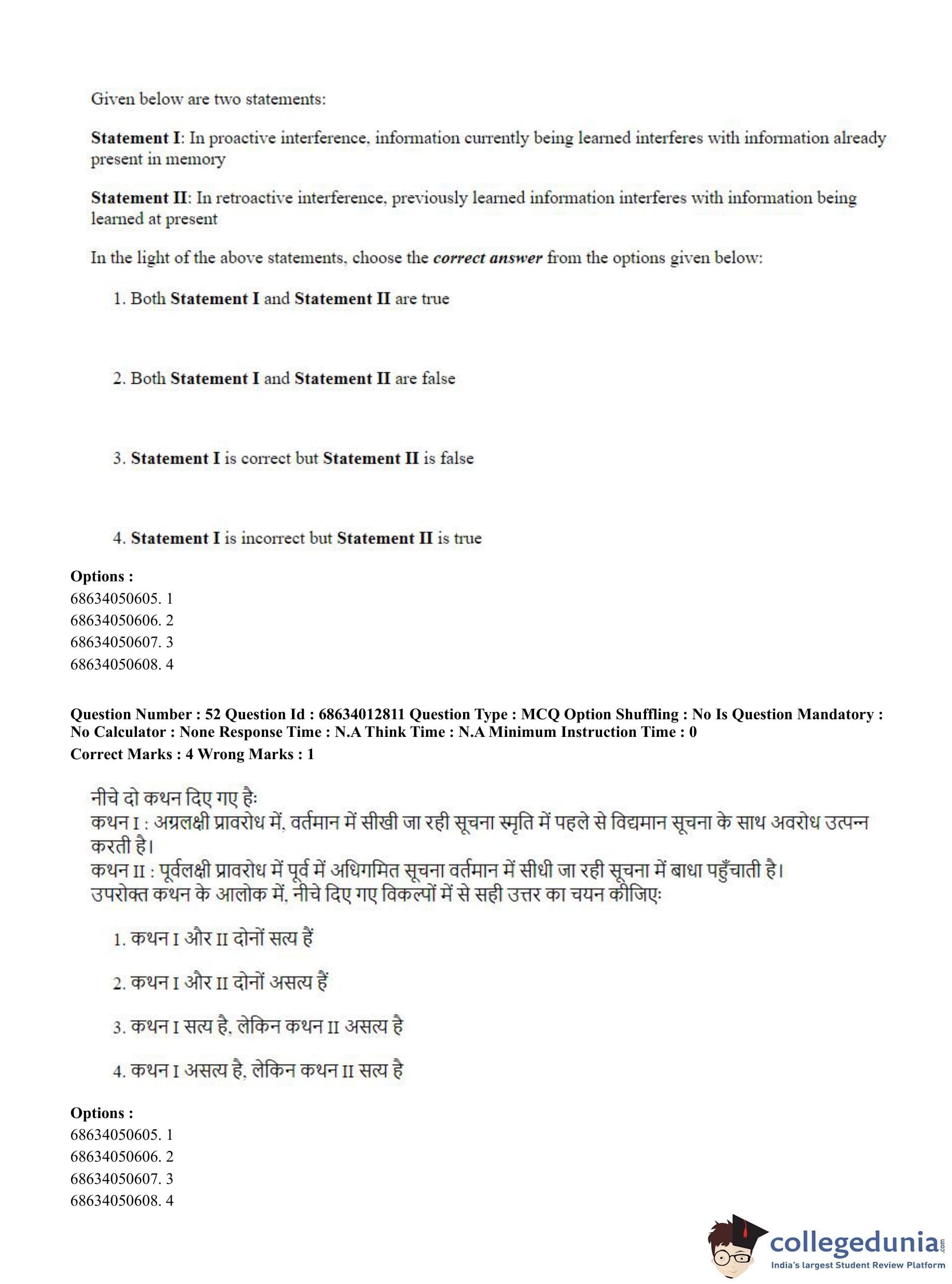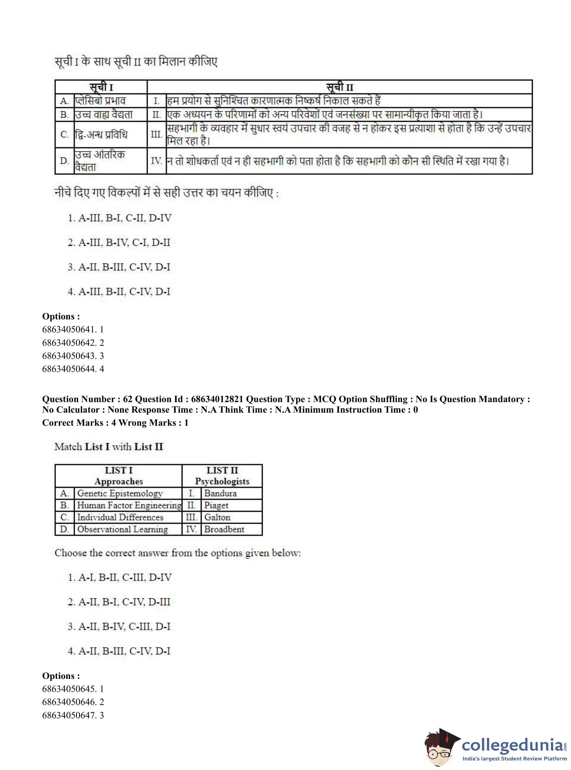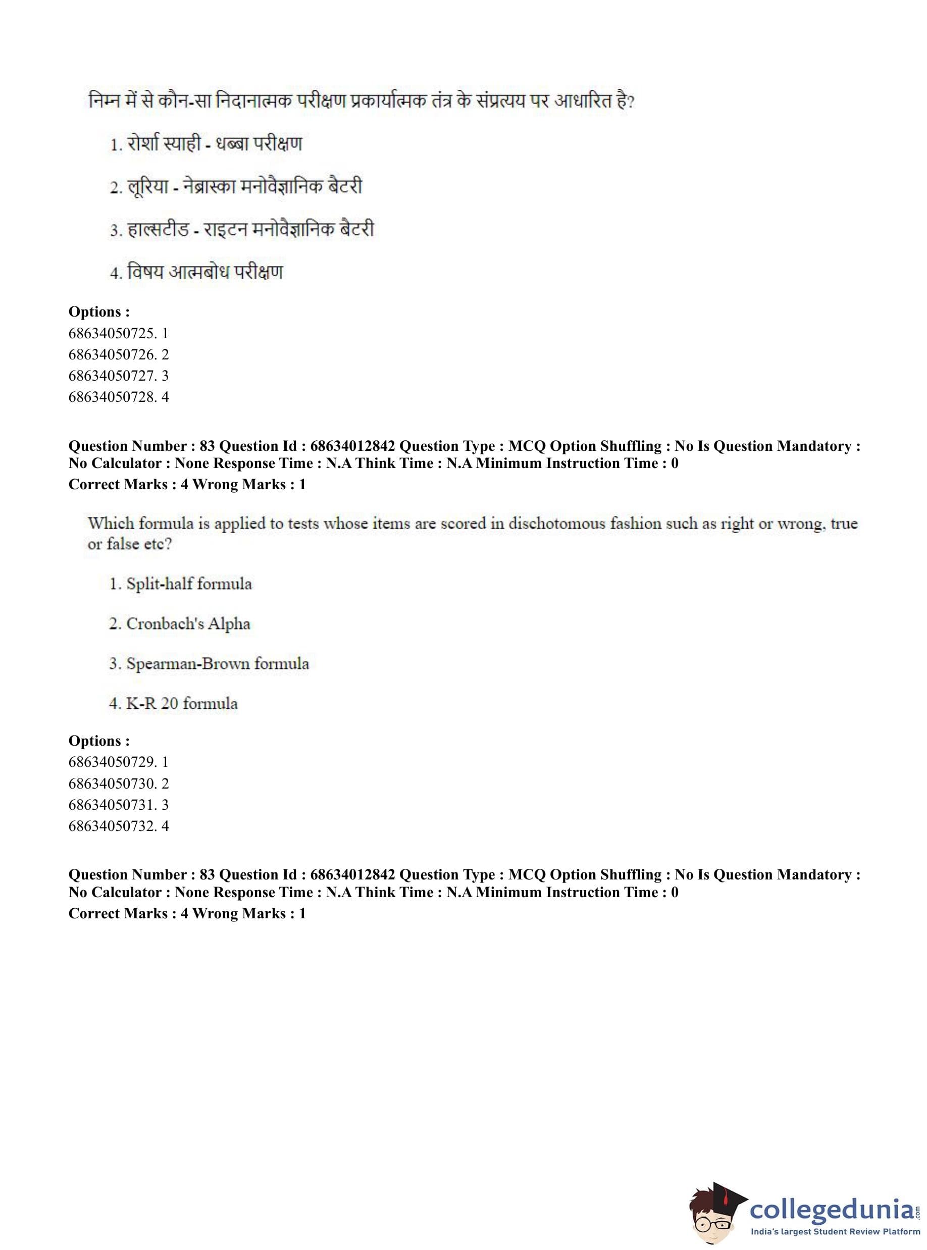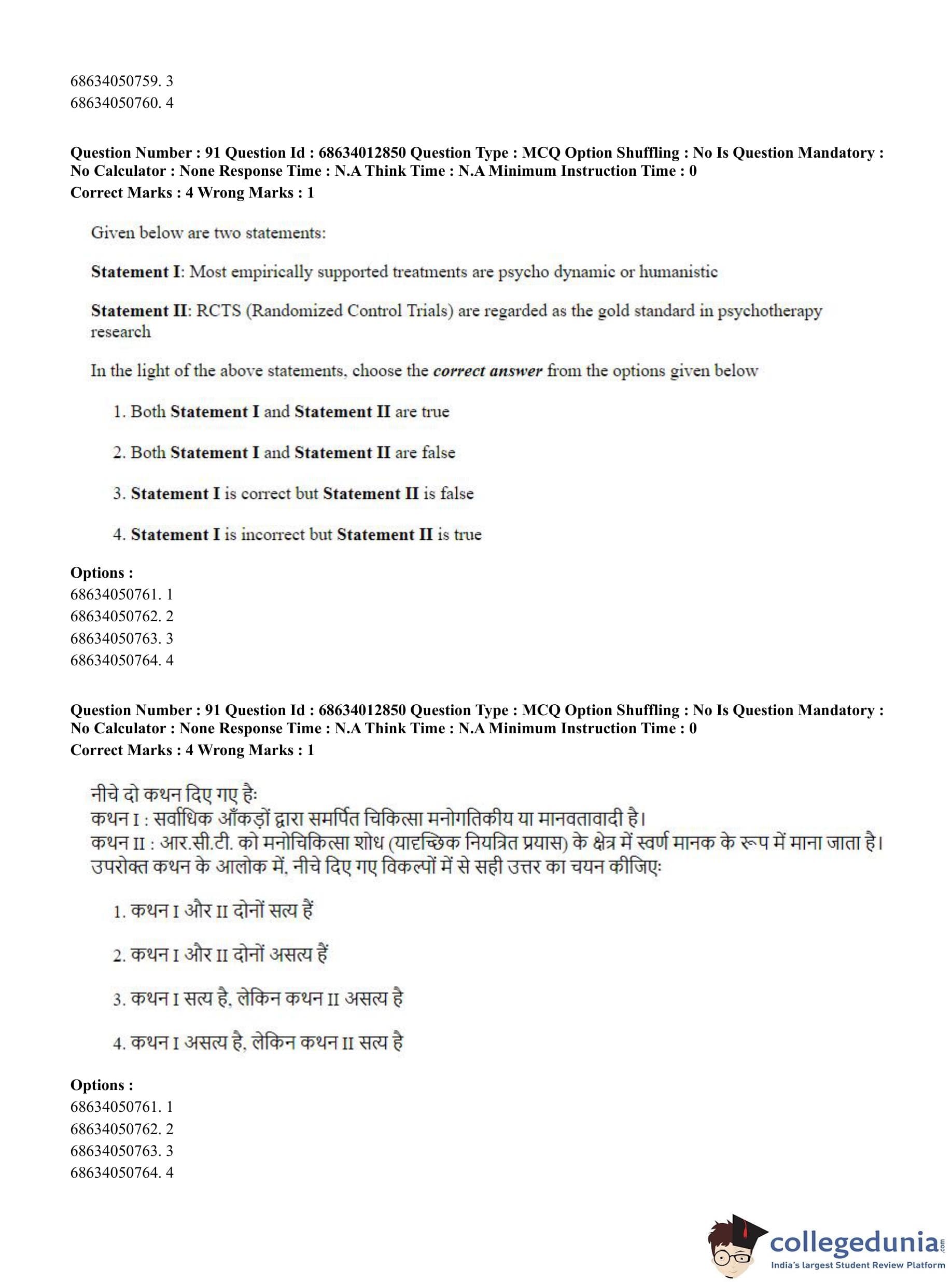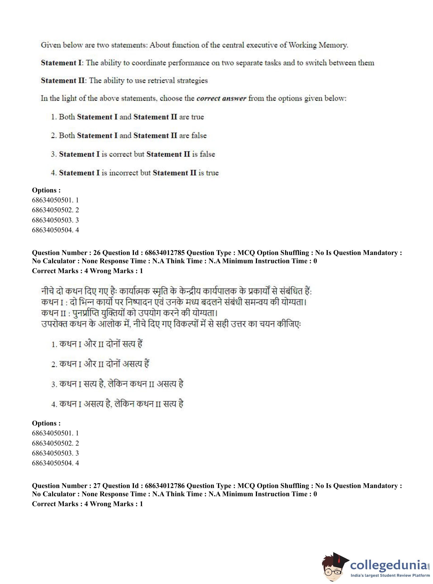 CUET PG 2023 Psychology Question Paper in Hindi (June 11 - Shift 1)