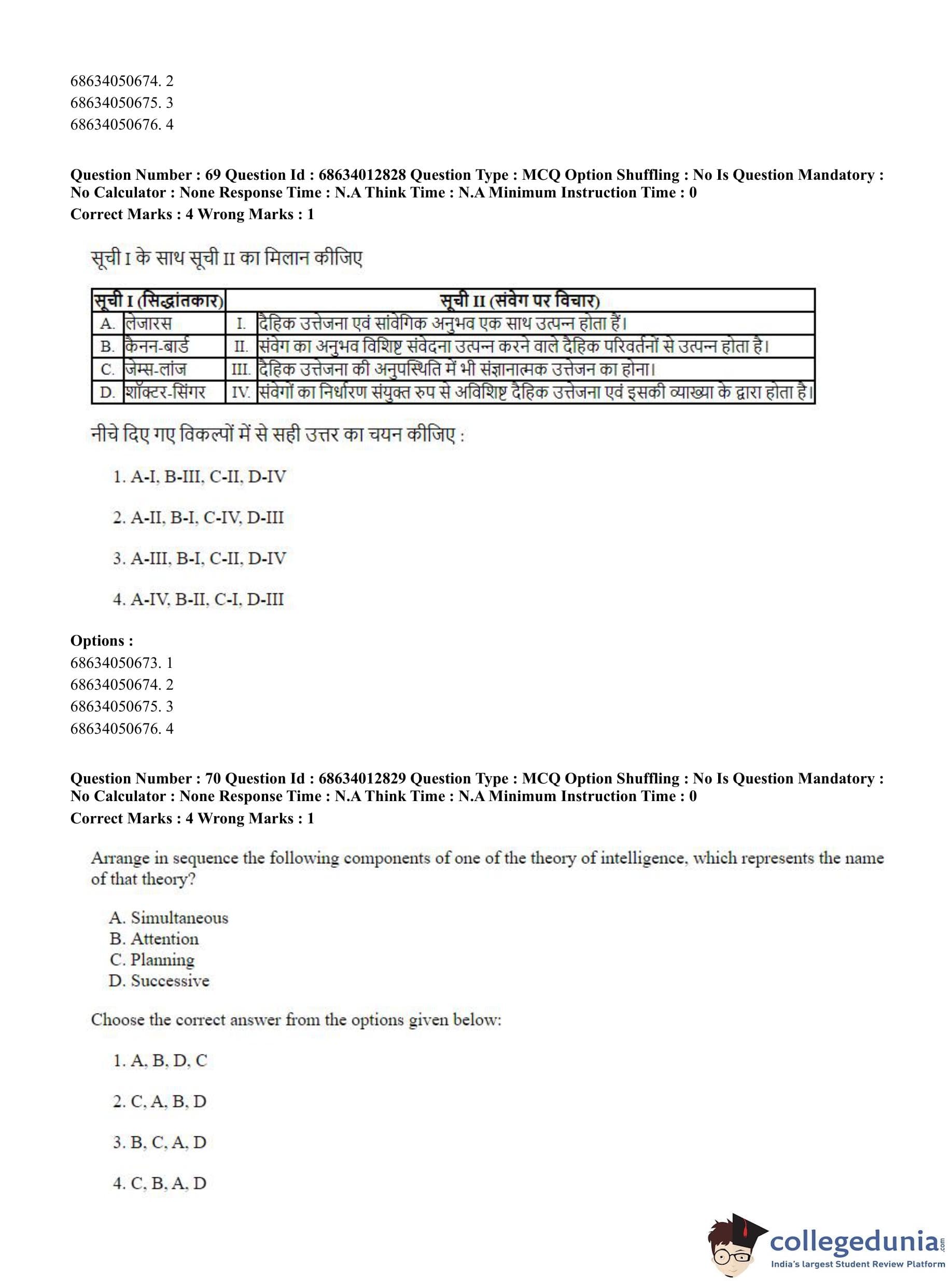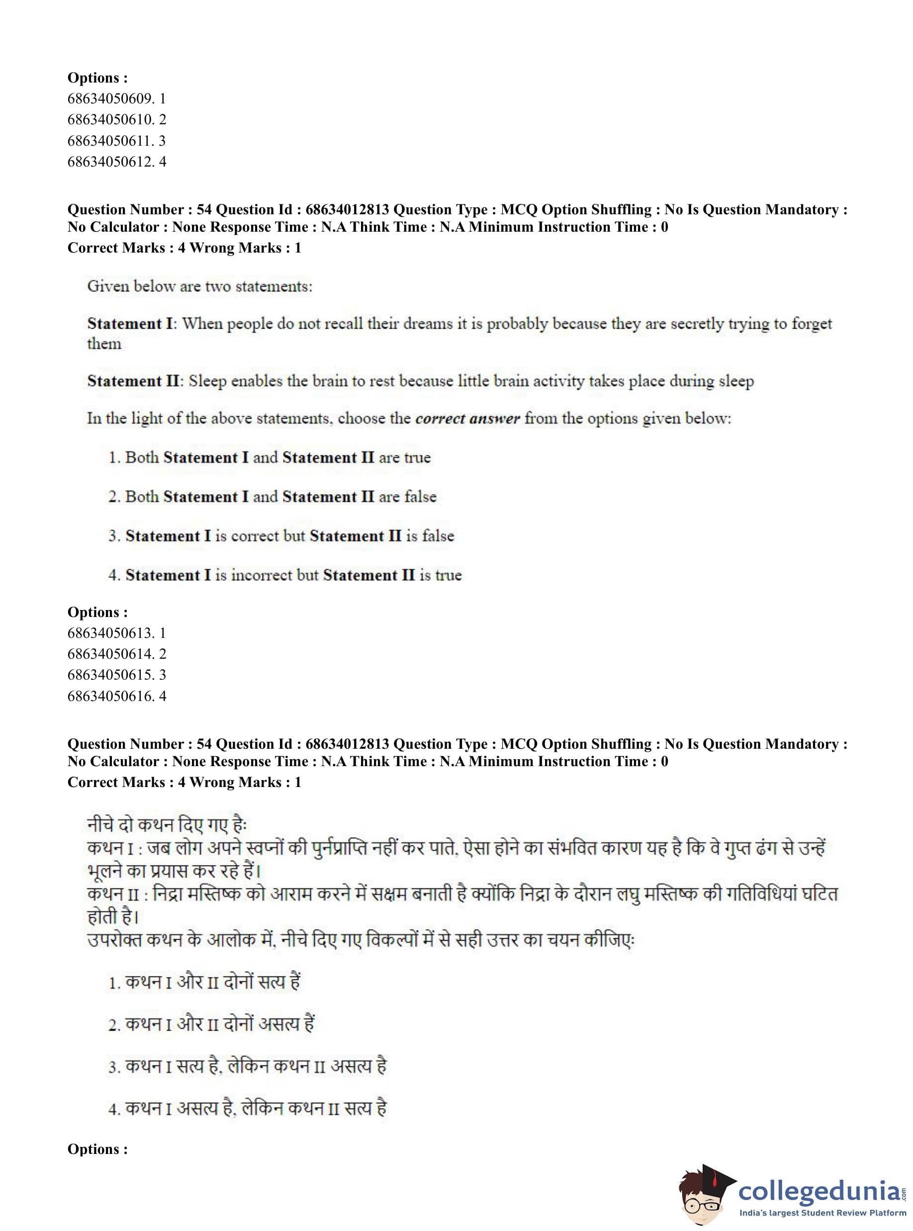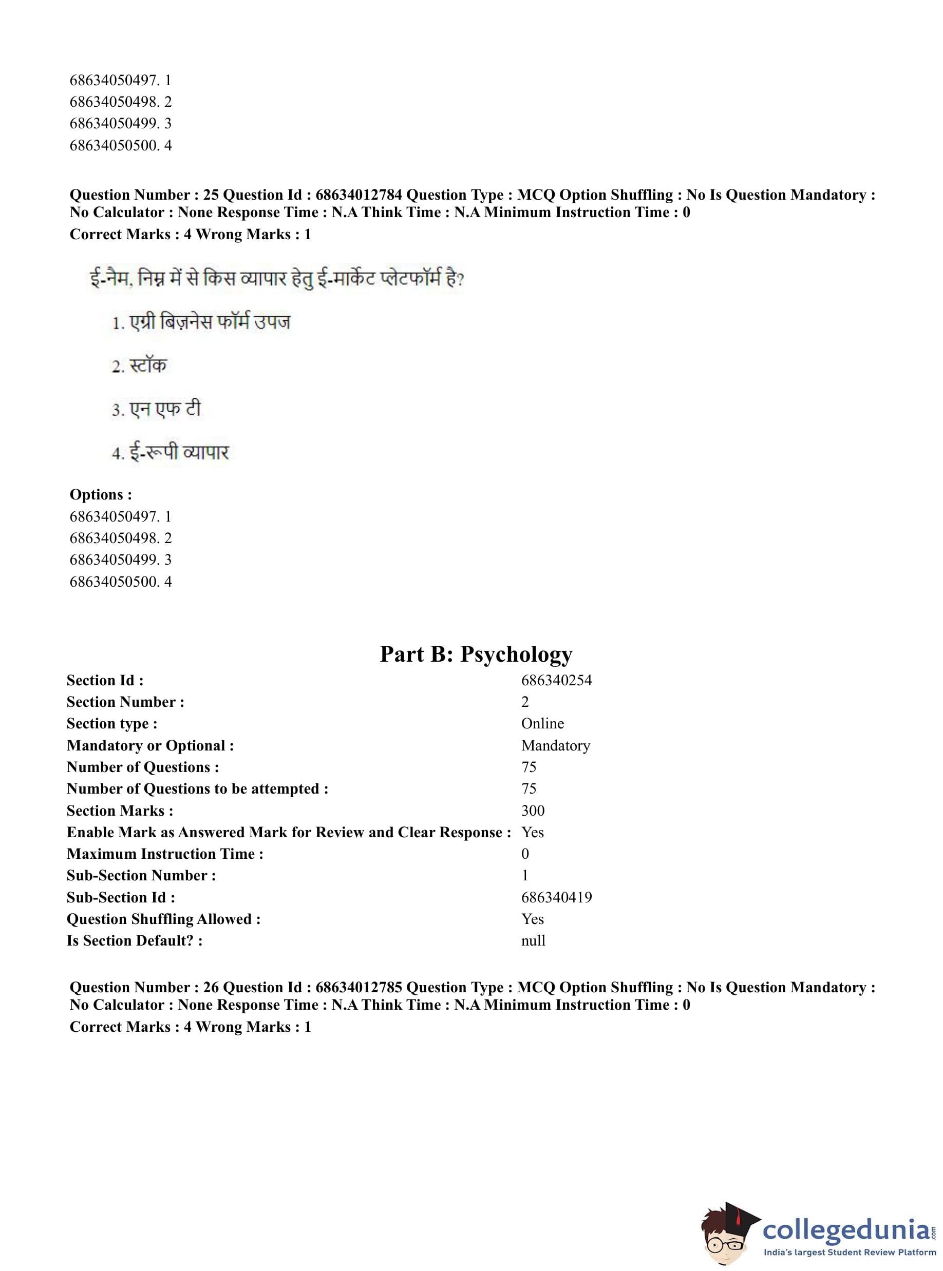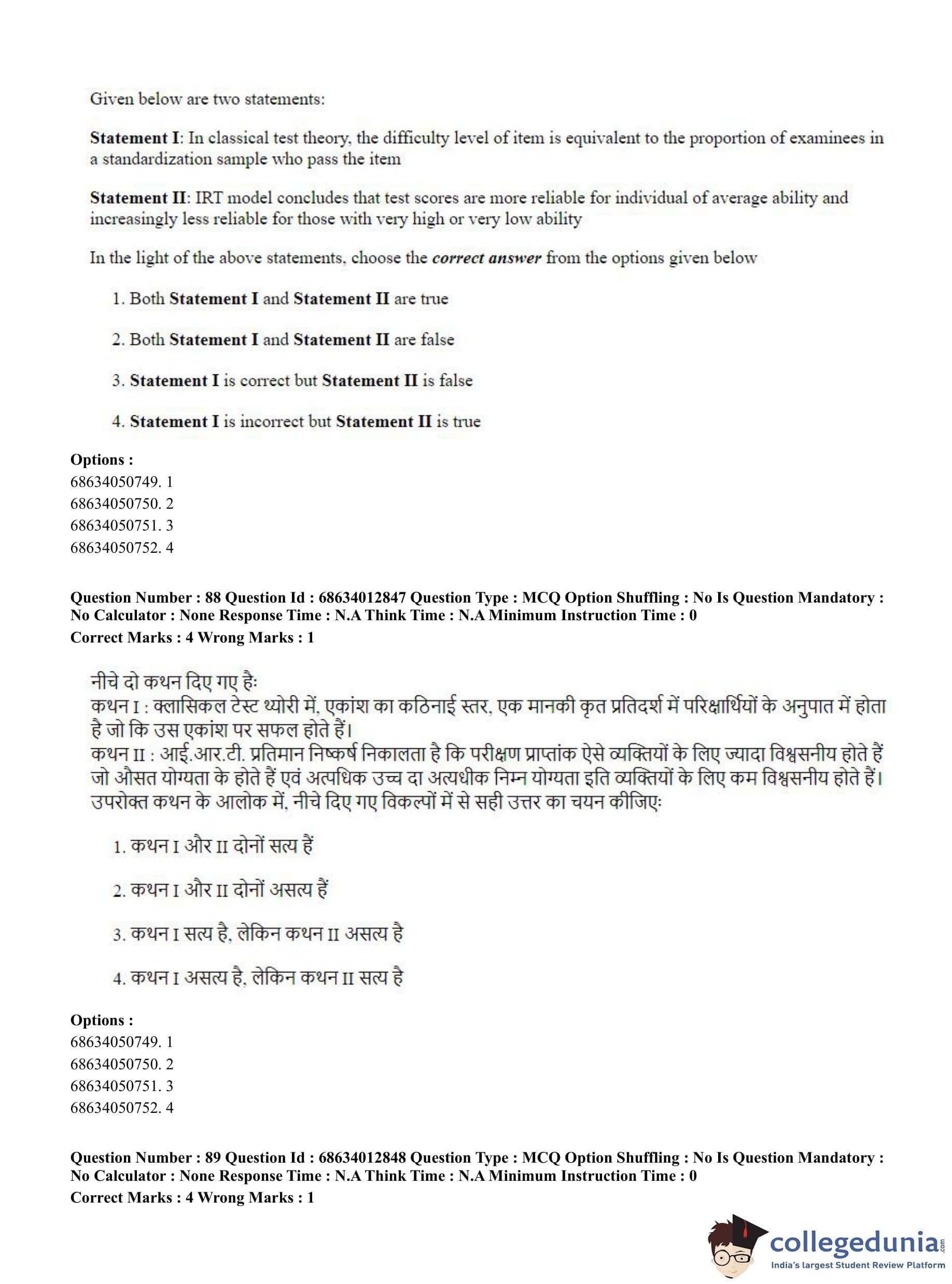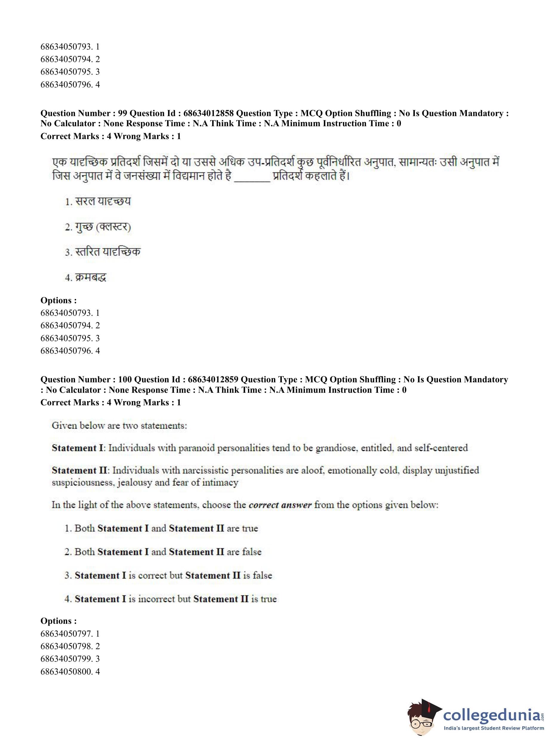 CUET PG 2023 Psychology Question Paper in Hindi (June 11 - Shift 1)