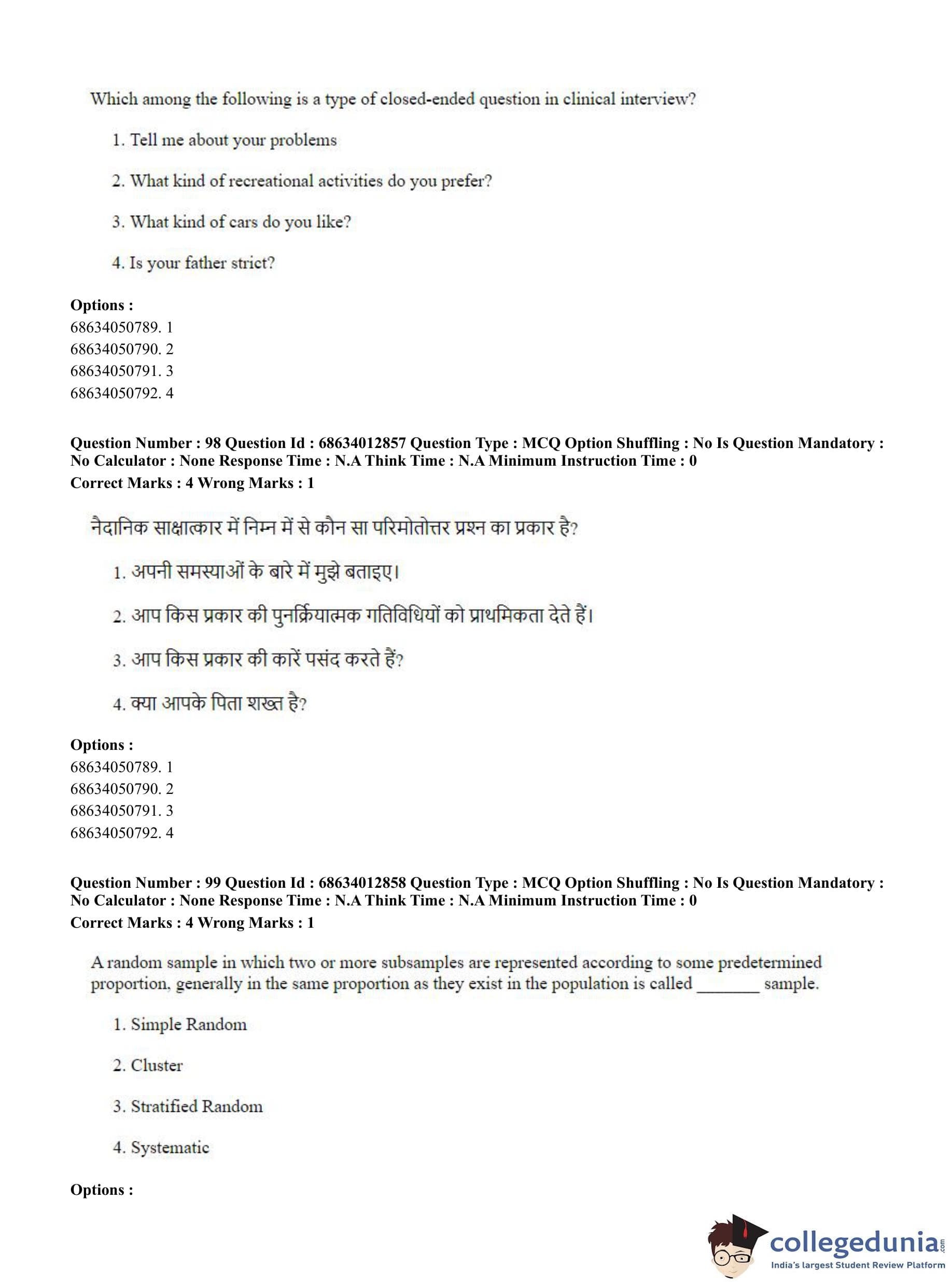 CUET PG 2023 Psychology Question Paper with Answer Key PDF in Hindi is available for download here. The exam was conducted by National Testing Agency (NTA) on June 11, 2023 in Shift 1. The question paper comprised a total of 100 questions divided into 2 sections.