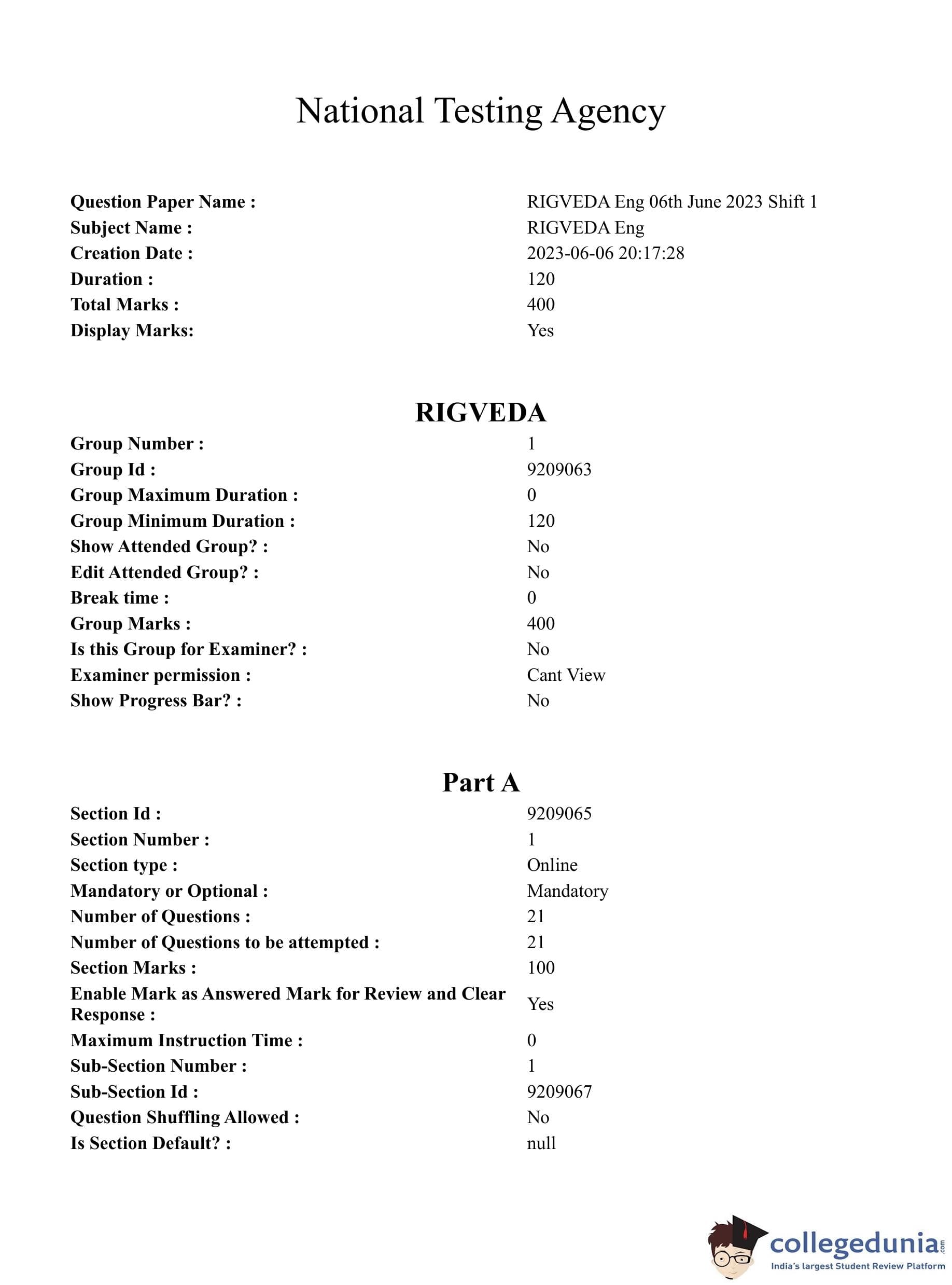 CUET PG 2023 Rigveda Question Paper with Answer Key PDF in English is available for download here. The exam was conducted by National Testing Agency (NTA) on June 6, 2023 in Shift 1. The question paper comprised a total of 100 questions divided into 2 sections.