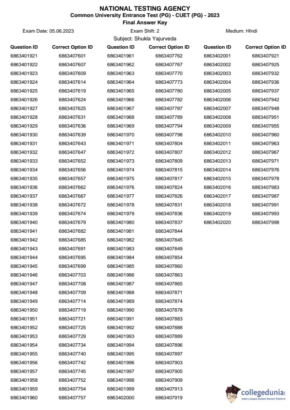 | CUET PG Shukla Yajurveda Question Paper 2023 PDF | CUET PG Shukla Yajurveda Answer Key 2023 PDF |