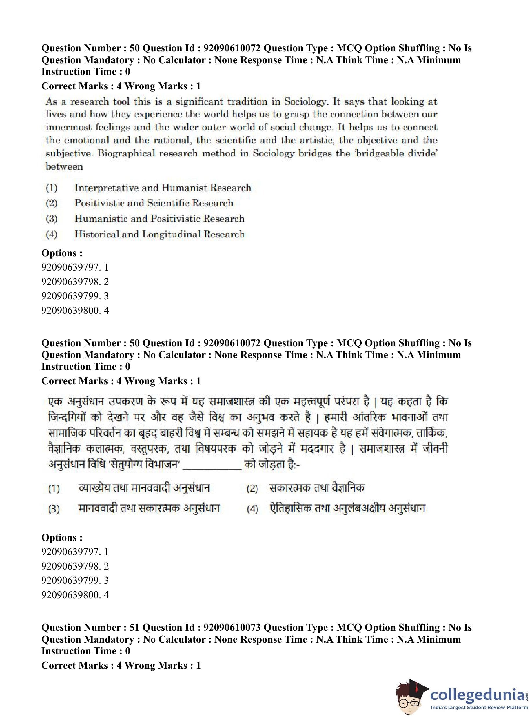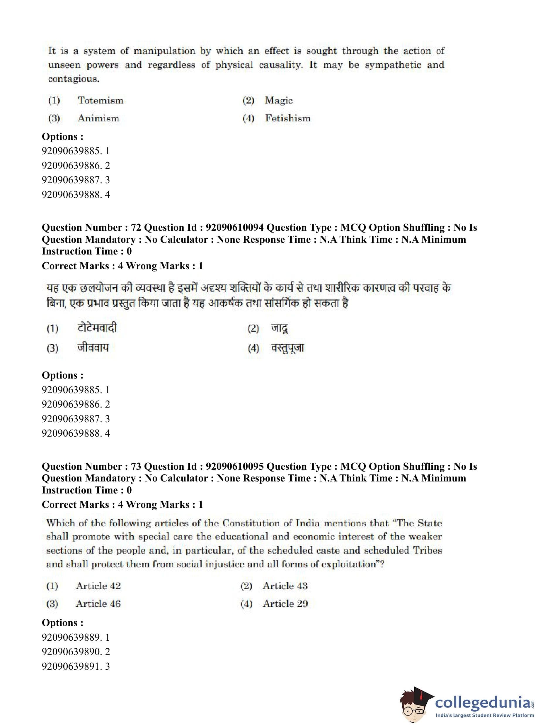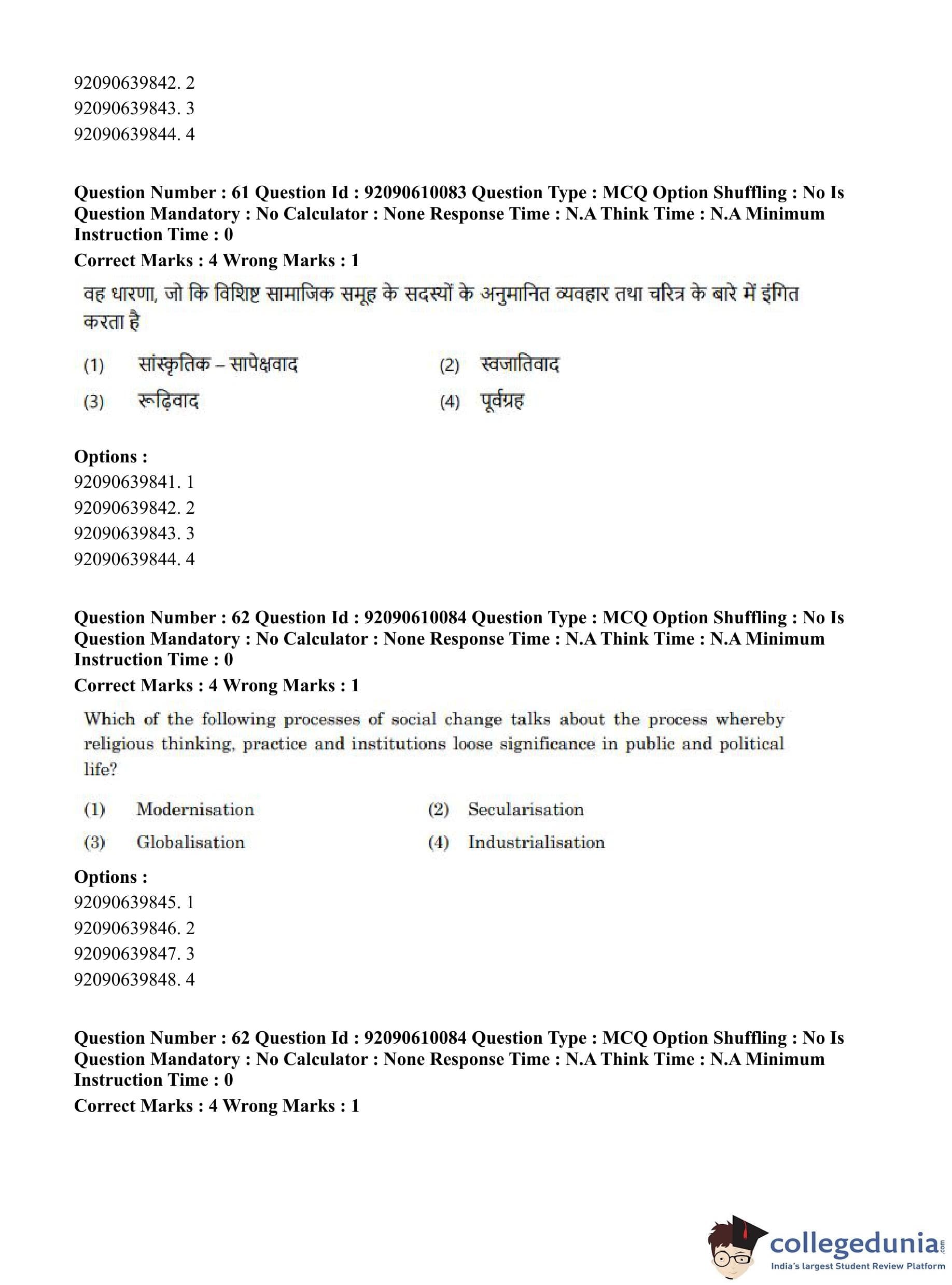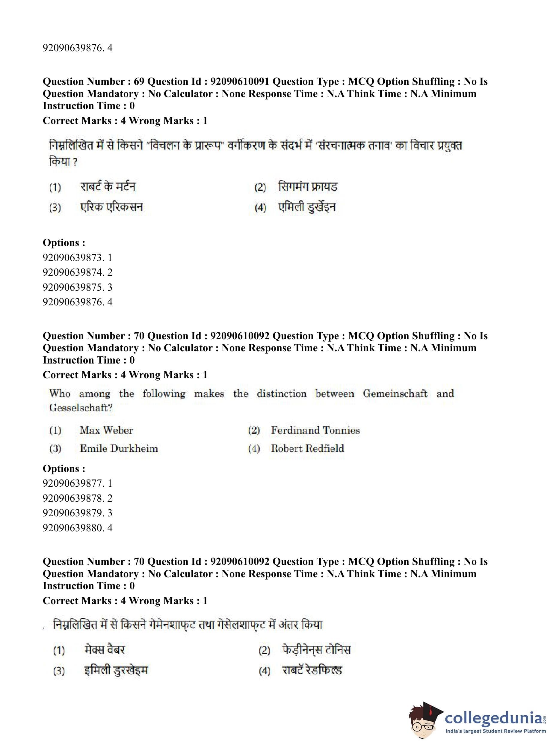 CUET PG 2023 Sociology Question Paper in Hindi (June 10 - Shift 1)