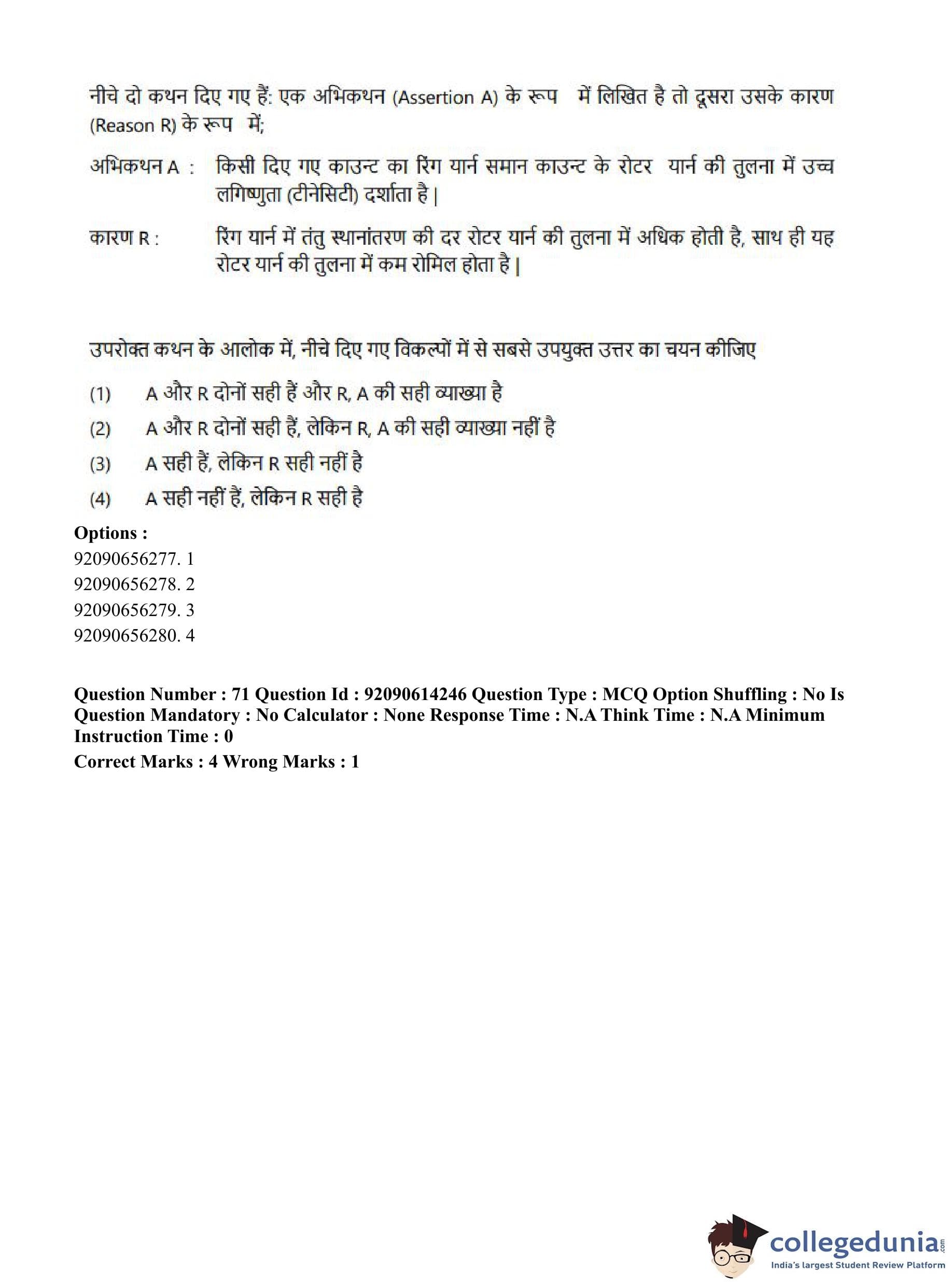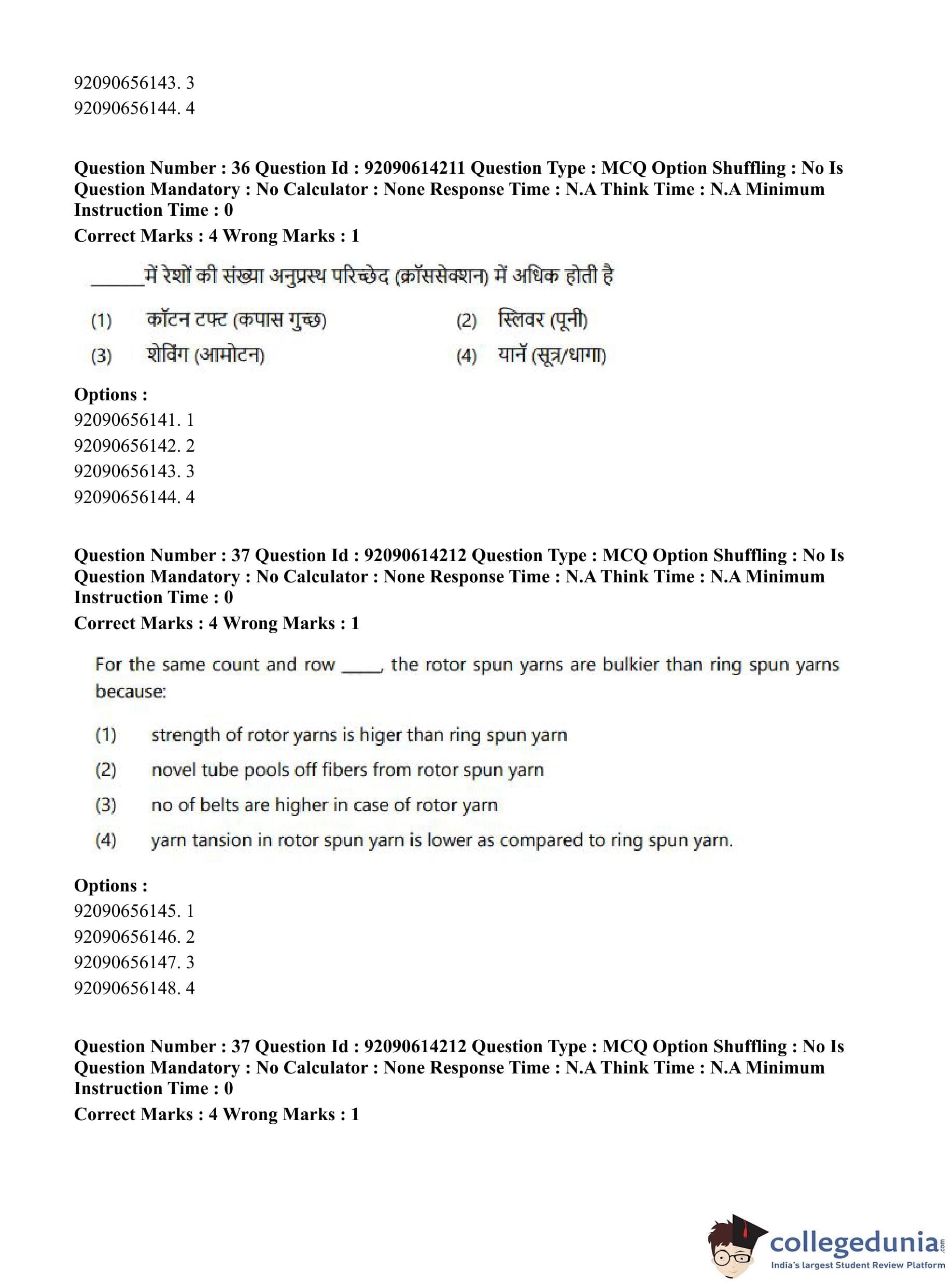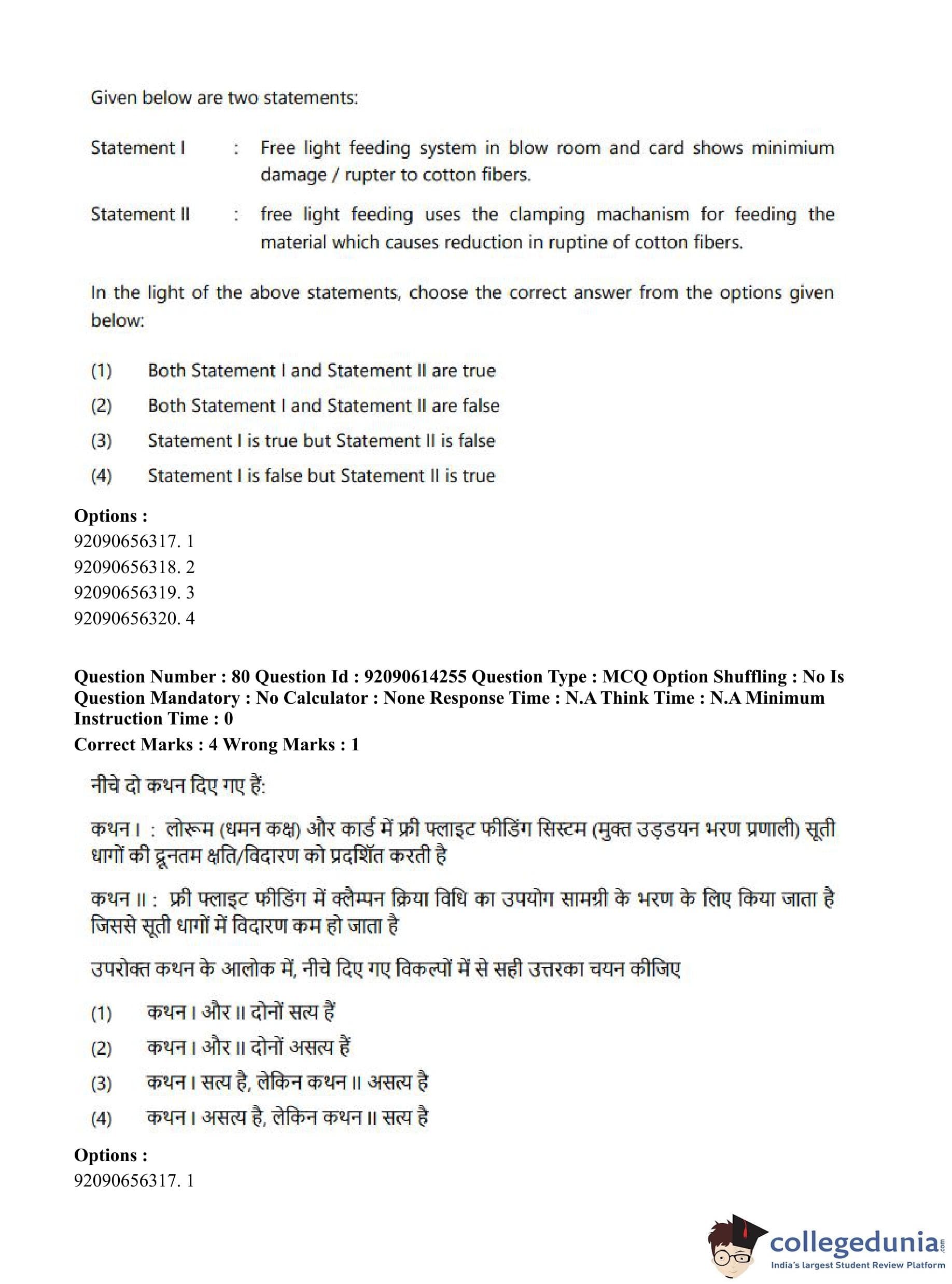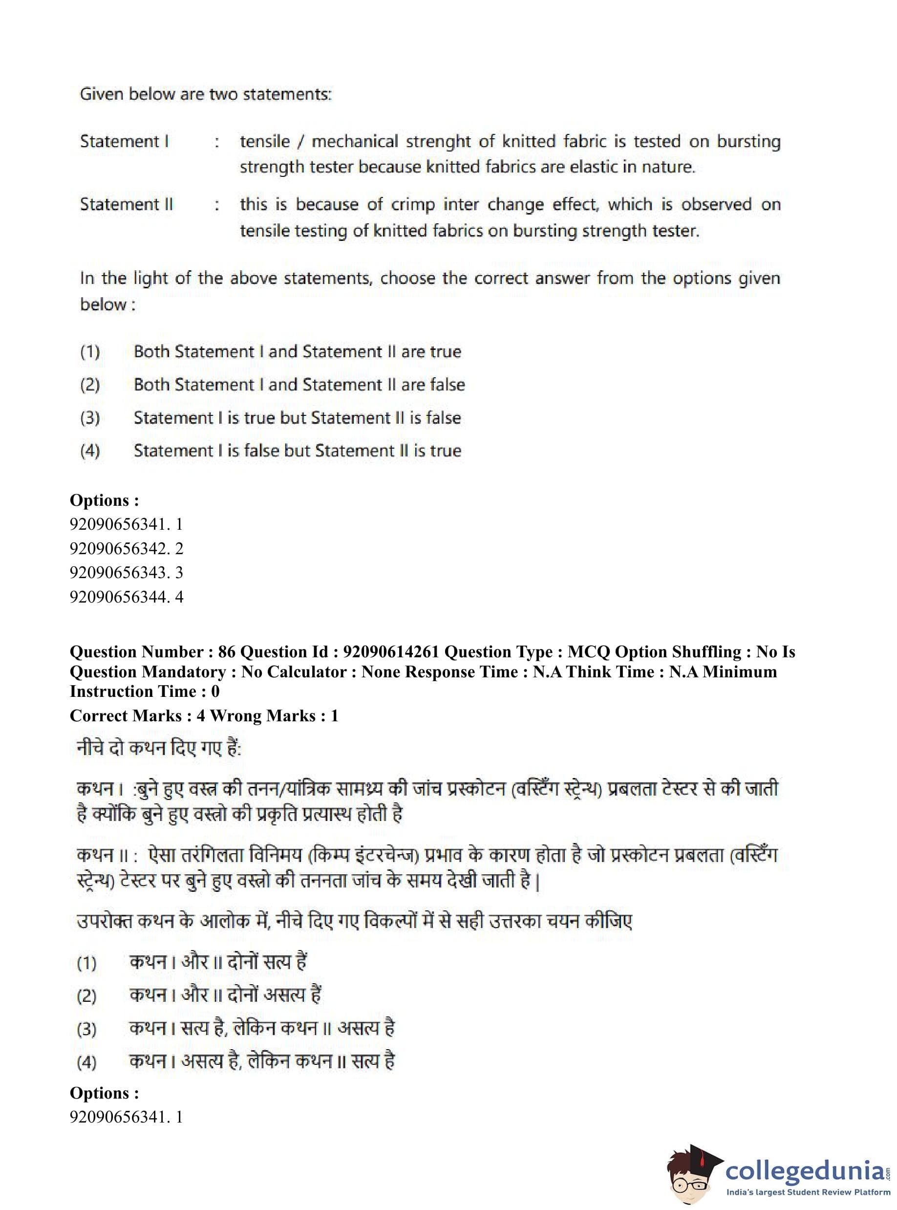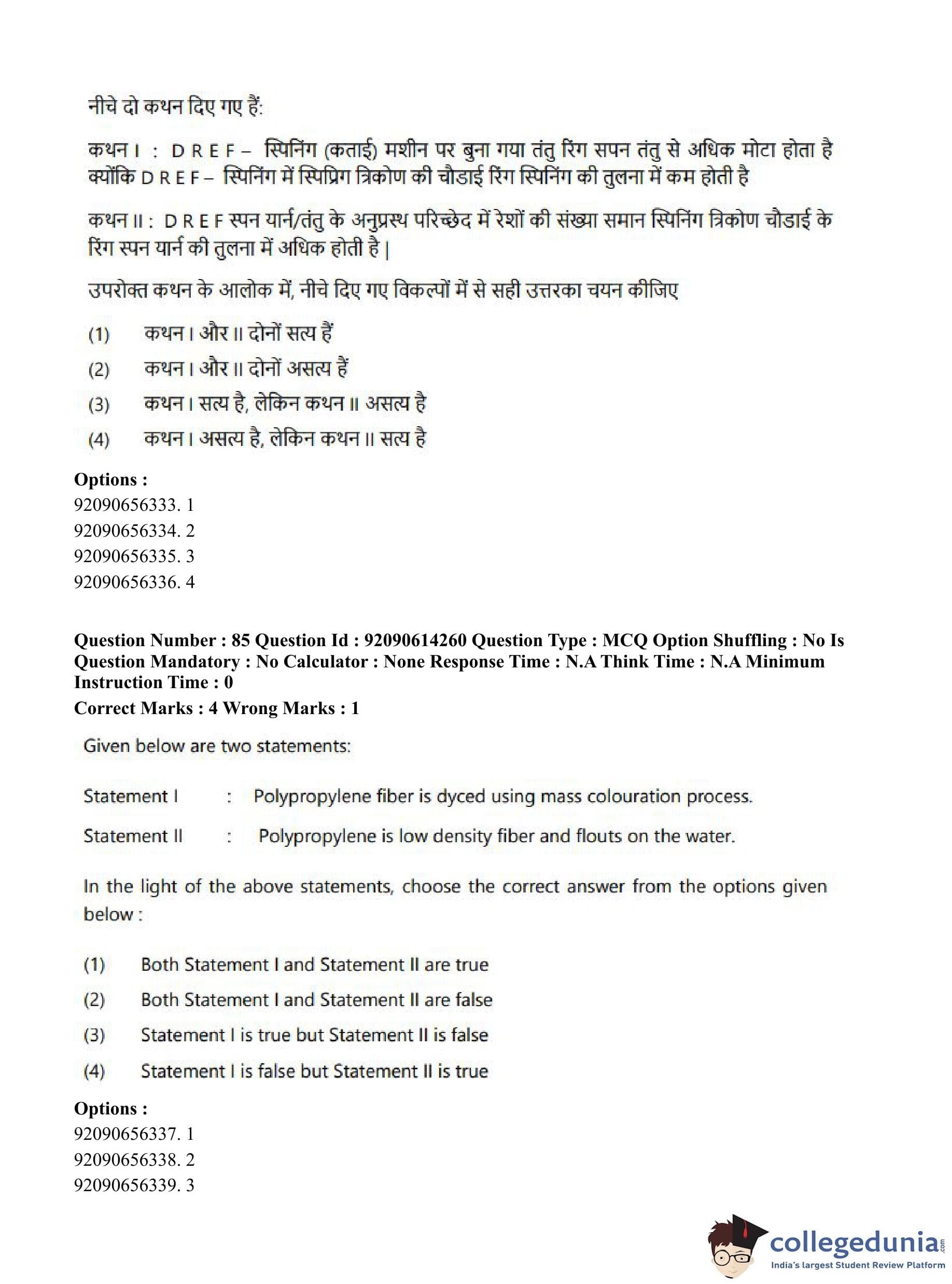 CUET PG 2023 Textile Engineering Question Paper in Hindi (June 12 - Shift 2)