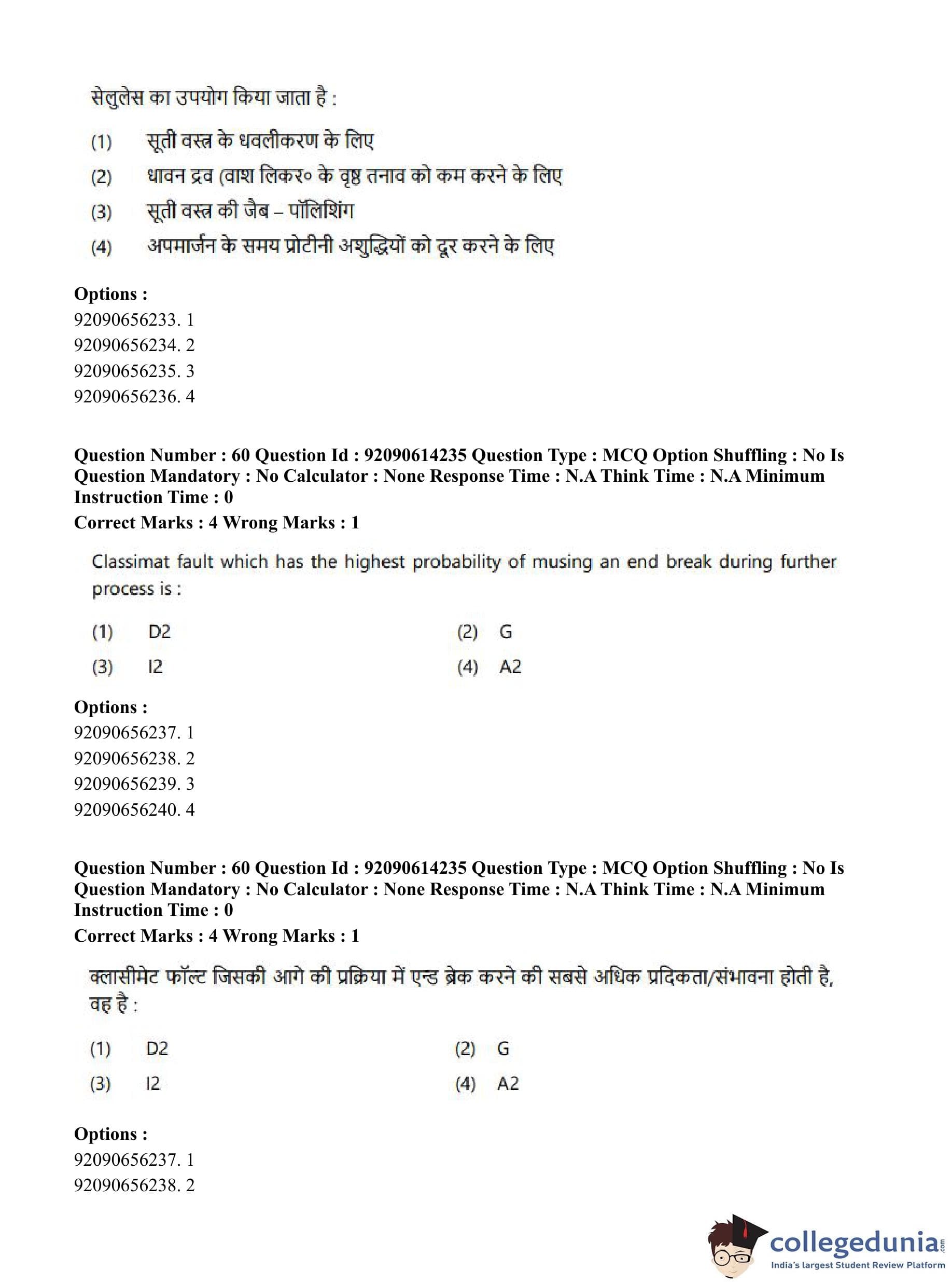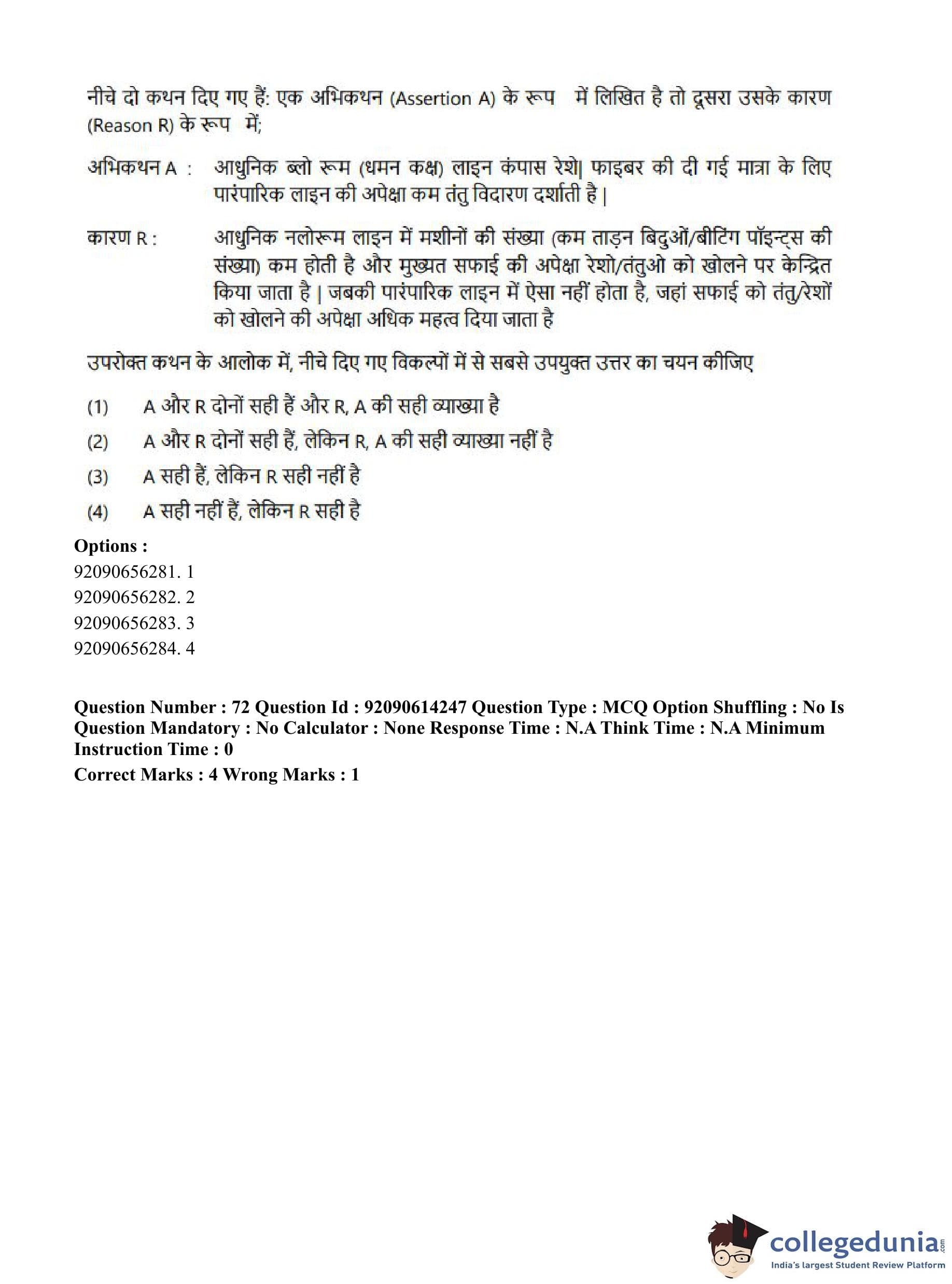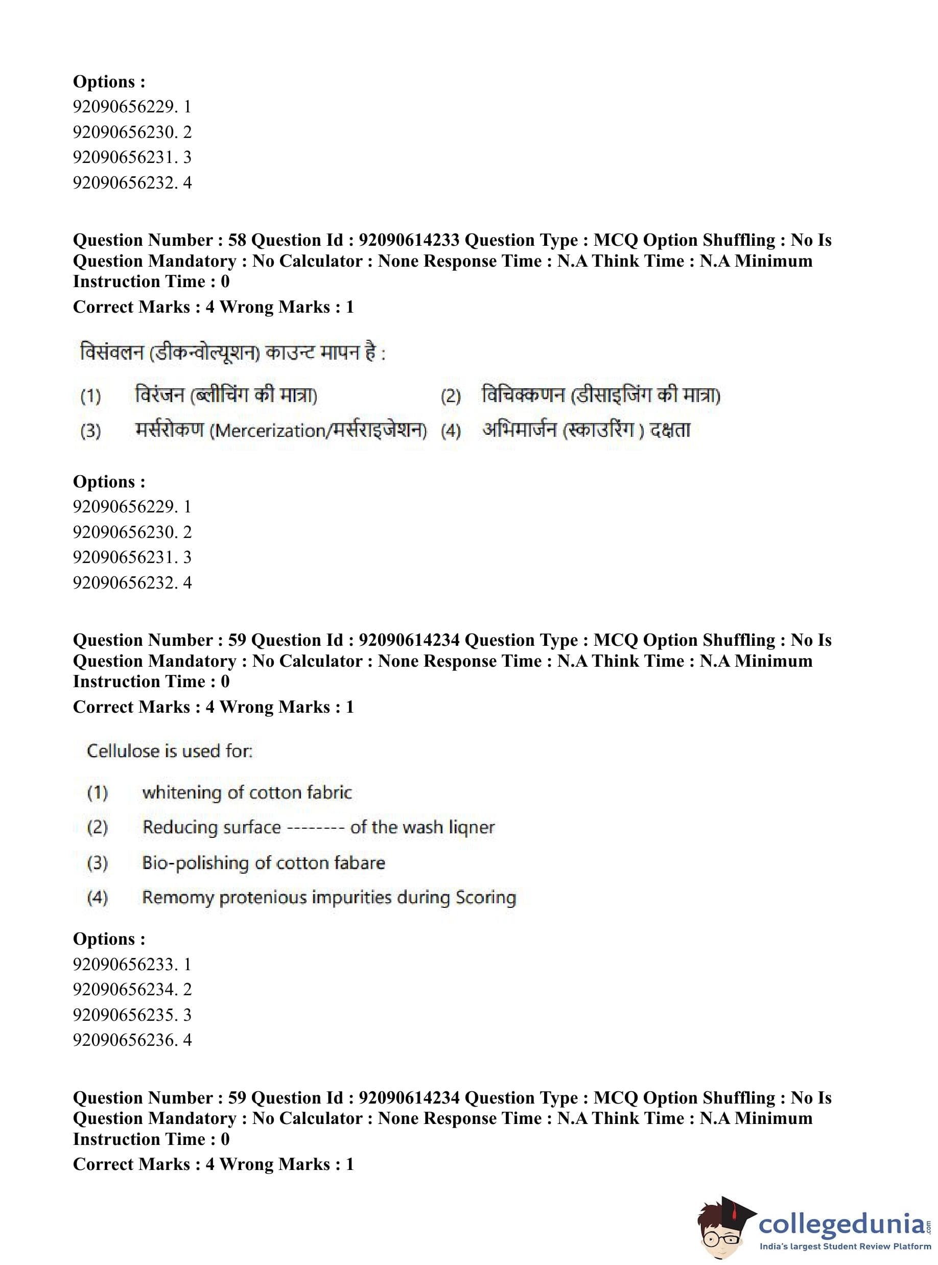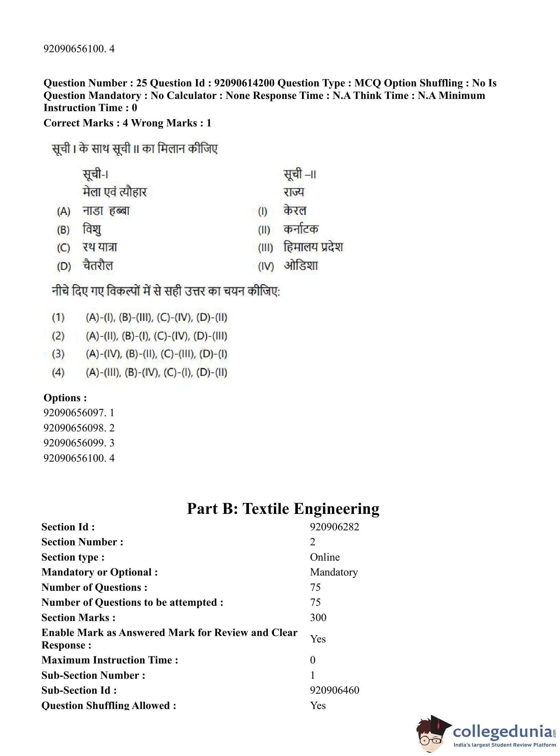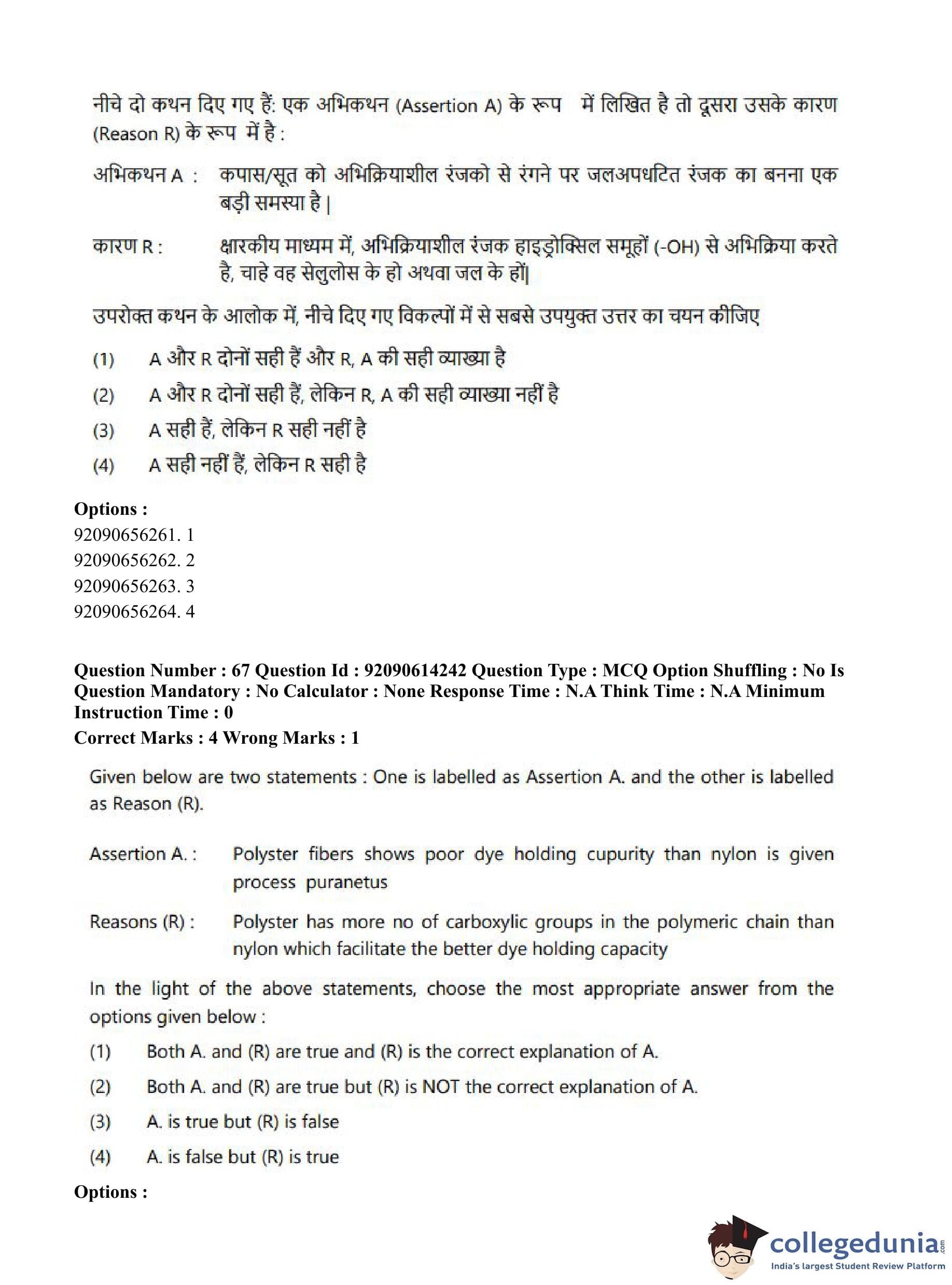 CUET PG 2023 Textile Engineering Question Paper in Hindi (June 12 - Shift 2)