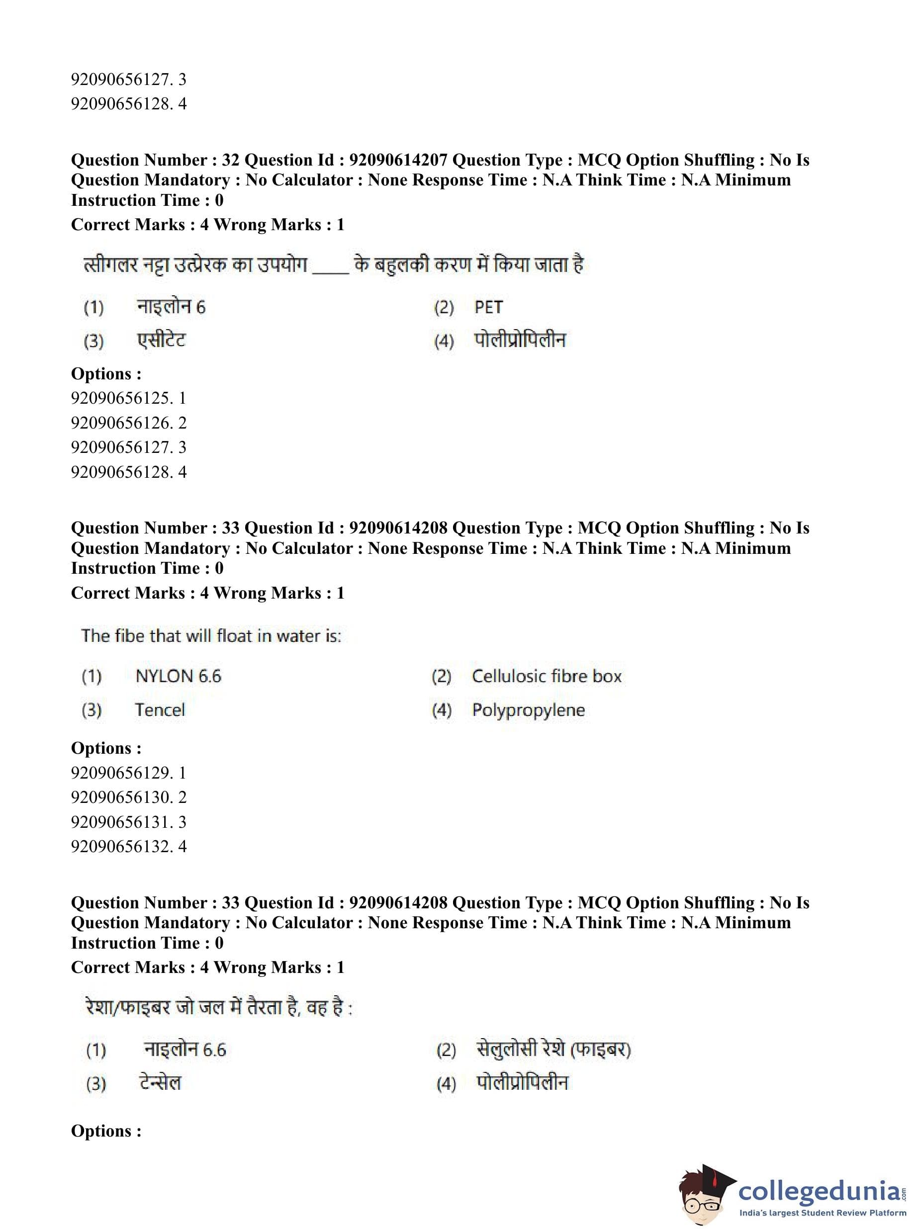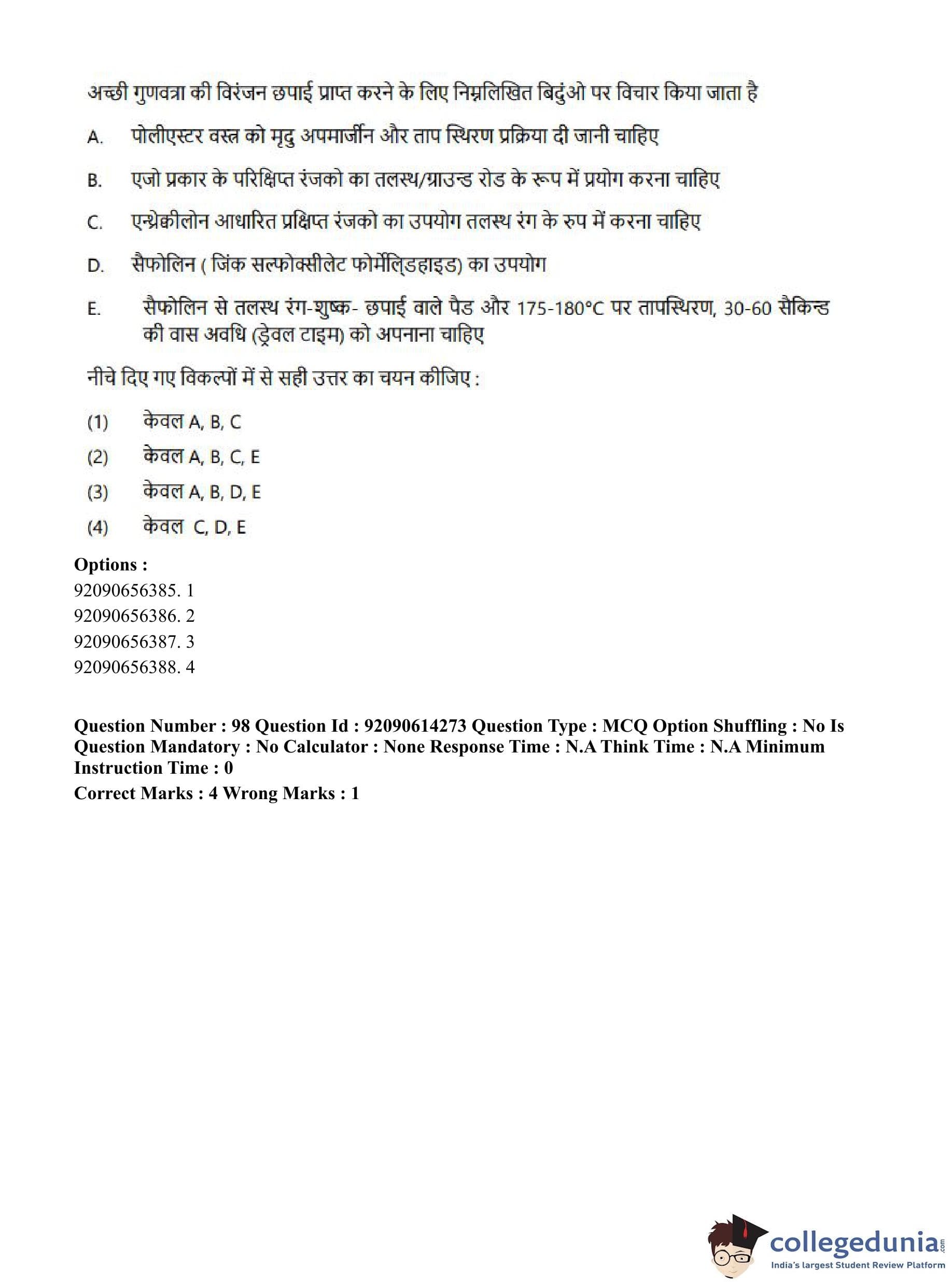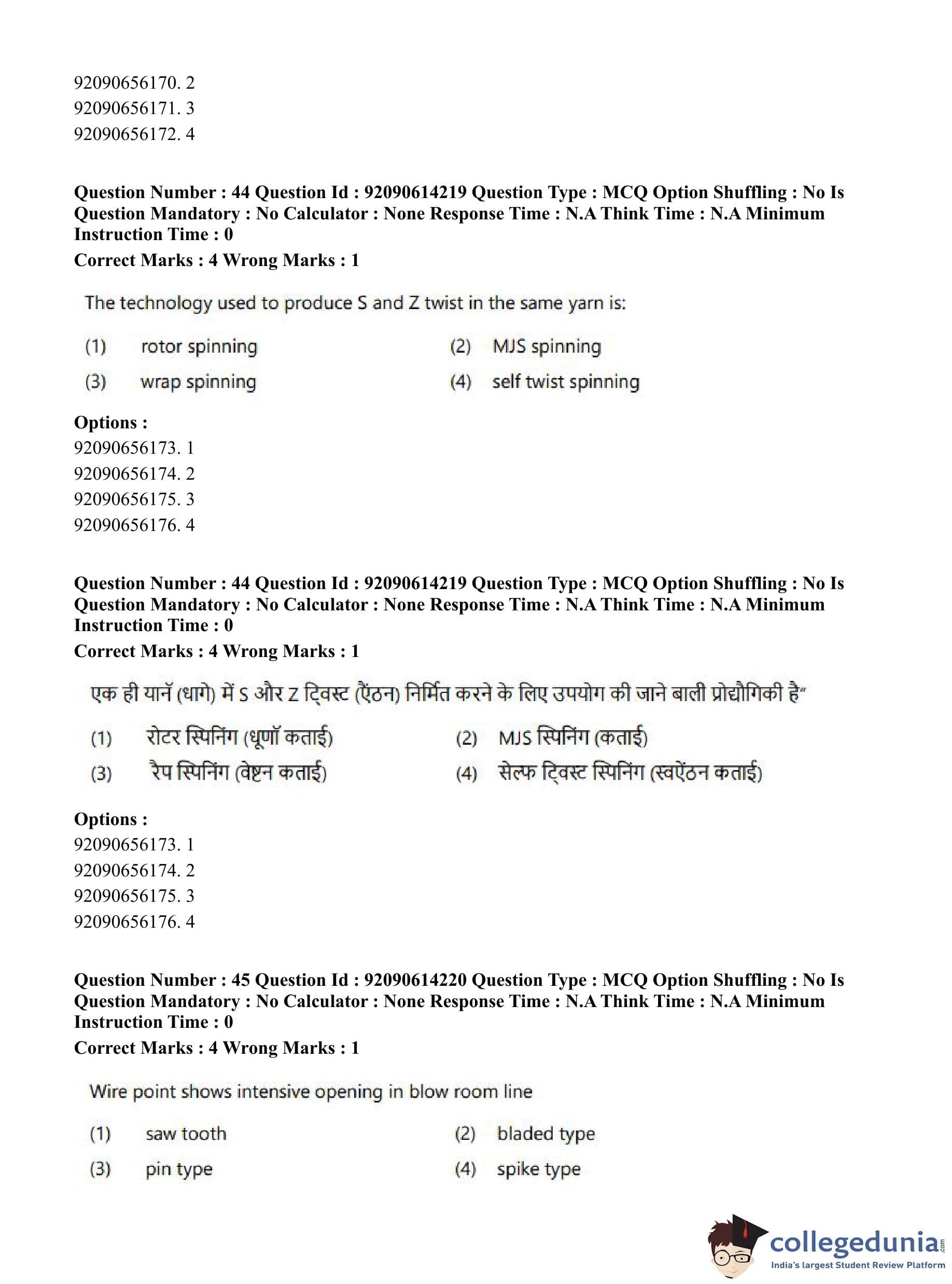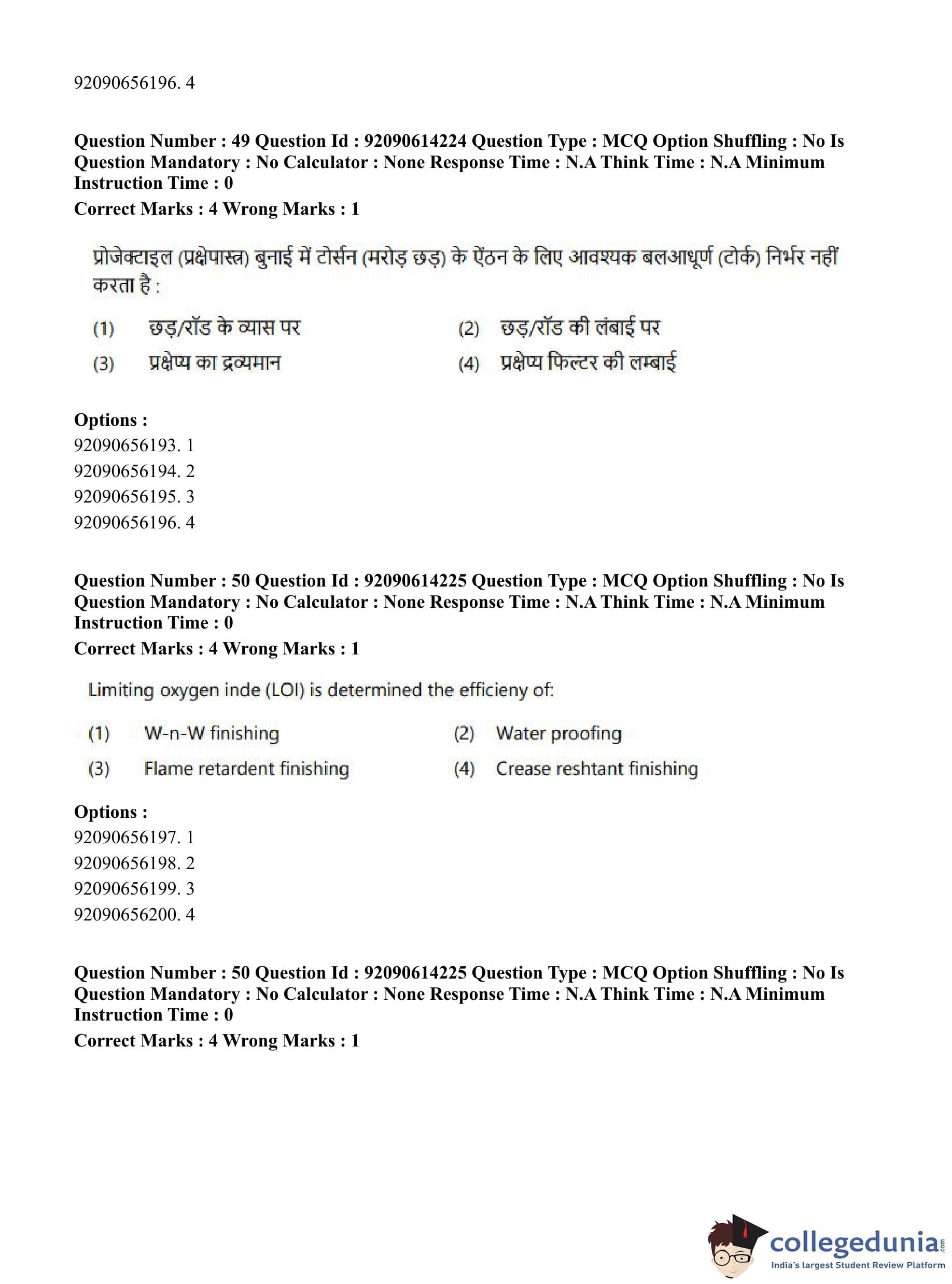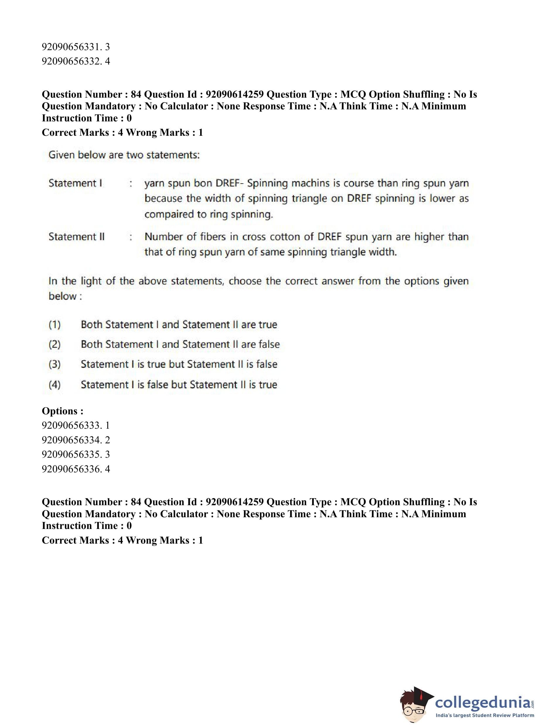 CUET PG 2023 Textile Engineering Question Paper in Hindi (June 12 - Shift 2)