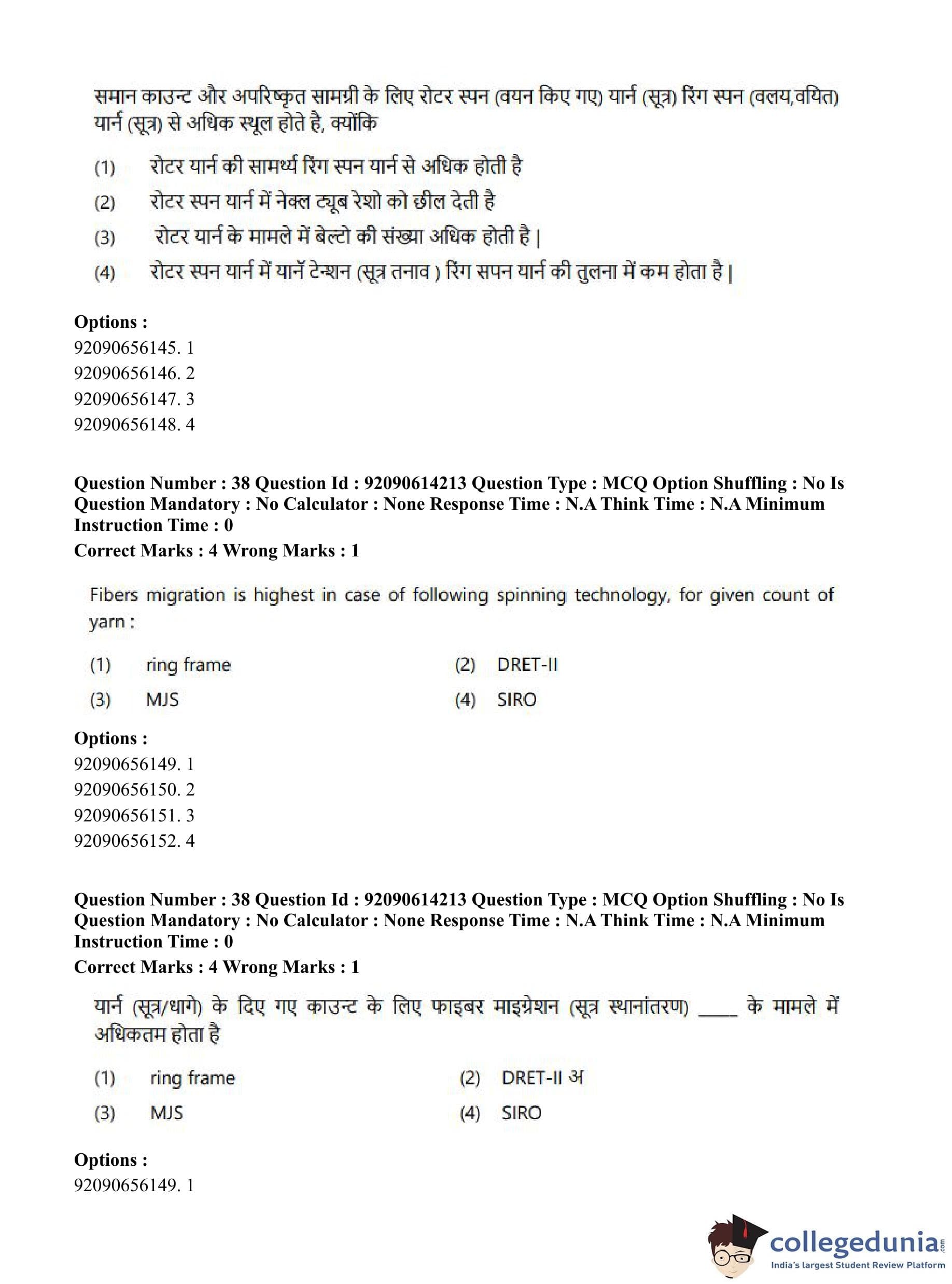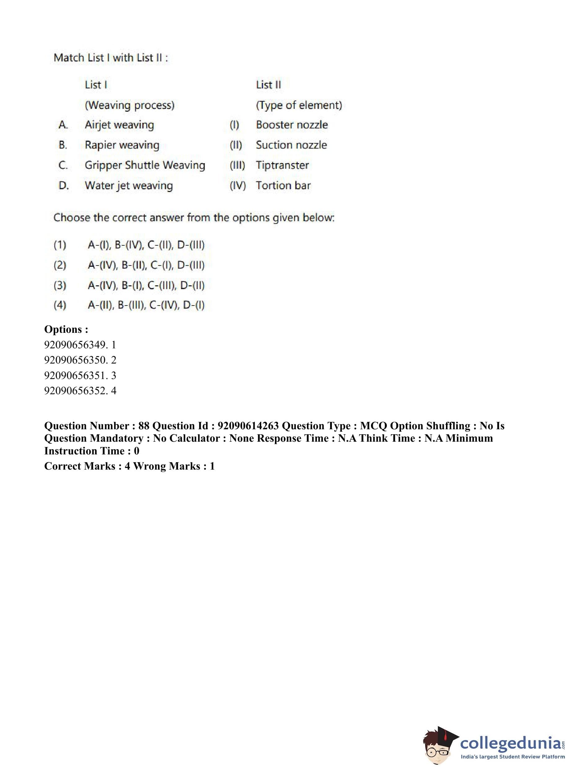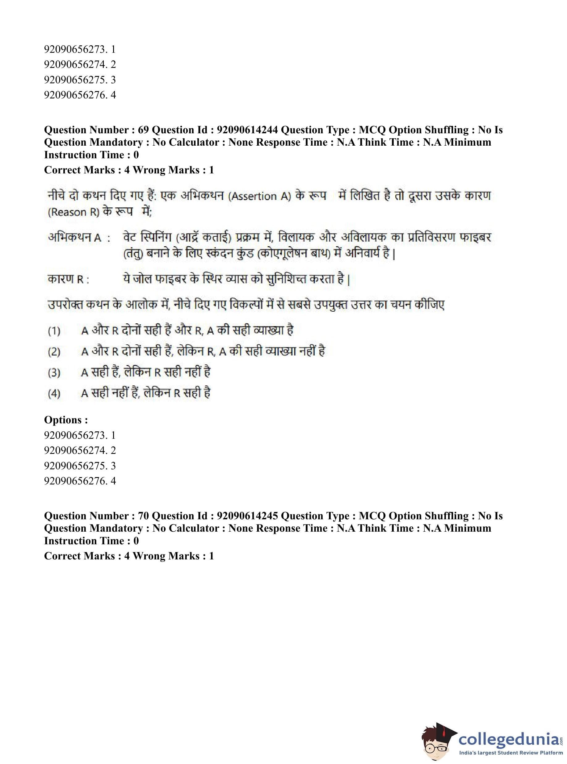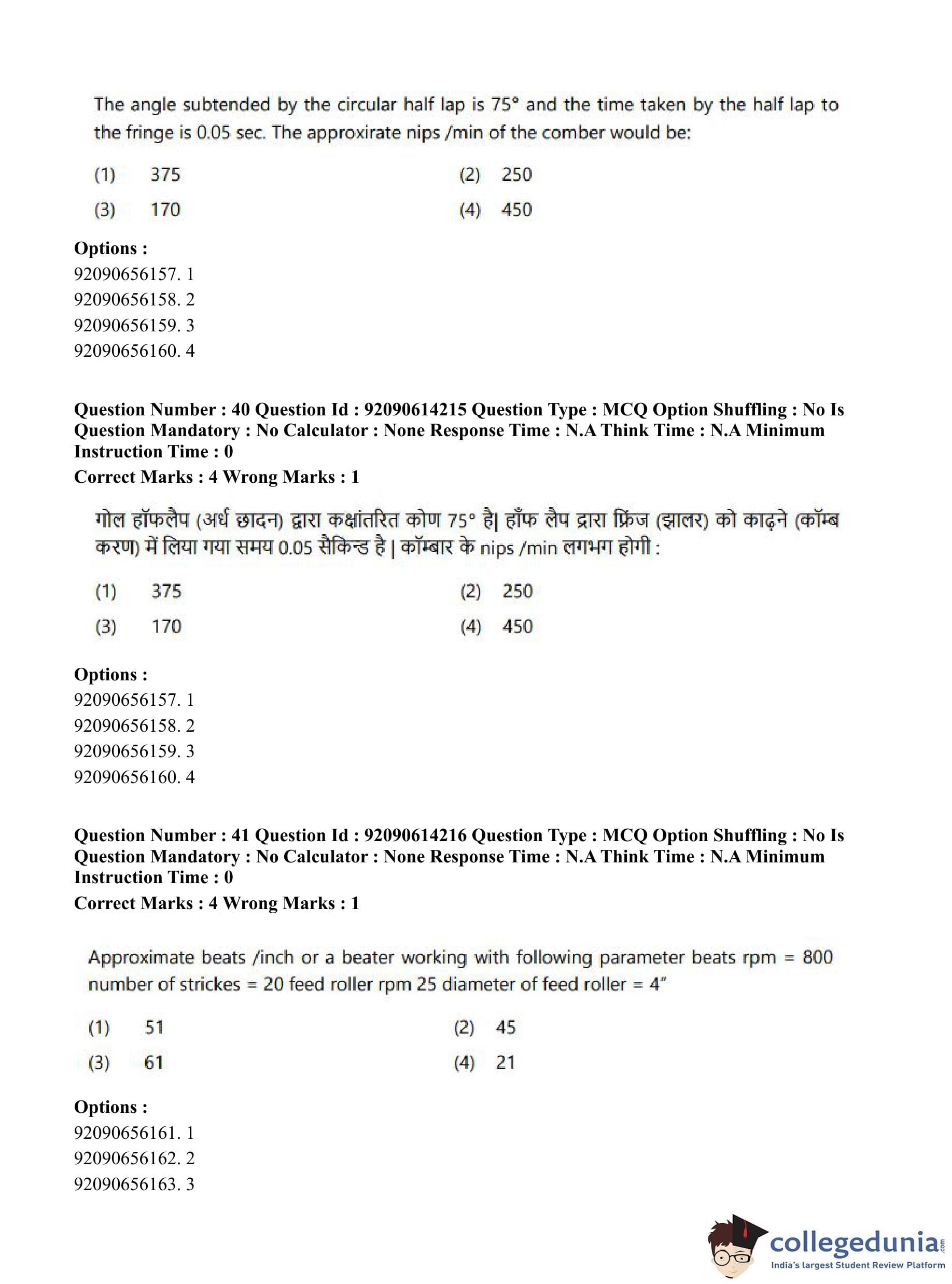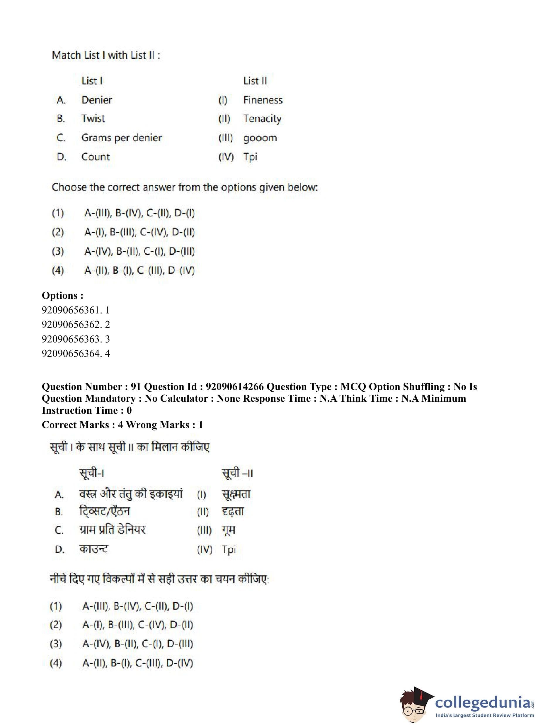 CUET PG 2023 Textile Engineering Question Paper in Hindi (June 12 - Shift 2)