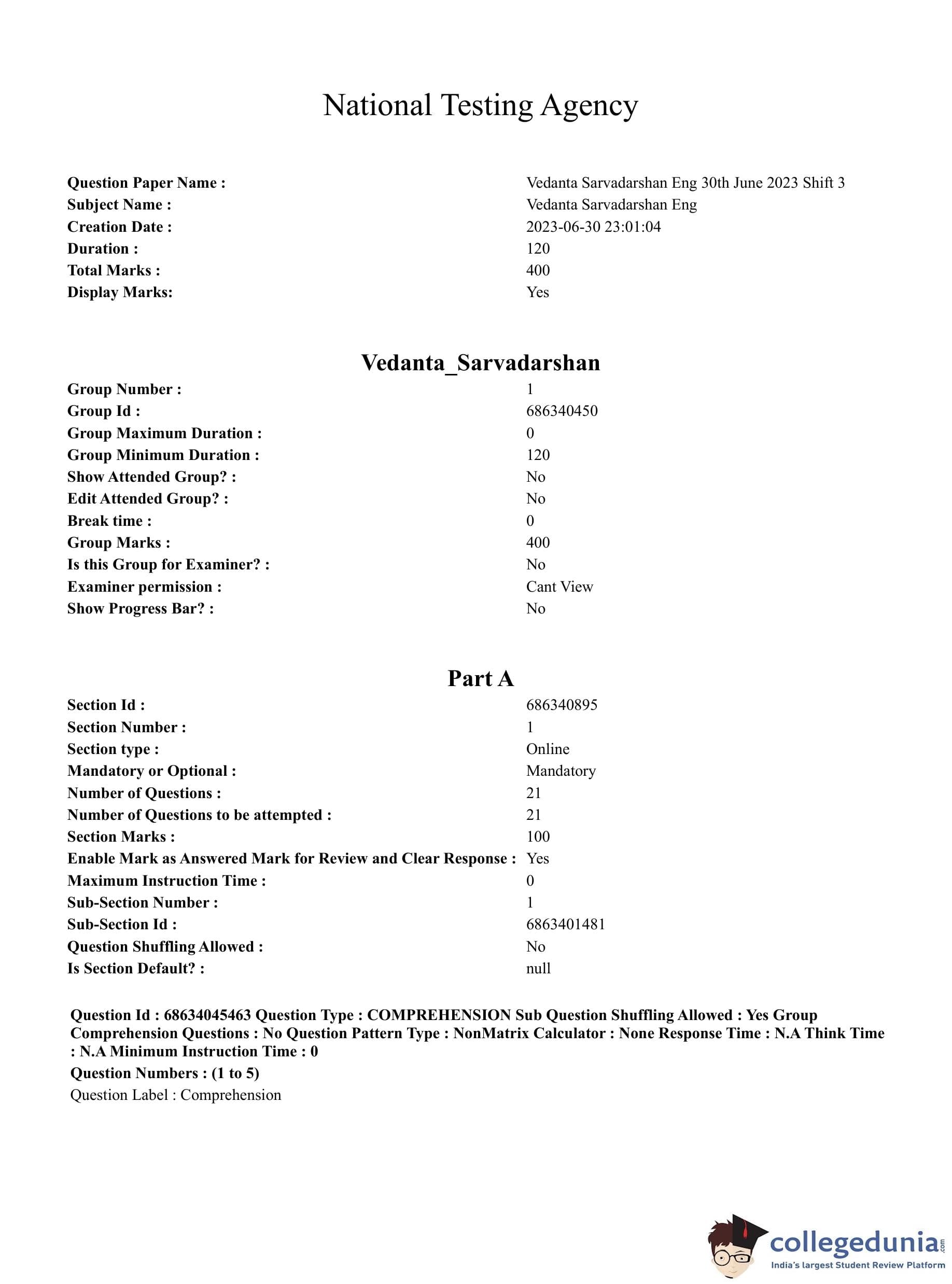 CUET PG 2023 Vedanta, Sarvadarshan, Mimansa,Nyaya Question Paper with Answer Key PDF in English is available for download here. The exam was conducted by National Testing Agency (NTA) on June 30, 2023 in Shift 3. The question paper comprised a total of 100 questions divided into 2 sections.